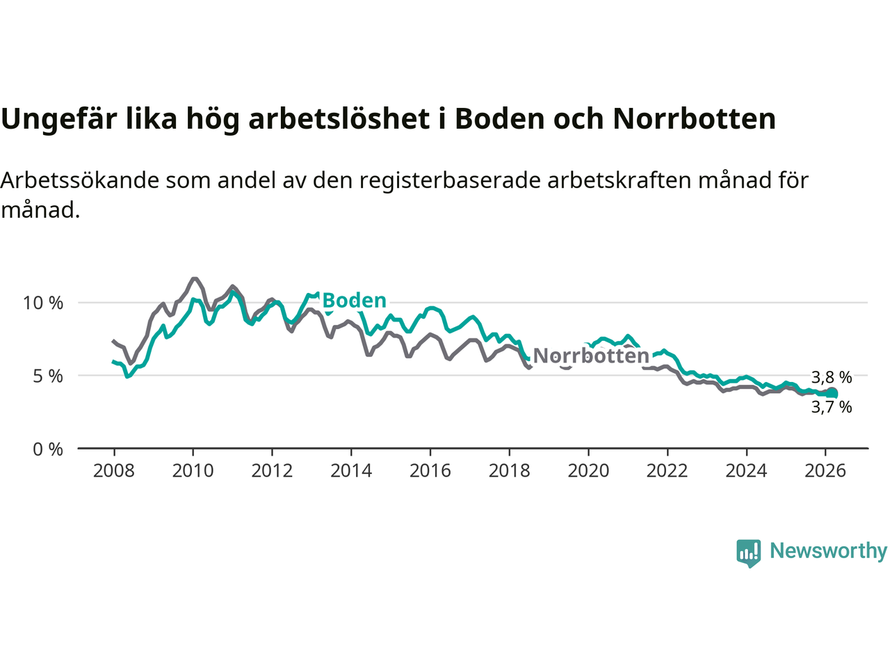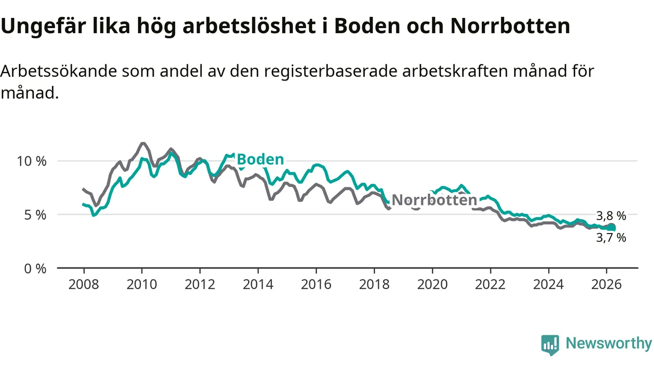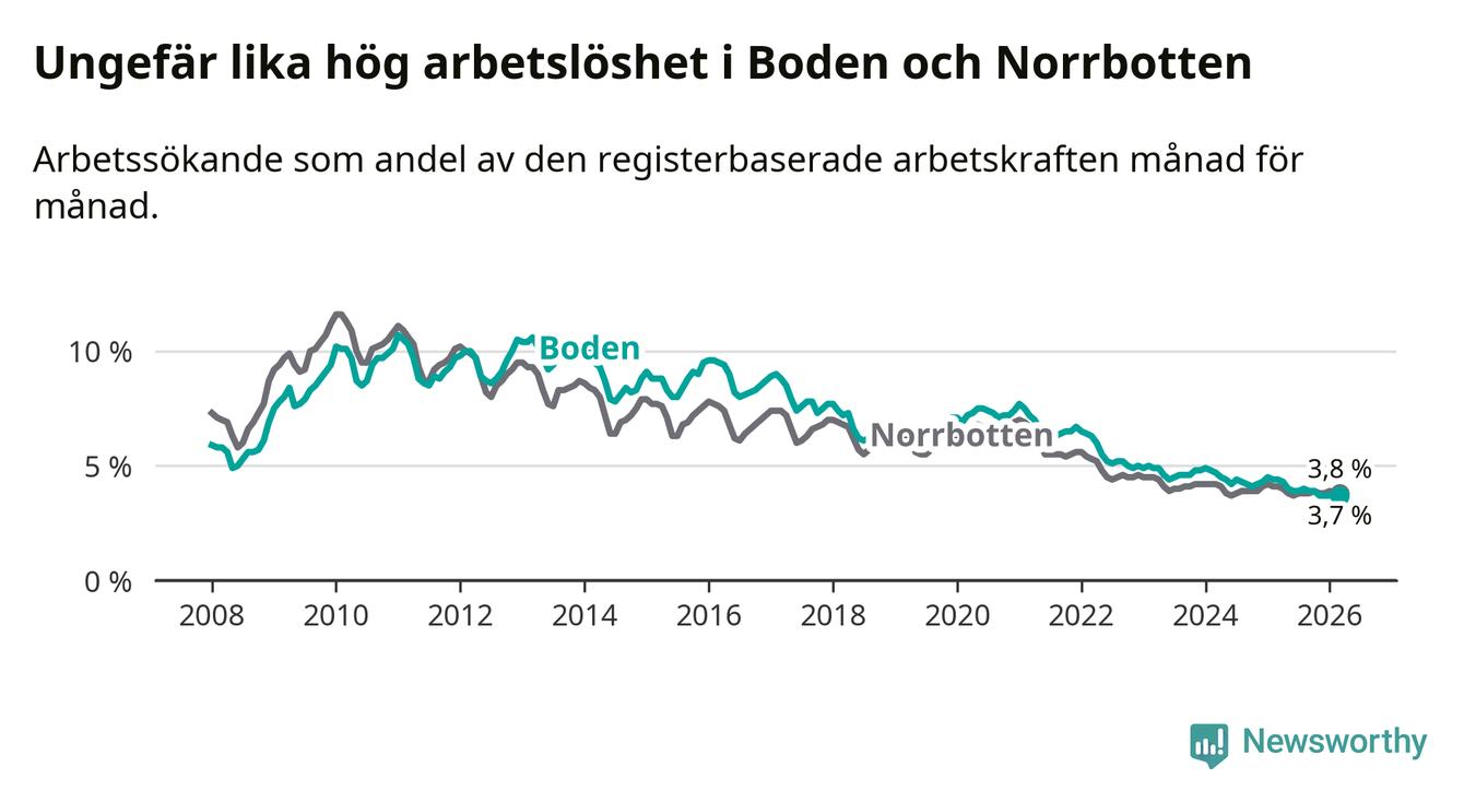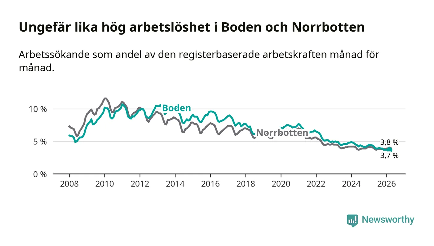 Under mars månad rapporterade Bodens kommun en total arbetslöshet på 3,7 procent. Det är en minskning jämfört med samma tidpunkt i fjol (−0,7 procentenheter). Även i Norrbottens län sjunker arbetslösheten .