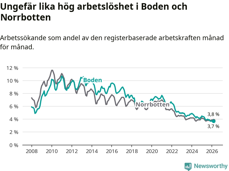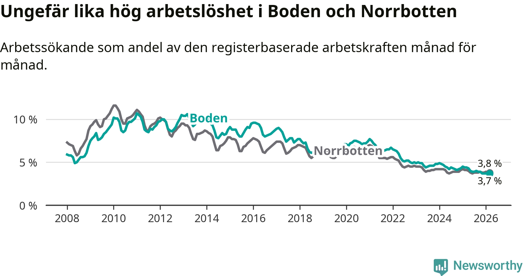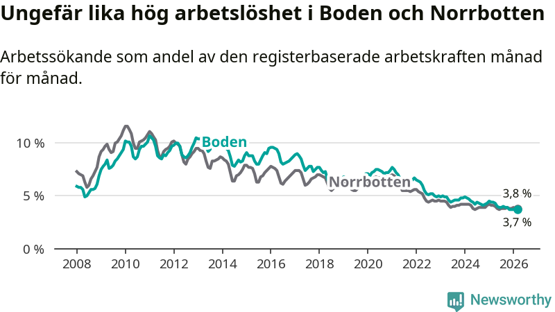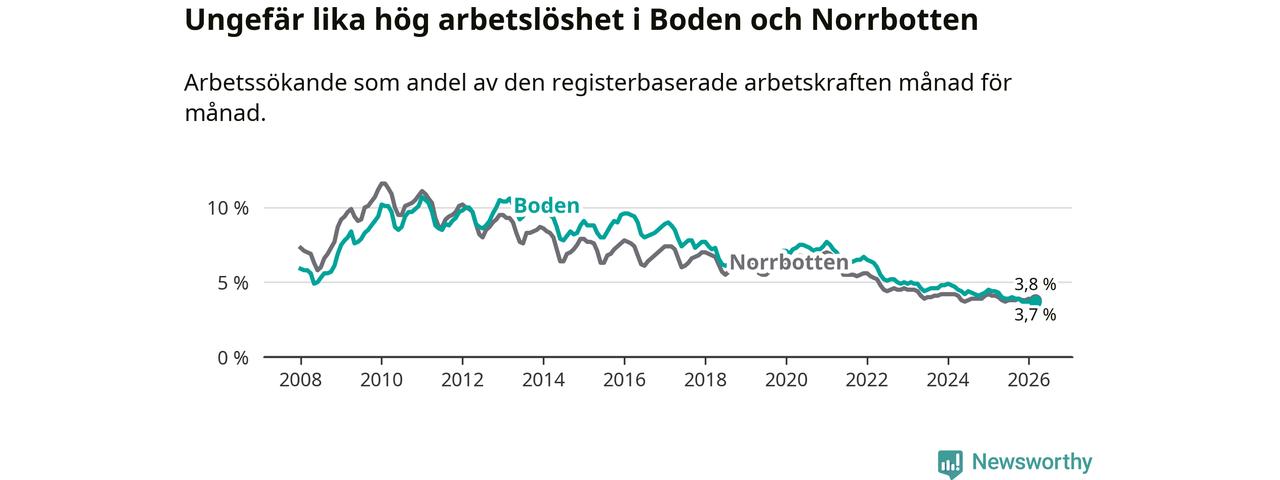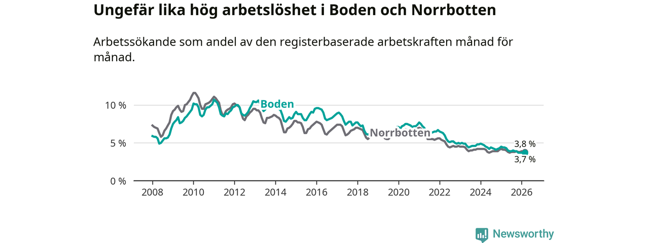 Under mars månad rapporterade Bodens kommun en total arbetslöshet på 3,7 procent. Det är en minskning jämfört med samma tidpunkt i fjol (−0,7 procentenheter). Även i Norrbottens län sjunker arbetslösheten .