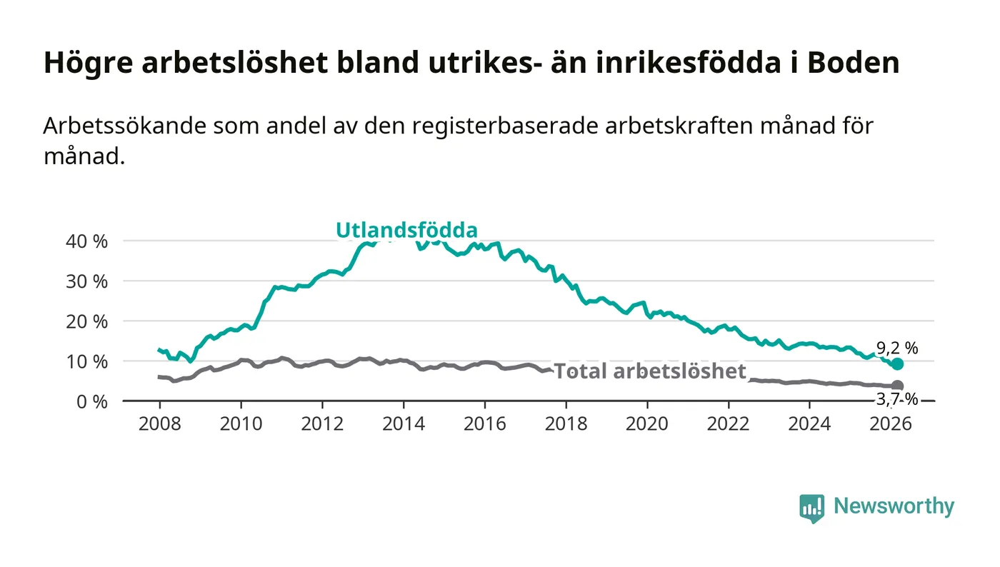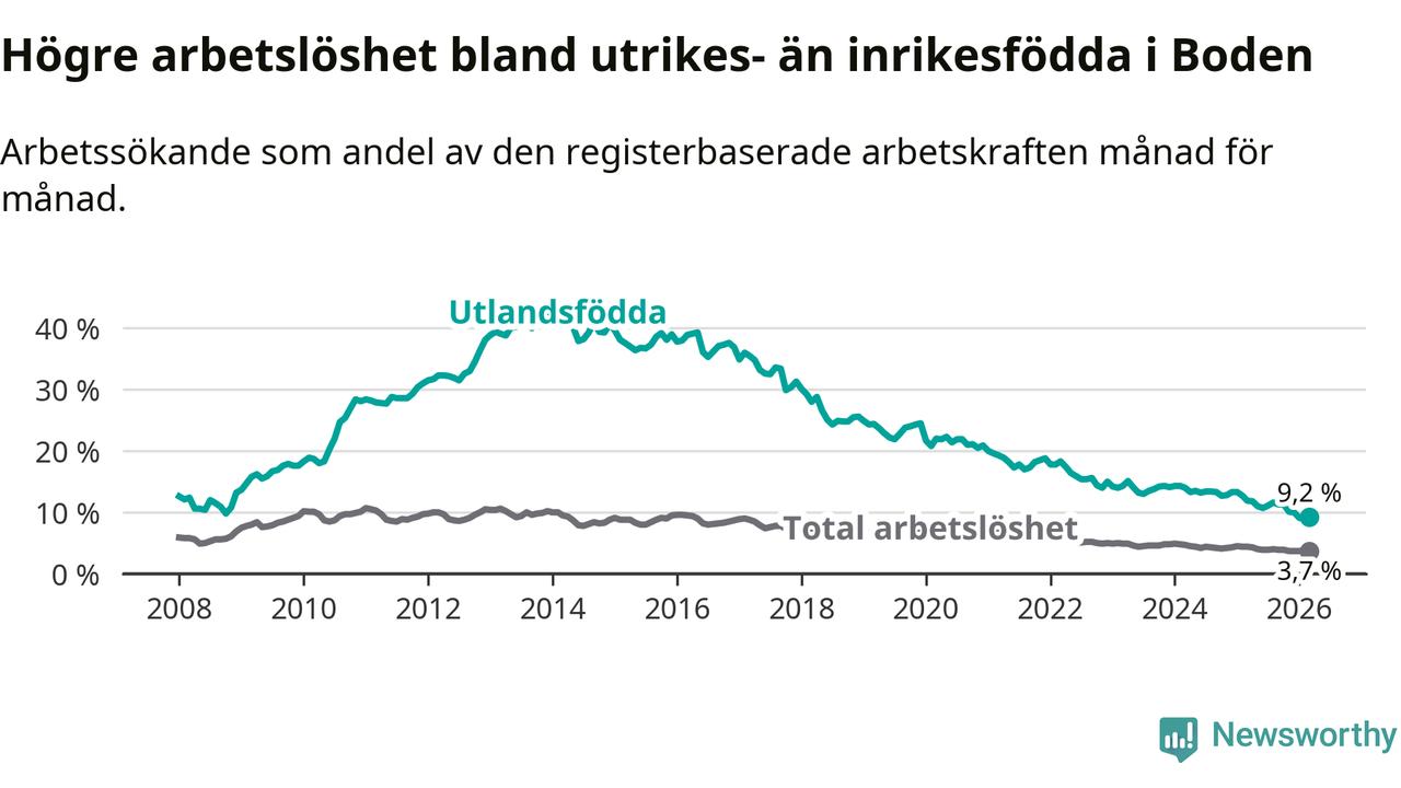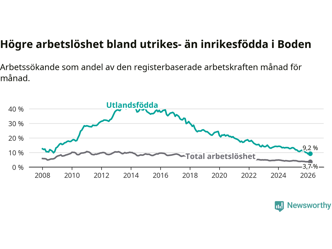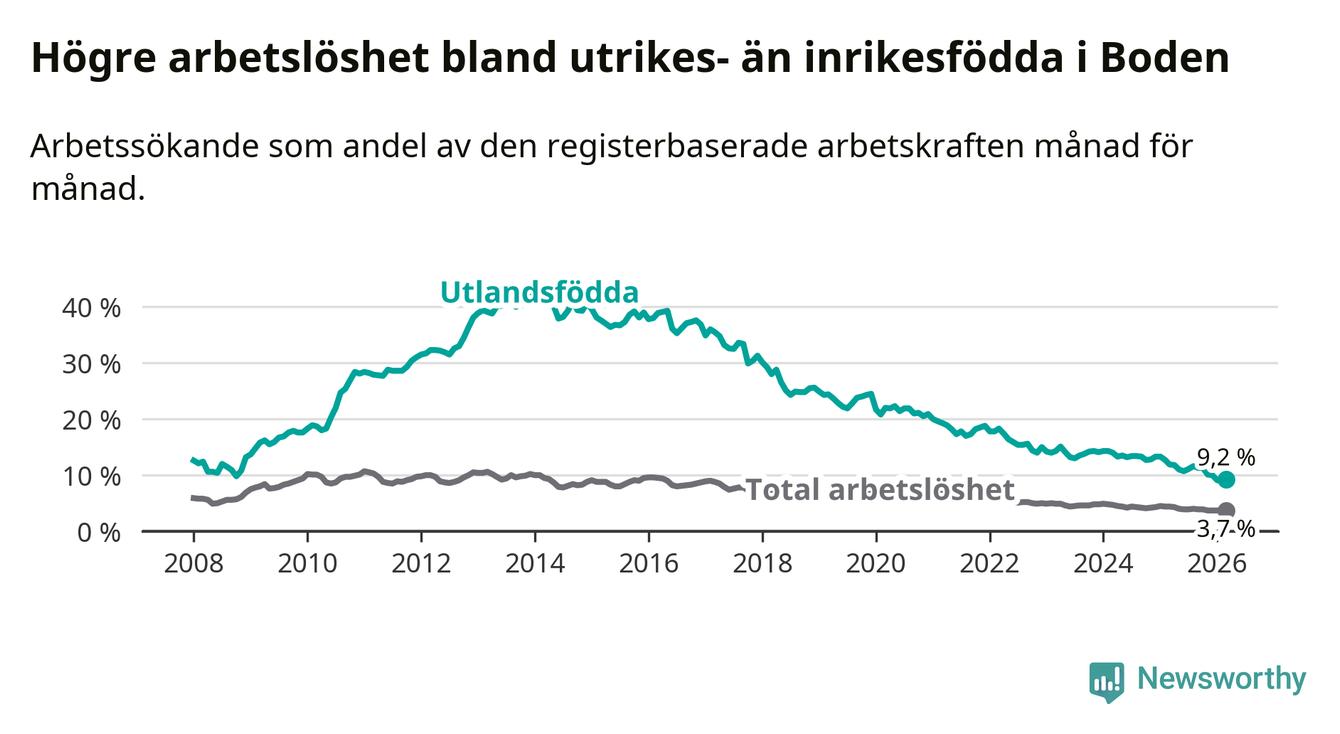 Arbetslösheten bland utlandsfödda var 9,2 procent i Boden under mars månad, motsvarande 206 av 2 239 personer. Det är 2,7 procentenheter färre än vid samma tidpunkt i fjol (−23 om man räknar personer). Därmed är de utlandsföddas arbetslöshet lägre än vid samma tidpunkt i fjol för 20:e månaden i följd. Sedan juli 2024 har arbetslösheten bland utlandsfödda minskat från 13,4 till 9,2 procent.