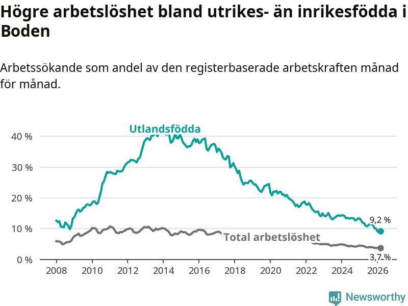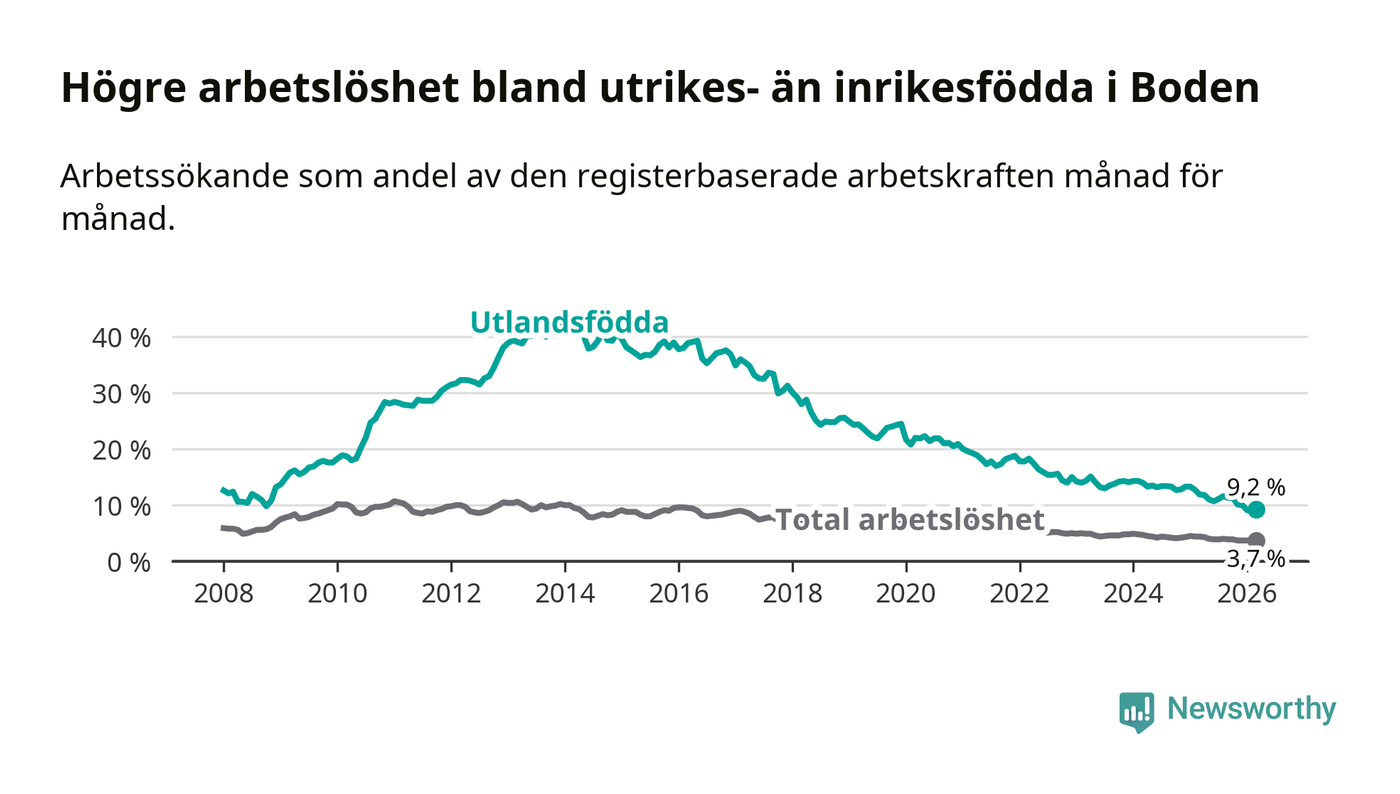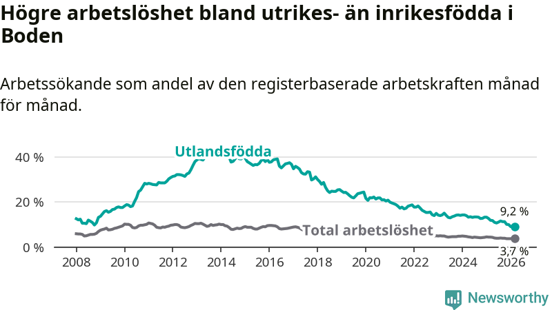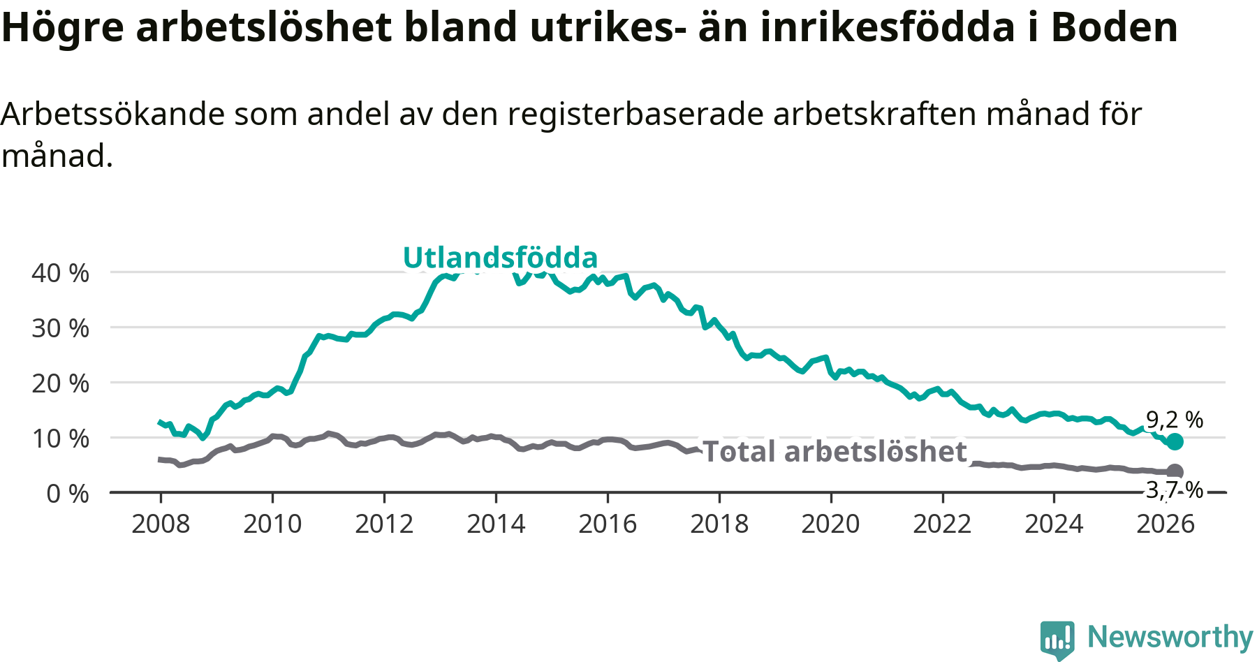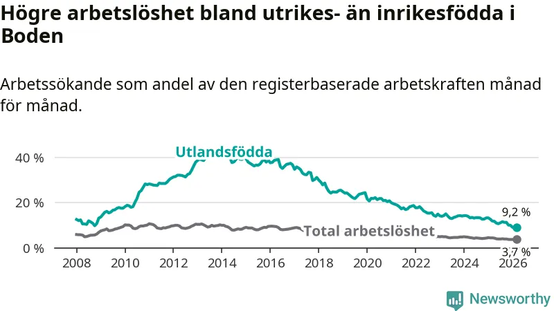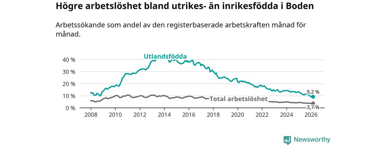 Arbetslösheten bland utlandsfödda var 9,2 procent i Boden under mars månad, motsvarande 206 av 2 239 personer. Det är 2,7 procentenheter färre än vid samma tidpunkt i fjol (−23 om man räknar personer). Därmed är de utlandsföddas arbetslöshet lägre än vid samma tidpunkt i fjol för 20:e månaden i följd. Sedan juli 2024 har arbetslösheten bland utlandsfödda minskat från 13,4 till 9,2 procent.