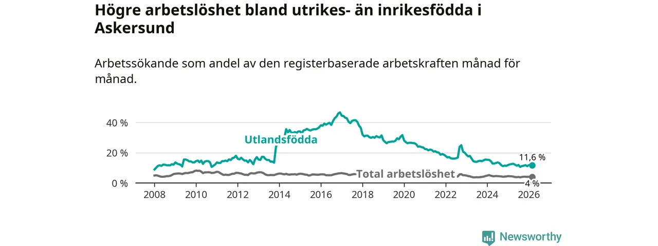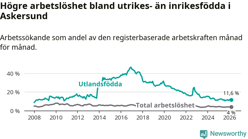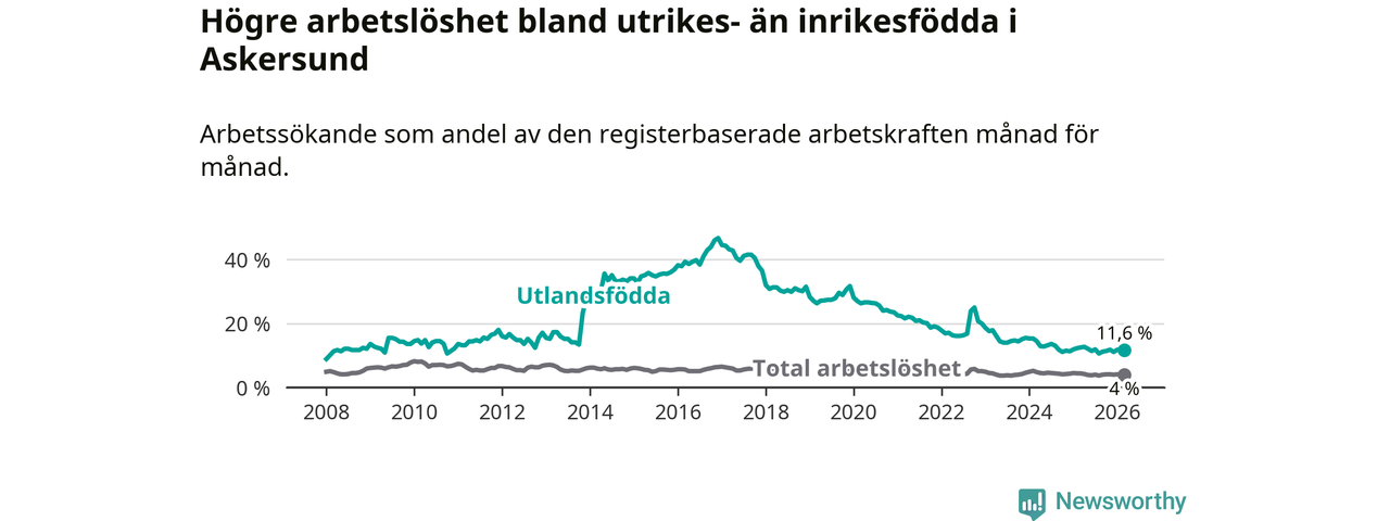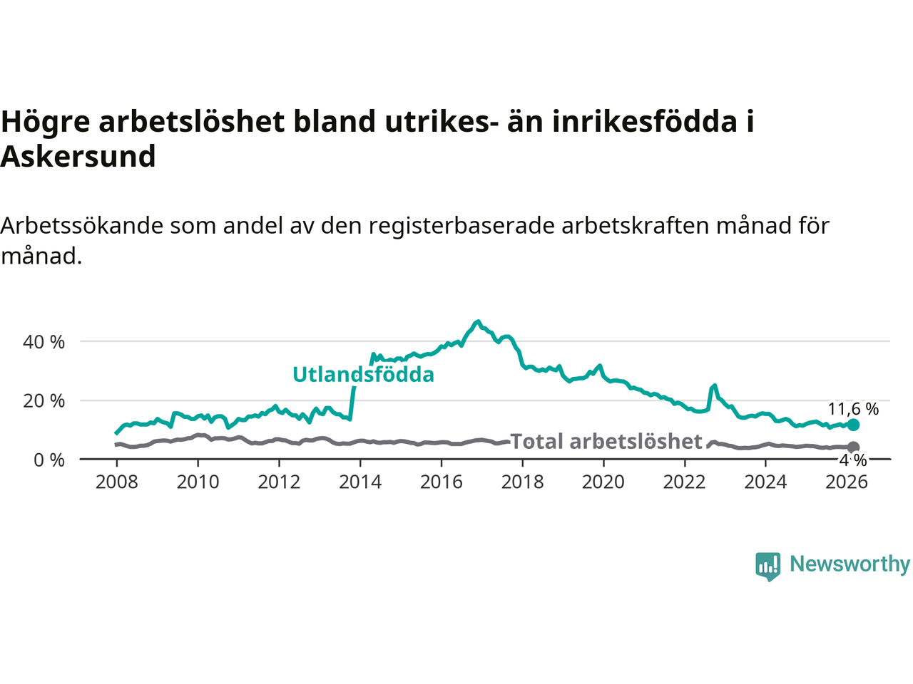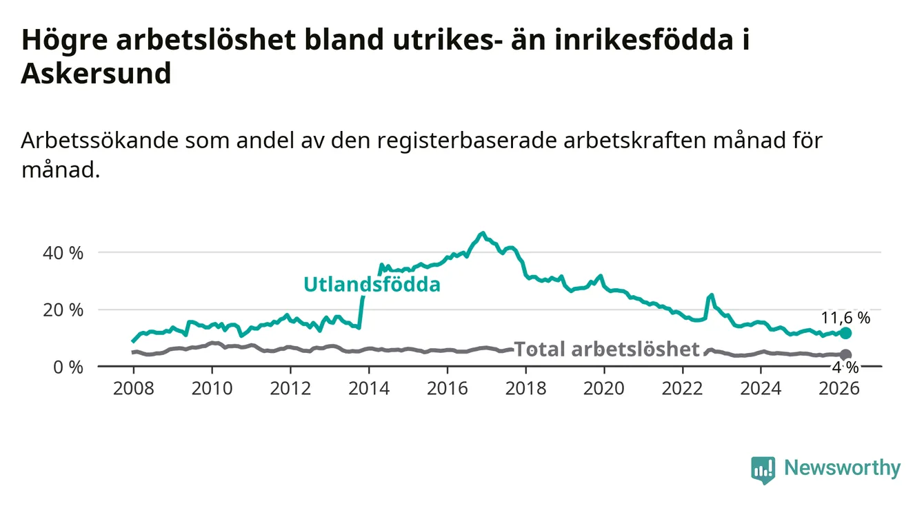 Skillnaden i arbetslöshet mellan utrikesfödda och hela befolkningen är 7,6 procentenheter i Askersund. Det är en mindre skillnad än för ett år sedan (−0,5 procentenheter).