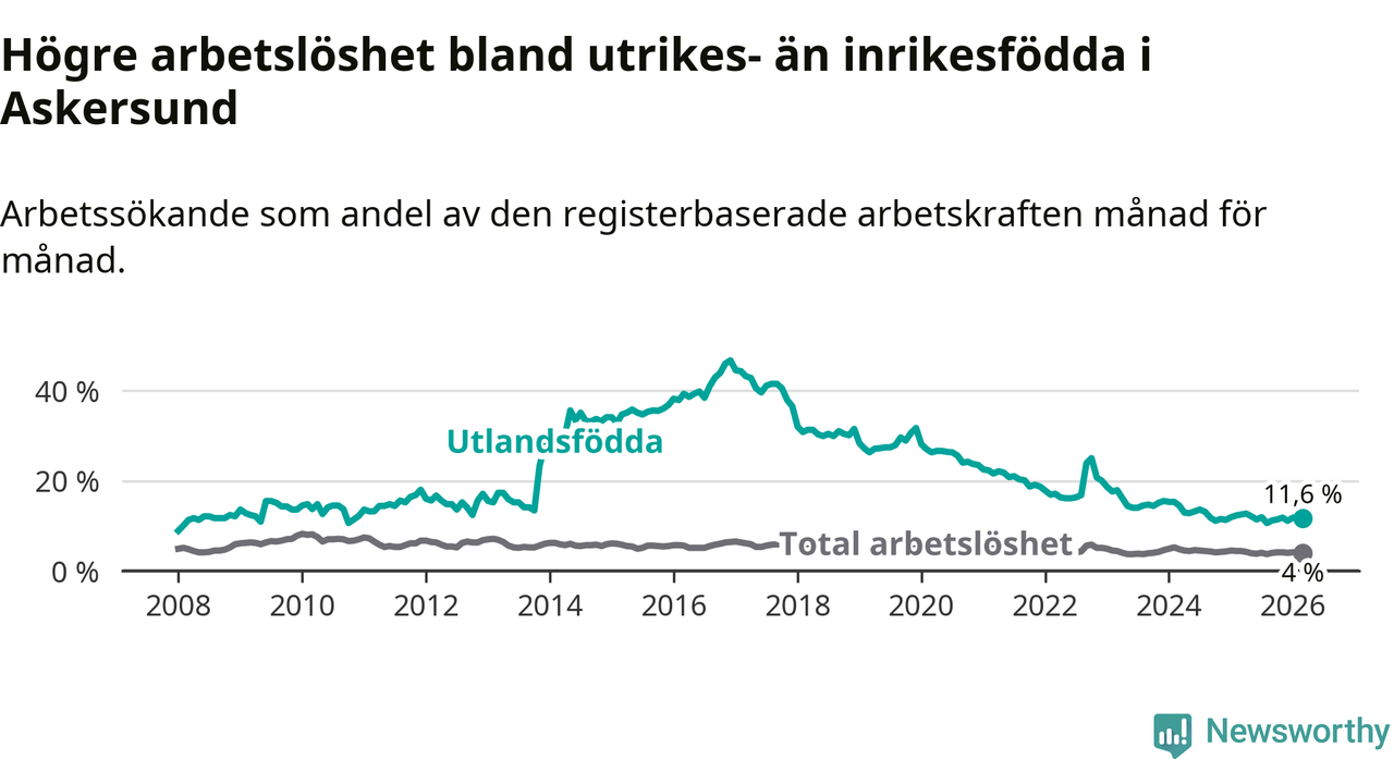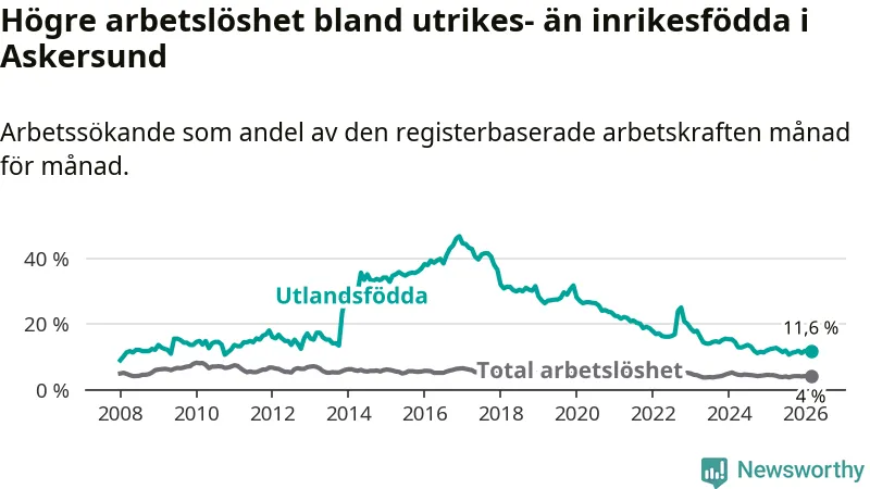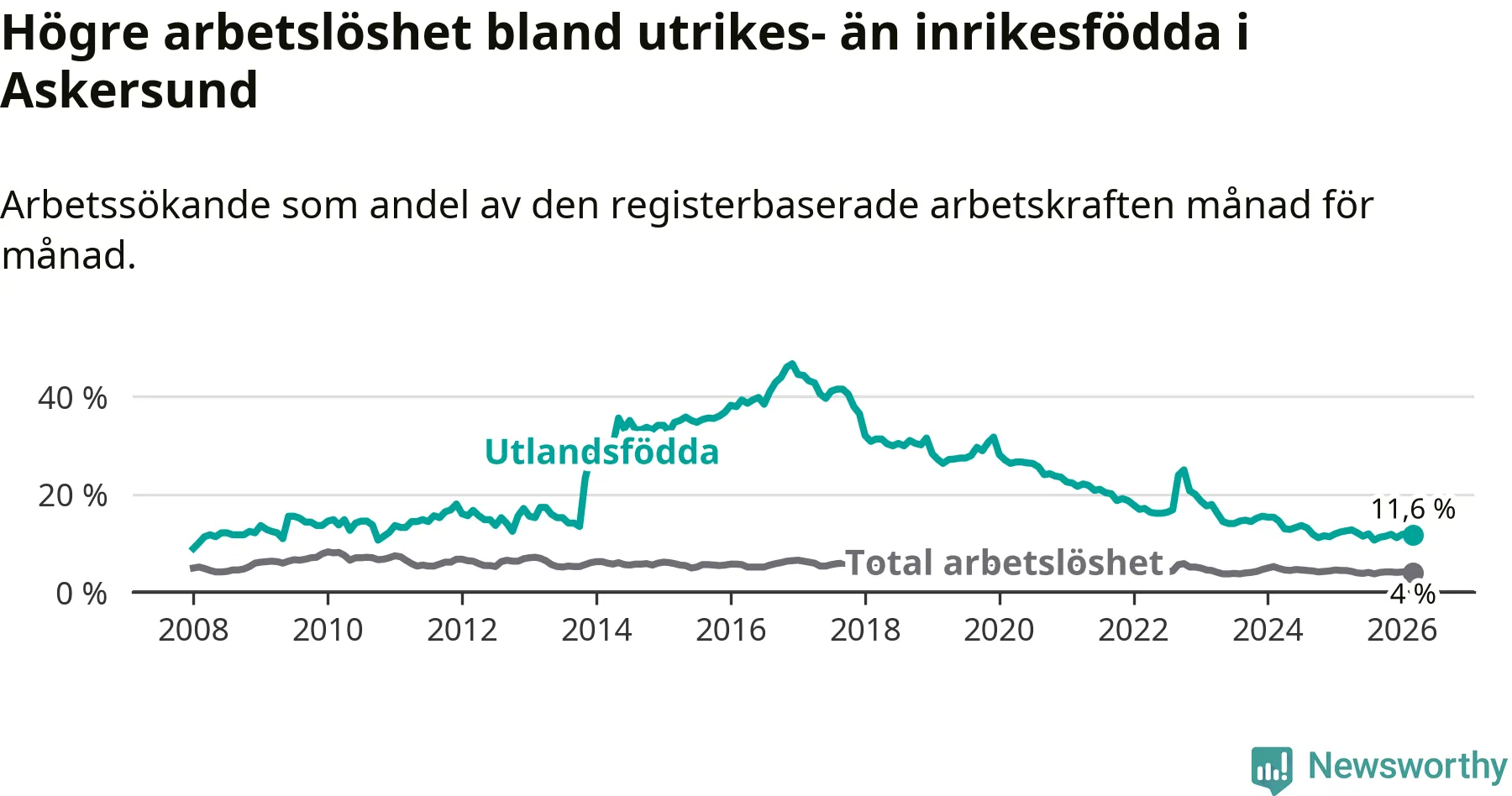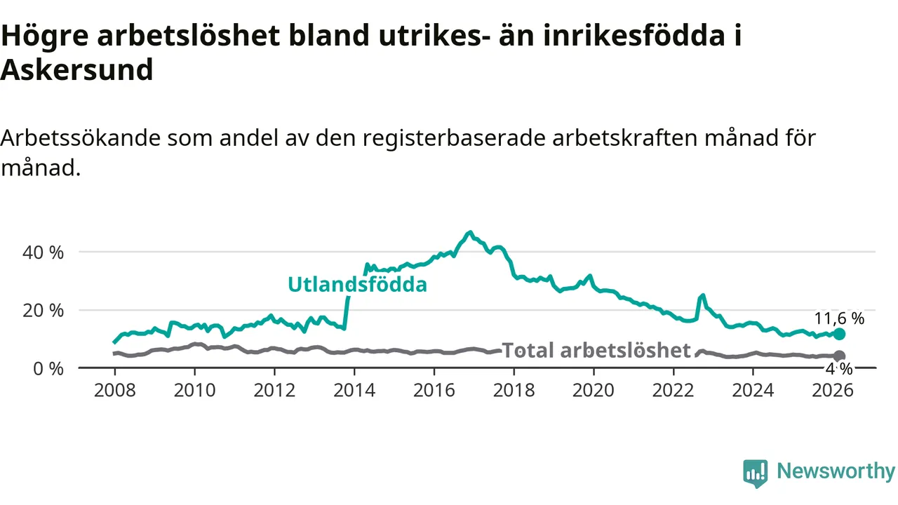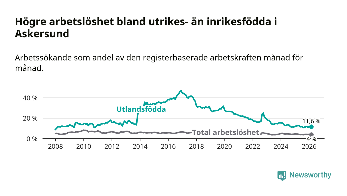 Skillnaden i arbetslöshet mellan utrikesfödda och hela befolkningen är 7,6 procentenheter i Askersund. Det är en mindre skillnad än för ett år sedan (−0,5 procentenheter).