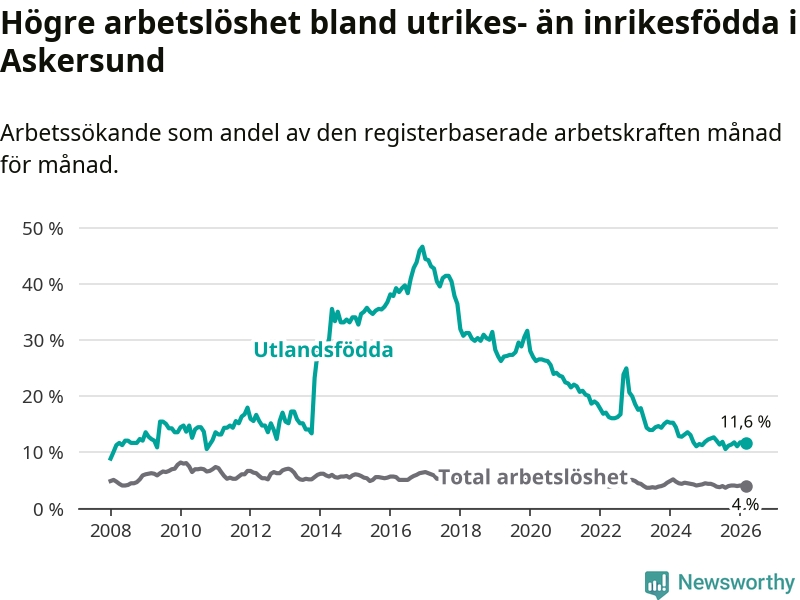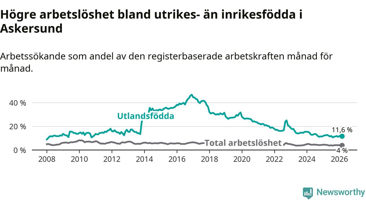 Arbetslösheten bland utlandsfödda var 11,6 procent i Askersund under mars månad, motsvarande 64 av 552 personer. Det är 0,9 procentenheter färre än vid samma tidpunkt i fjol (−5 om man räknar personer).