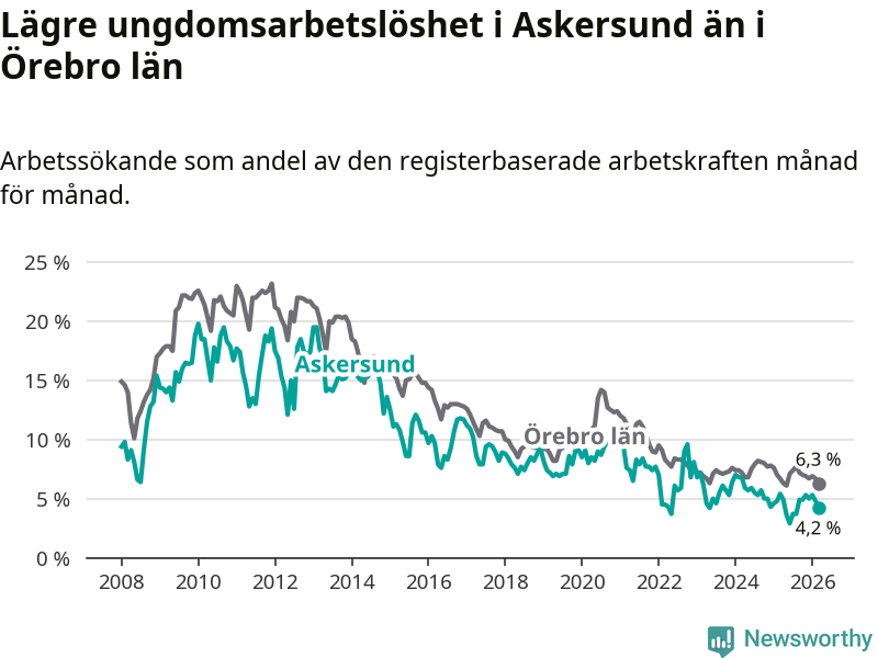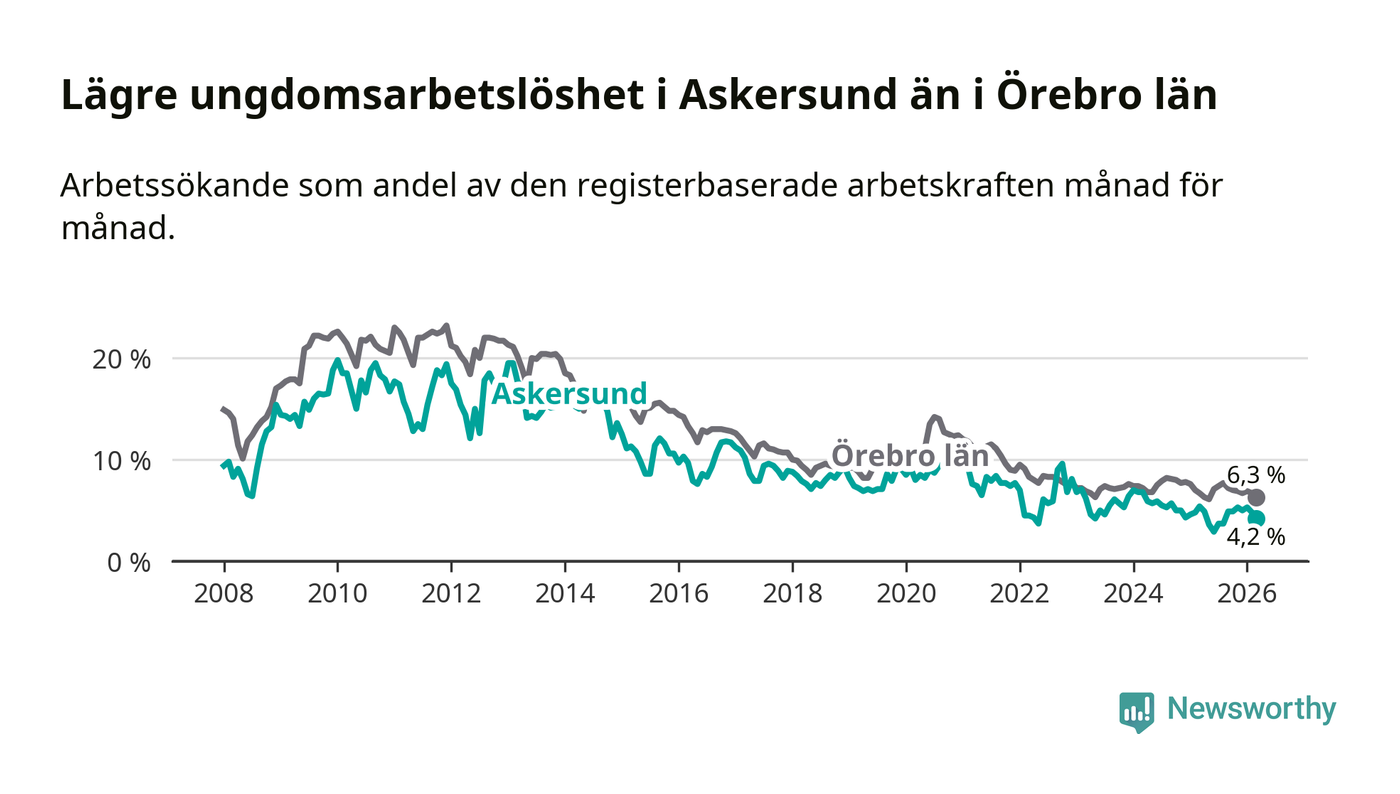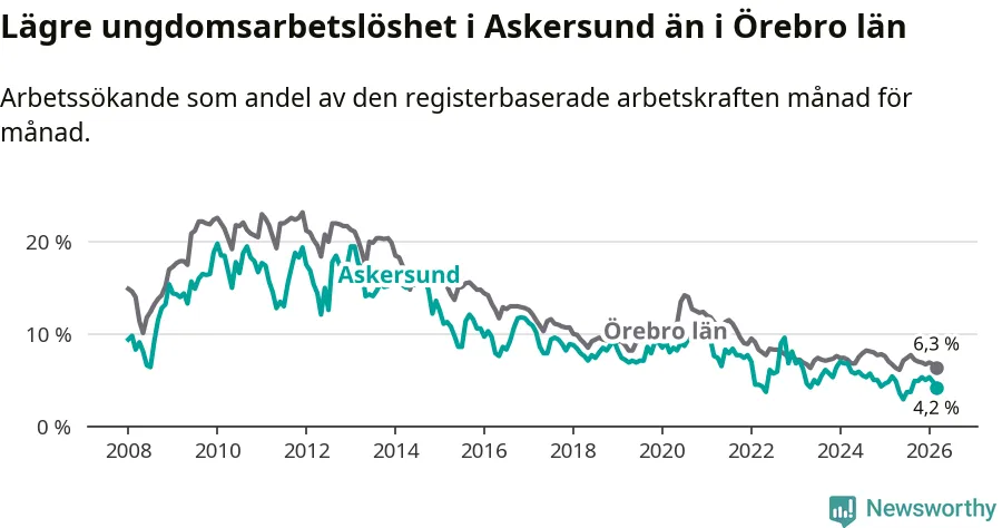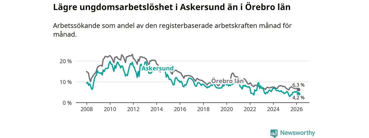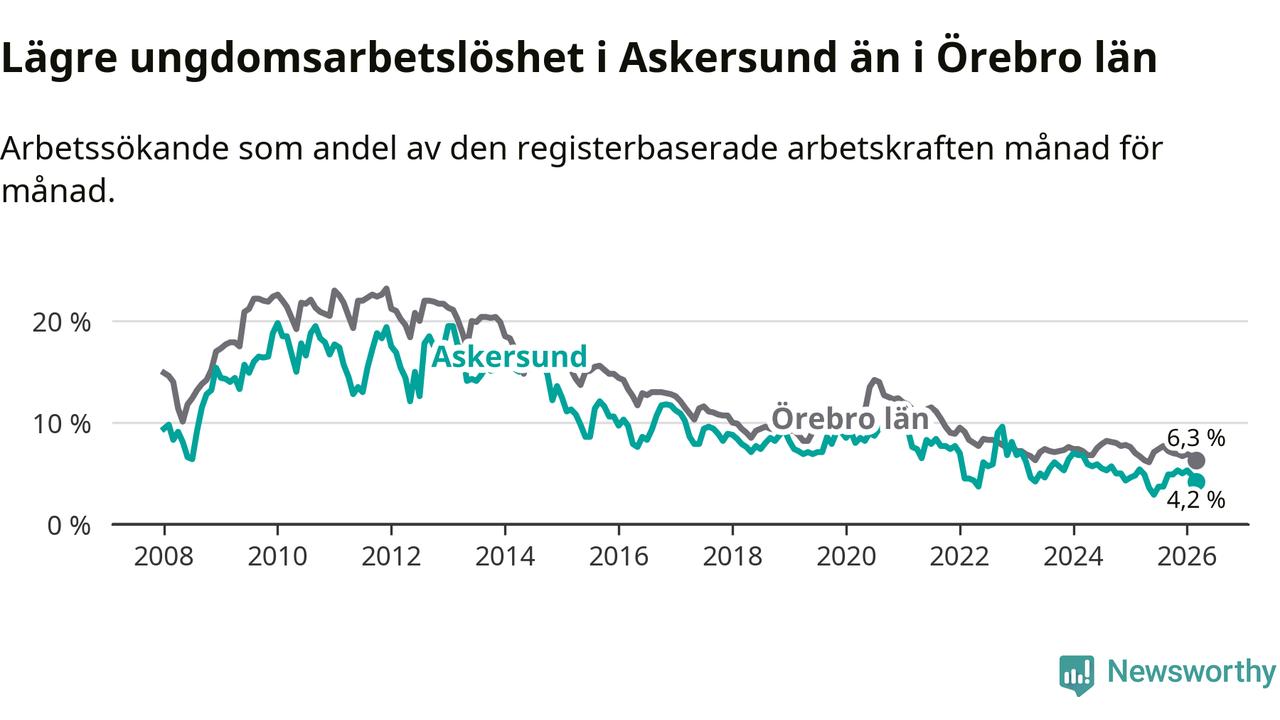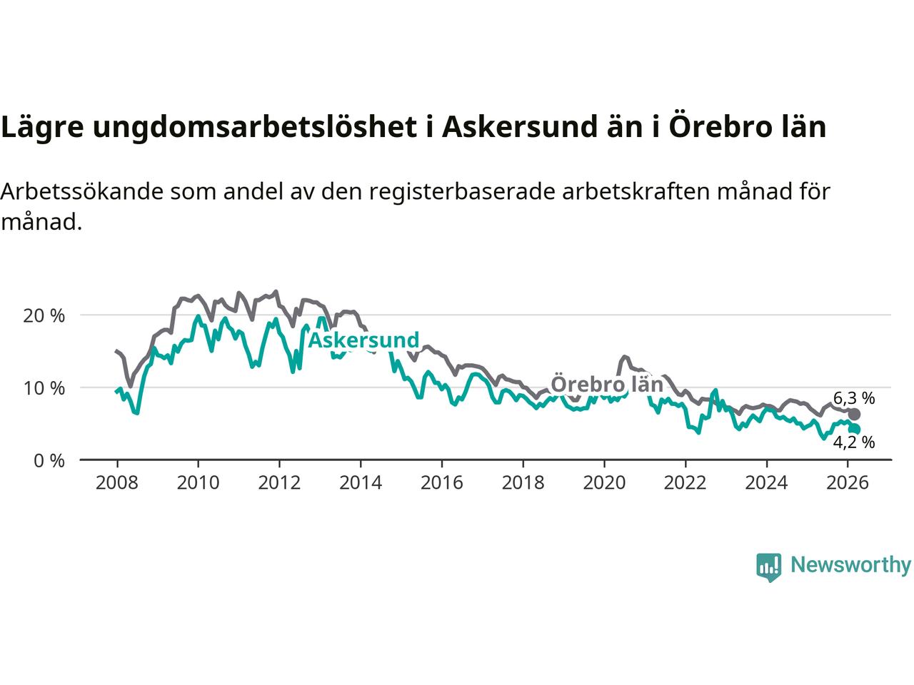 Precis som den totala arbetslösheten ligger ungdomsarbetslösheten i Askersund lägre än i Örebro som helhet. Skillnaden mellan kommunen och länet är 2,1 procentenheter.
