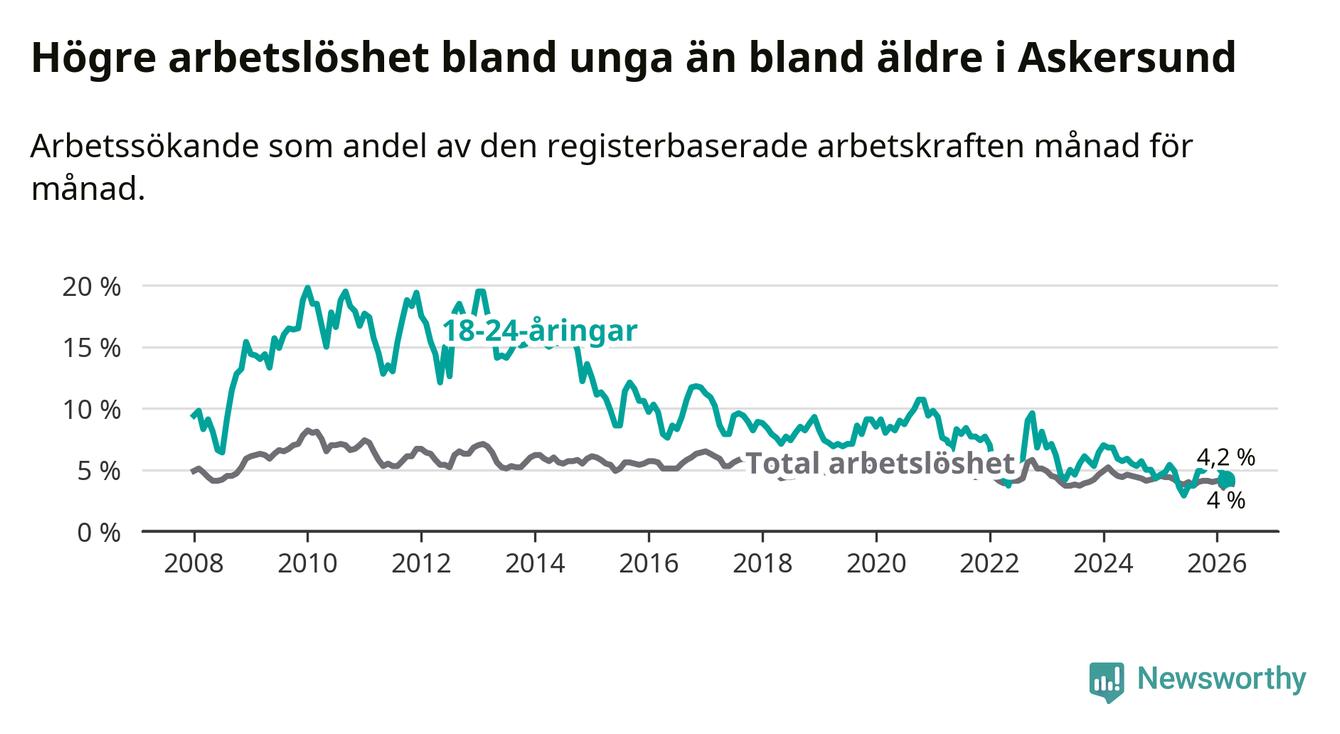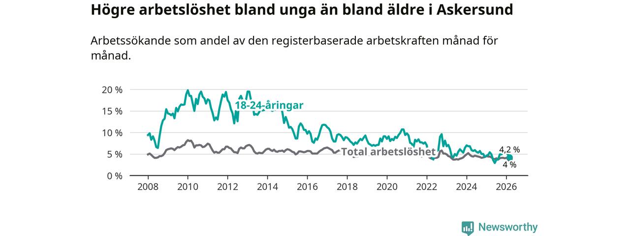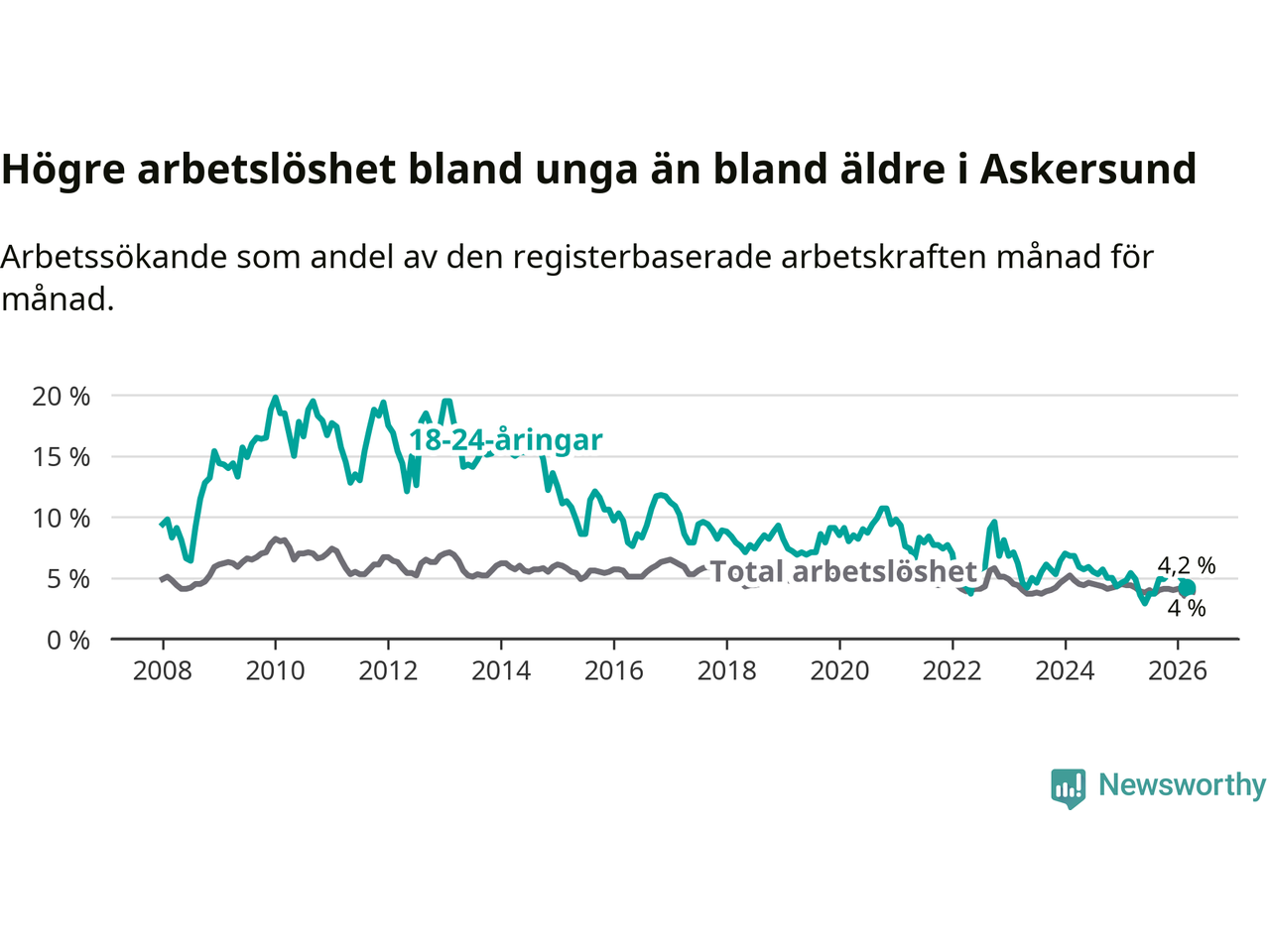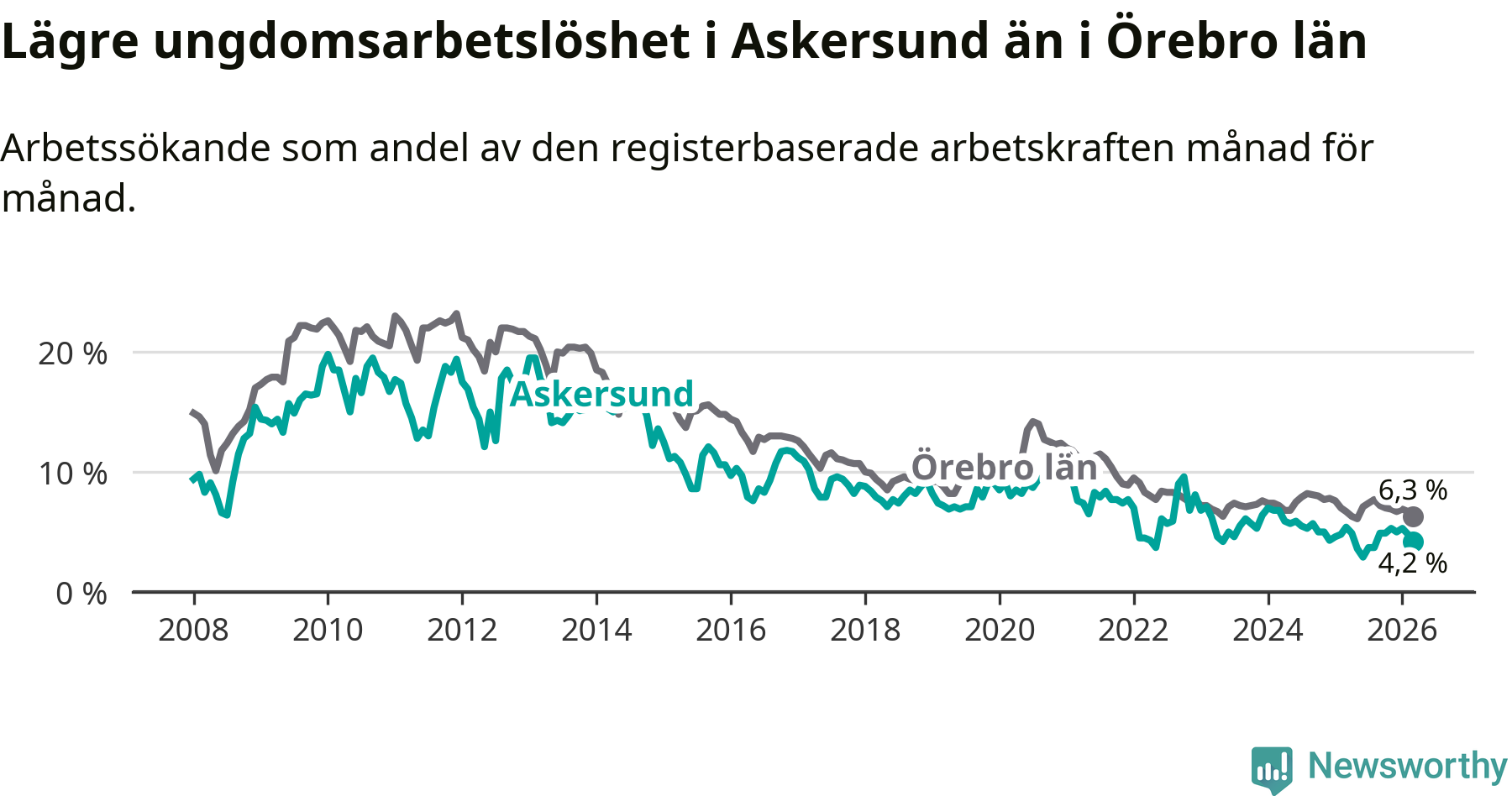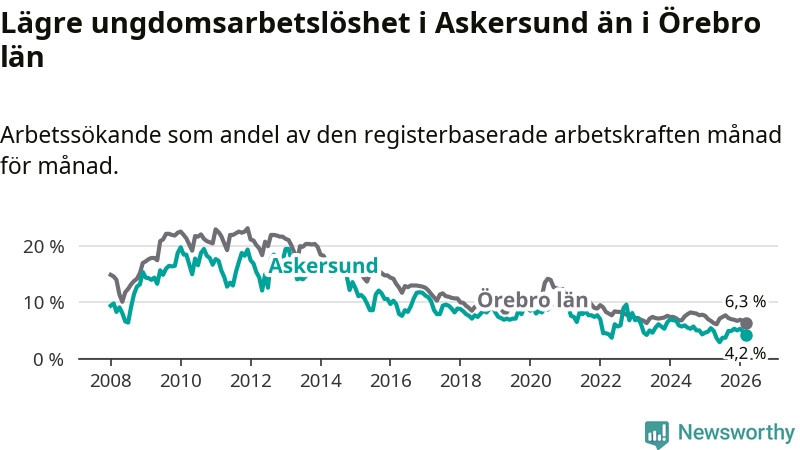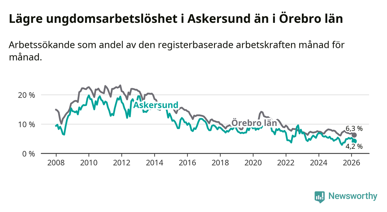 Precis som den totala arbetslösheten ligger ungdomsarbetslösheten i Askersund lägre än i Örebro som helhet. Skillnaden mellan kommunen och länet är 2,1 procentenheter.