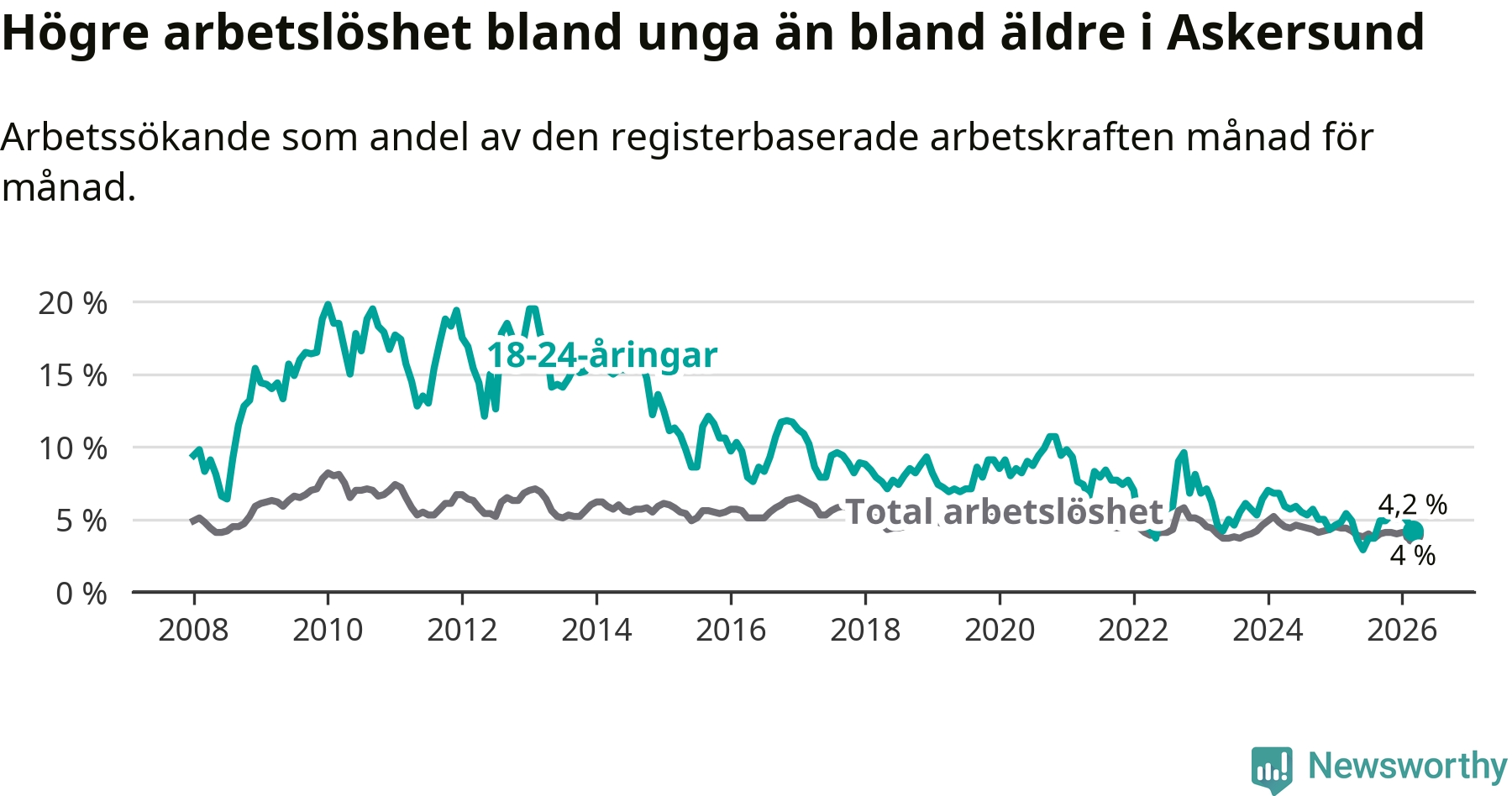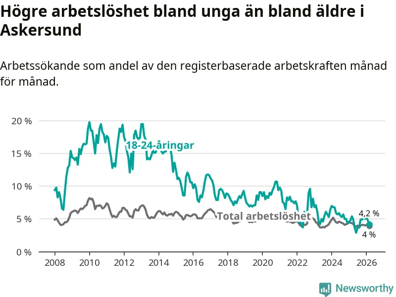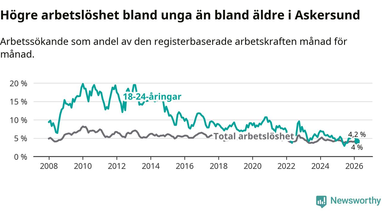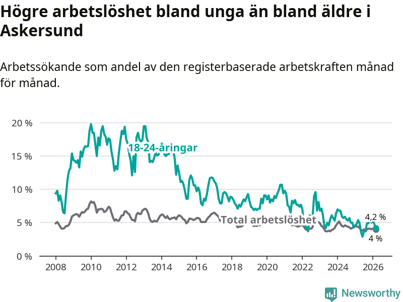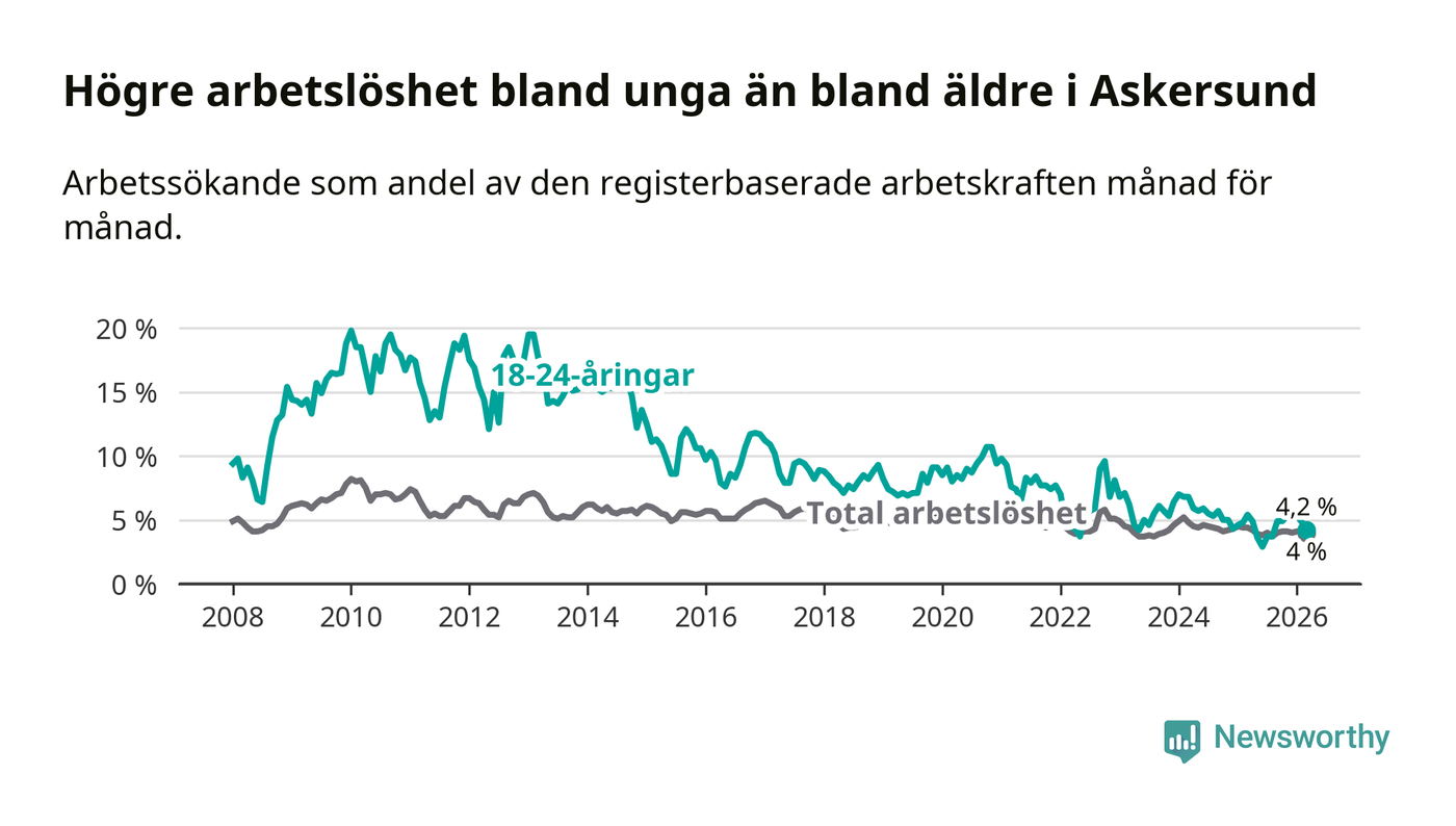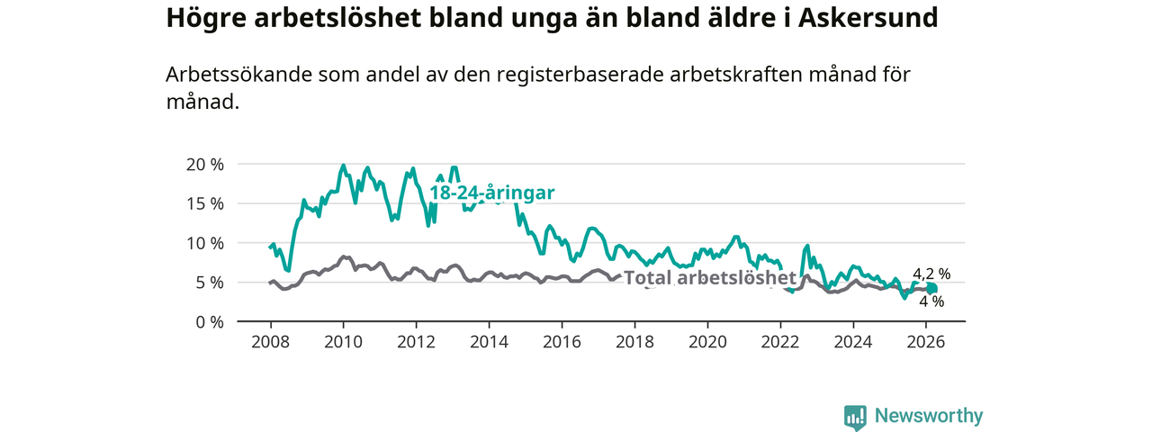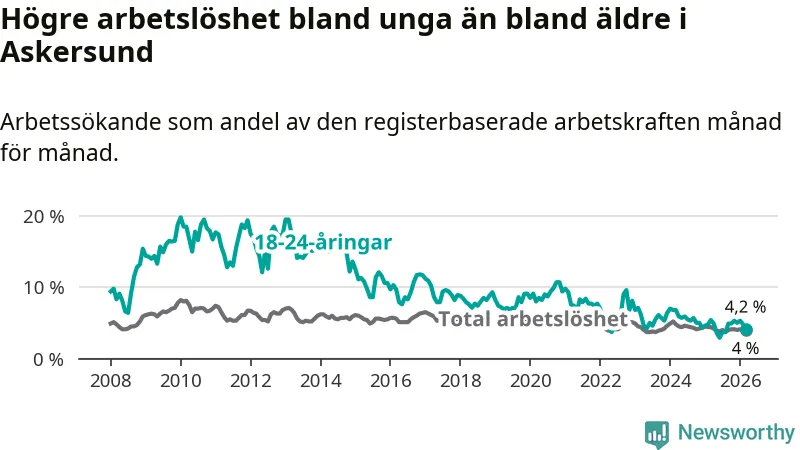 Precis som den totala arbetslösheten ligger ungdomsarbetslösheten i Askersund lägre än i Örebro som helhet. Skillnaden mellan kommunen och länet är 2,1 procentenheter.