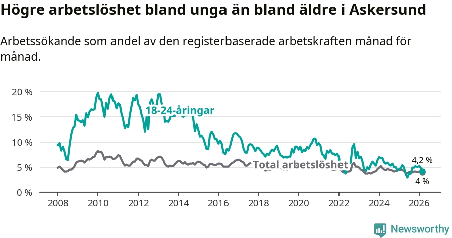 Precis som den totala arbetslösheten sjunker arbetslösheten bland unga (−1,2 procentenheter). I mars var 4,2 procent av 18–24-åringarna inskrivna som arbetssökande (motsvarande 23 personer). Mäter vi antalet inskrivna ser vi en minskning med sju personer på ett års sikt.