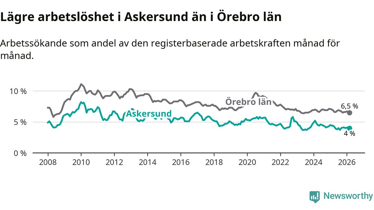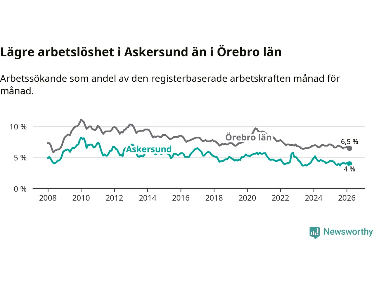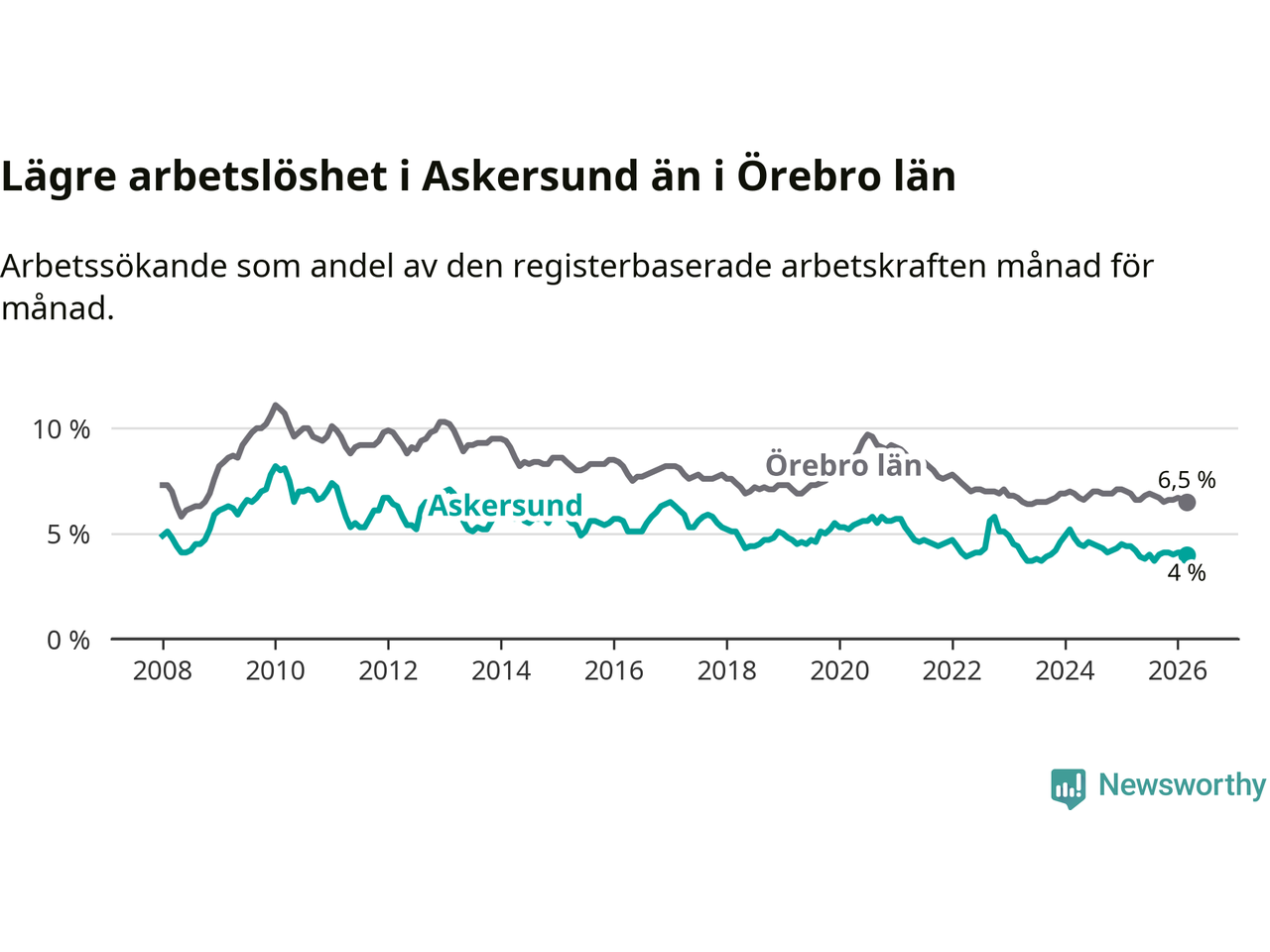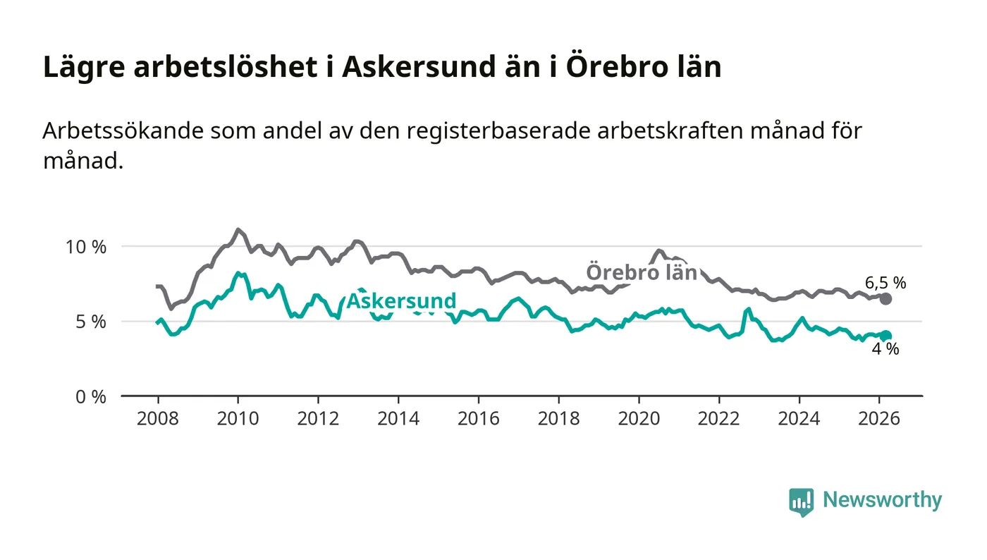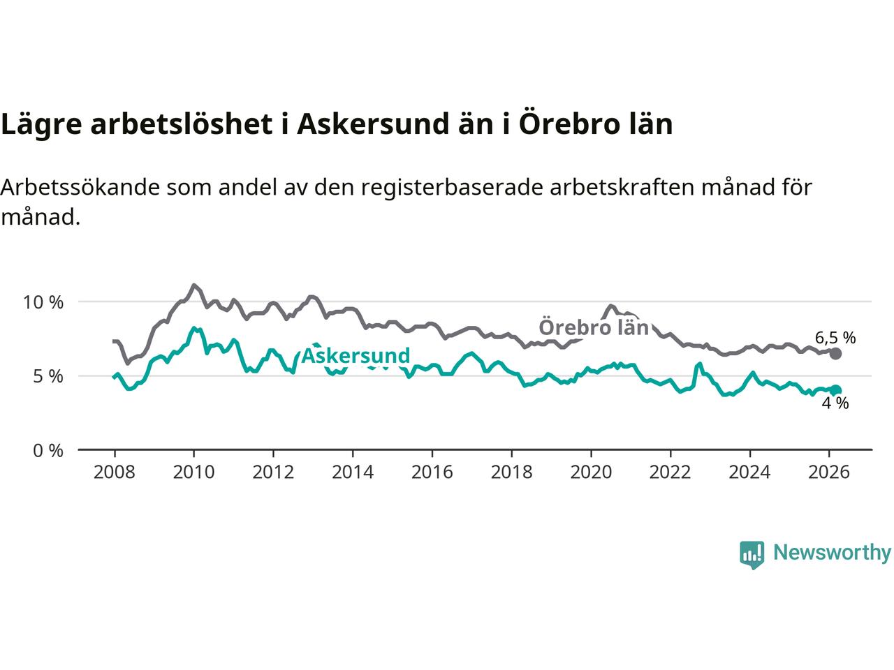 Under mars månad rapporterade Askersunds kommun en total arbetslöshet på 4,0 procent. Det är en minskning jämfört med samma tidpunkt i fjol (−0,4 procentenheter). Även i Örebro län sjunker arbetslösheten .