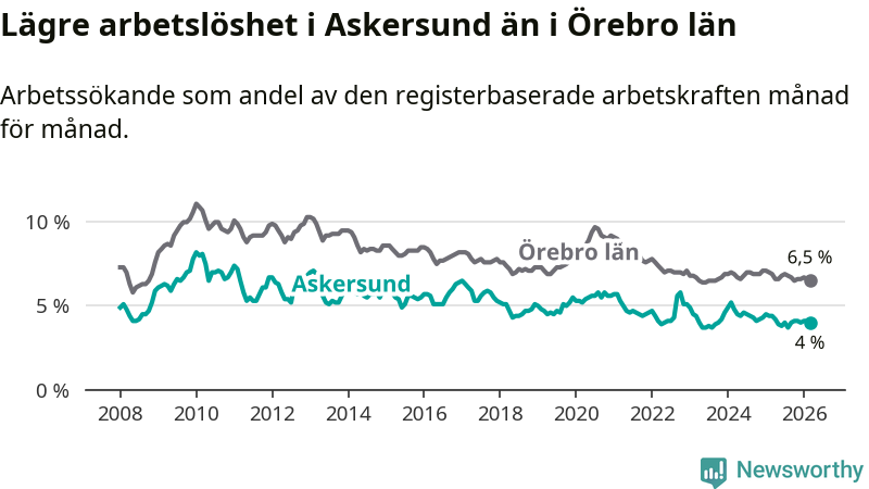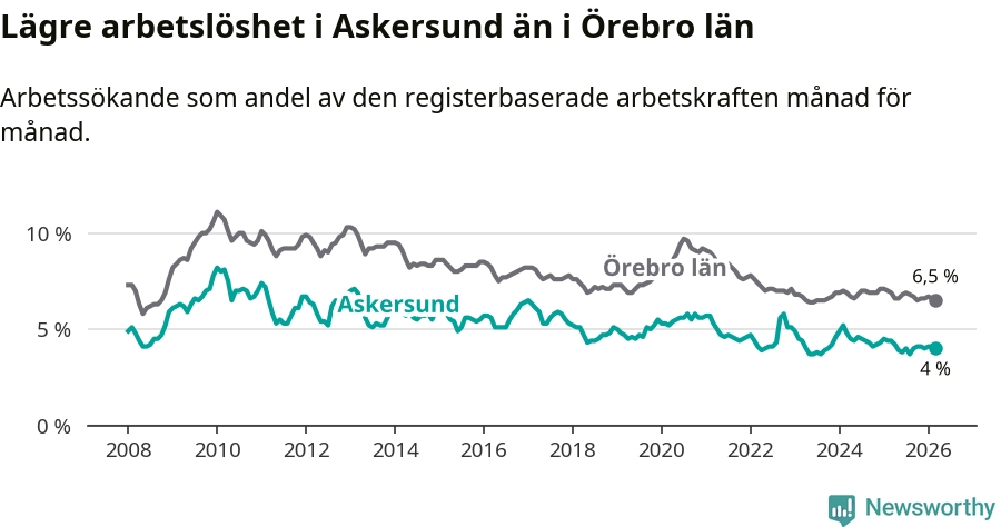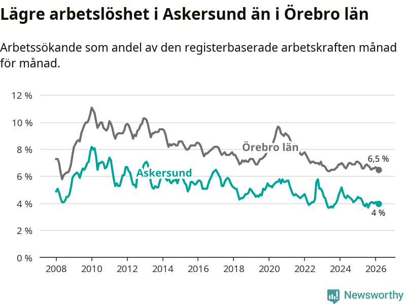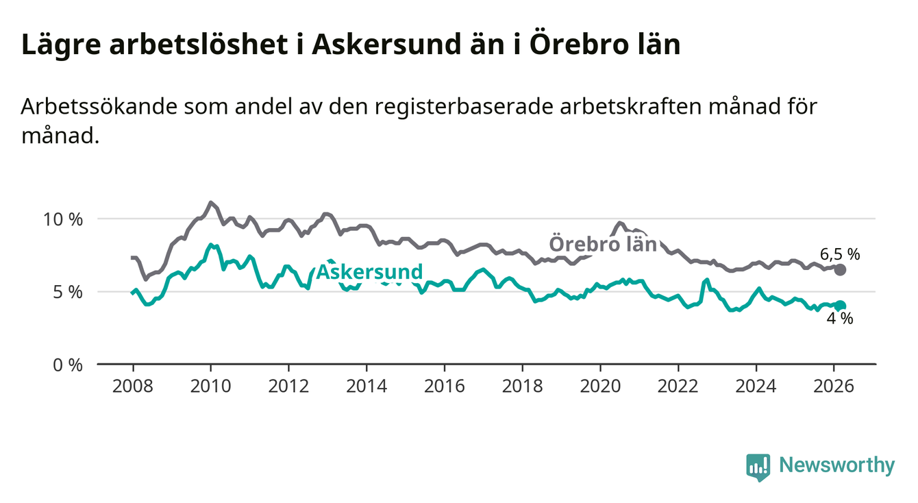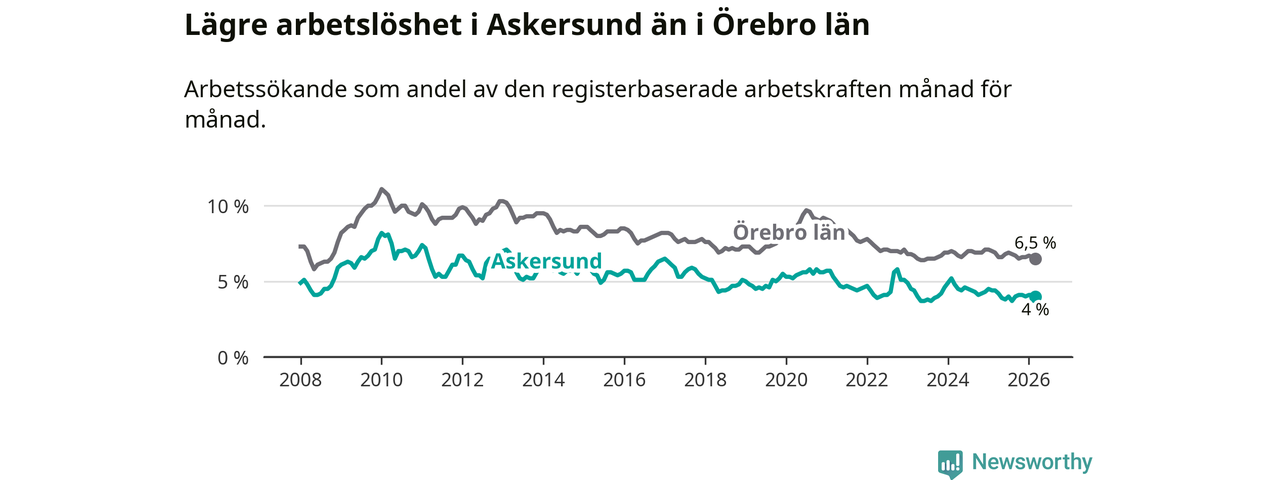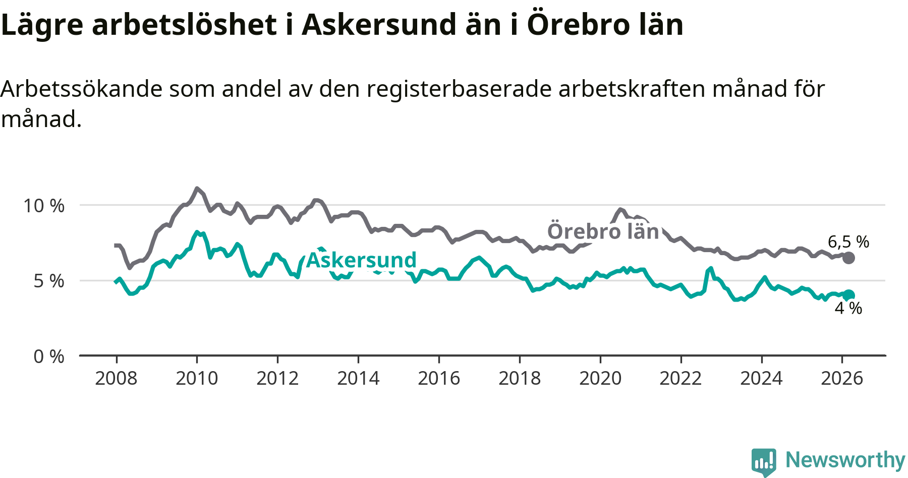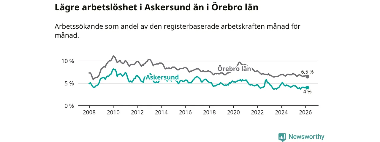 Under mars månad rapporterade Askersunds kommun en total arbetslöshet på 4,0 procent. Det är en minskning jämfört med samma tidpunkt i fjol (−0,4 procentenheter). Även i Örebro län sjunker arbetslösheten .