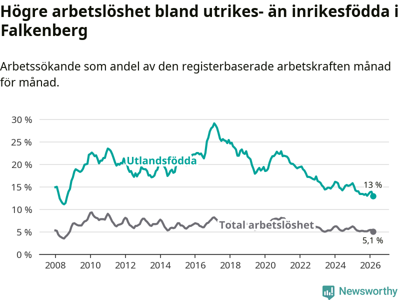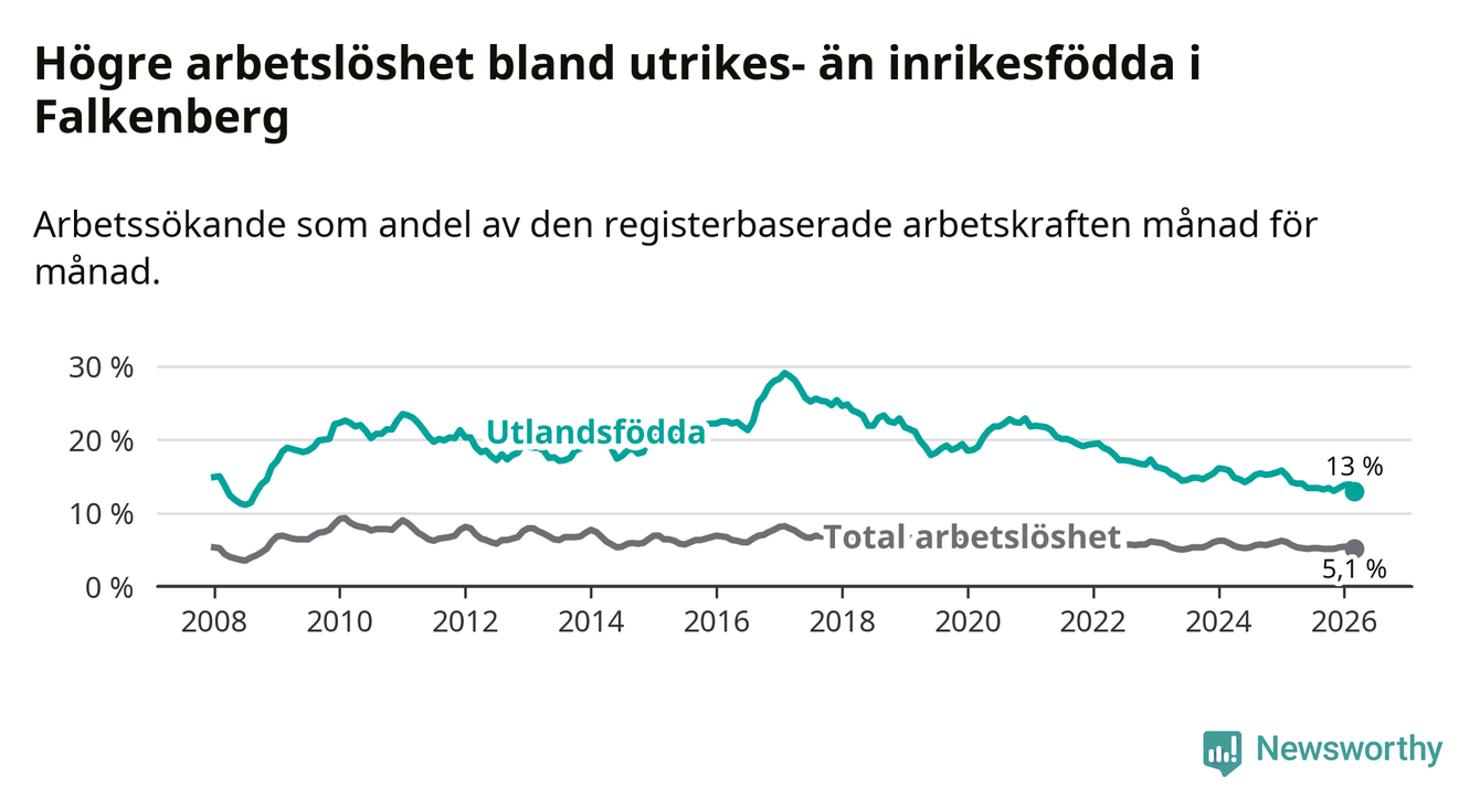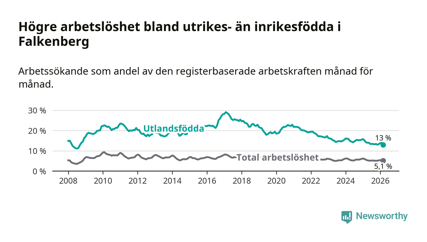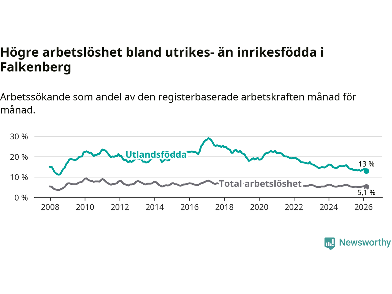 Arbetslösheten bland utlandsfödda var 13,0 procent i Falkenberg under mars månad, motsvarande 568 av 4 369 personer. Det är 1,2 procentenheter färre än vid samma tidpunkt i fjol (−51 om man räknar personer). Därmed är de utlandsföddas arbetslöshet lägre än vid samma tidpunkt i fjol för 15:e månaden i följd. Sedan december 2024 har arbetslösheten bland utlandsfödda minskat från 15,5 till 13,0 procent.