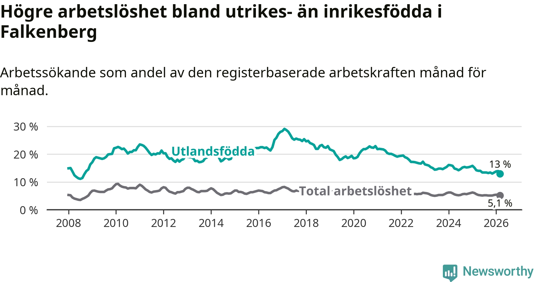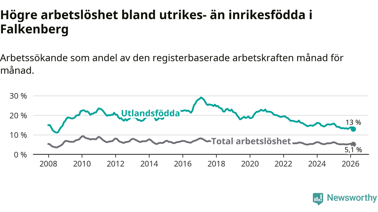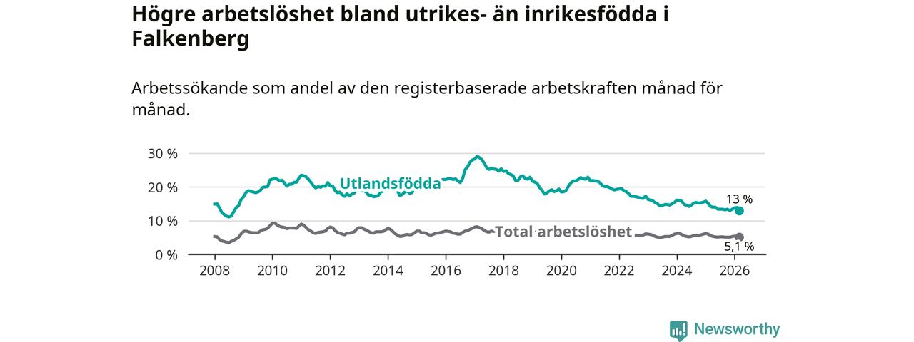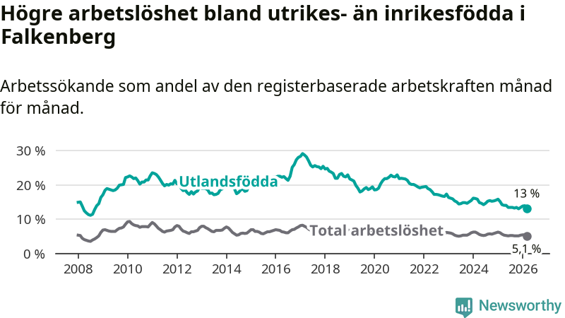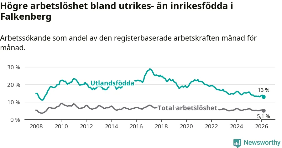 Arbetslösheten bland utlandsfödda var 13,0 procent i Falkenberg under mars månad, motsvarande 568 av 4 369 personer. Det är 1,2 procentenheter färre än vid samma tidpunkt i fjol (−51 om man räknar personer). Därmed är de utlandsföddas arbetslöshet lägre än vid samma tidpunkt i fjol för 15:e månaden i följd. Sedan december 2024 har arbetslösheten bland utlandsfödda minskat från 15,5 till 13,0 procent.