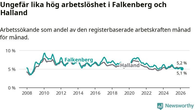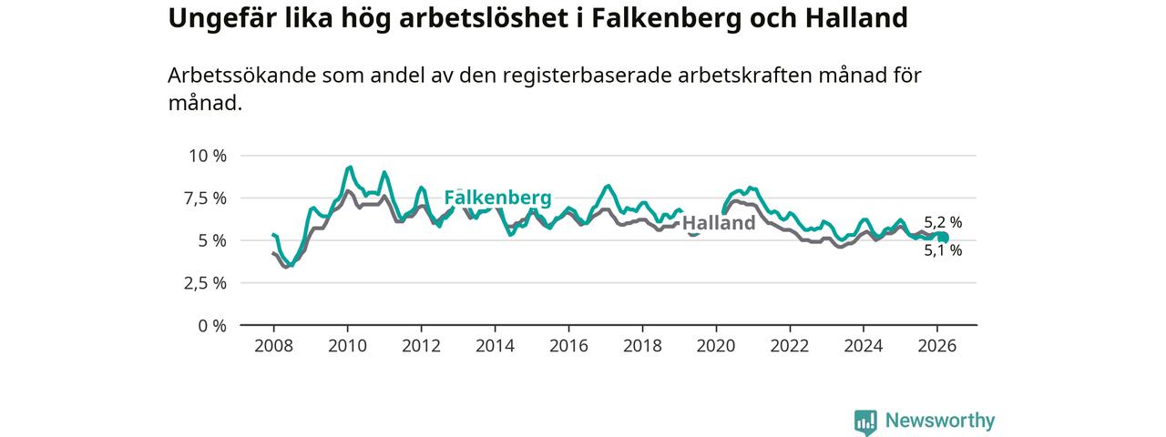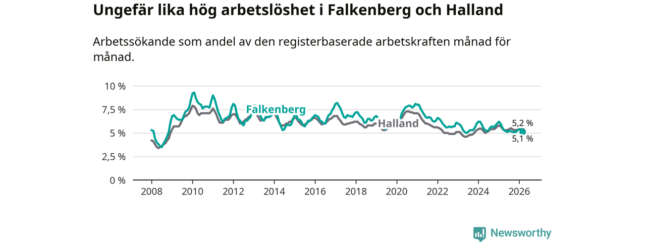 Det är 14:e månaden i följd som arbetslösheten i Falkenberg är lägre än den var under samma tidpunkt året innan. Sedan januari 2025 har arbetslösheten gått ner från 6,2 till 5,1 procent.