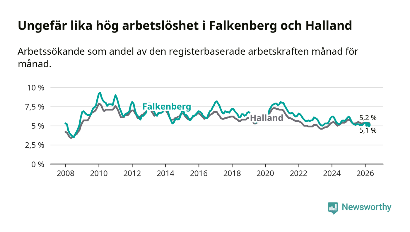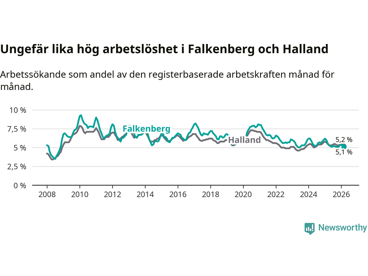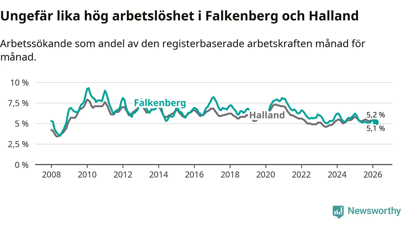 Under mars månad rapporterade Falkenbergs kommun en total arbetslöshet på 5,1 procent. Det är en minskning jämfört med samma tidpunkt i fjol (−0,5 procentenheter). Även i Hallands län sjunker arbetslösheten .