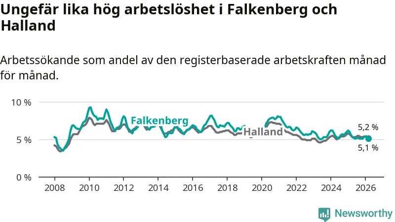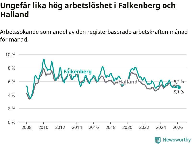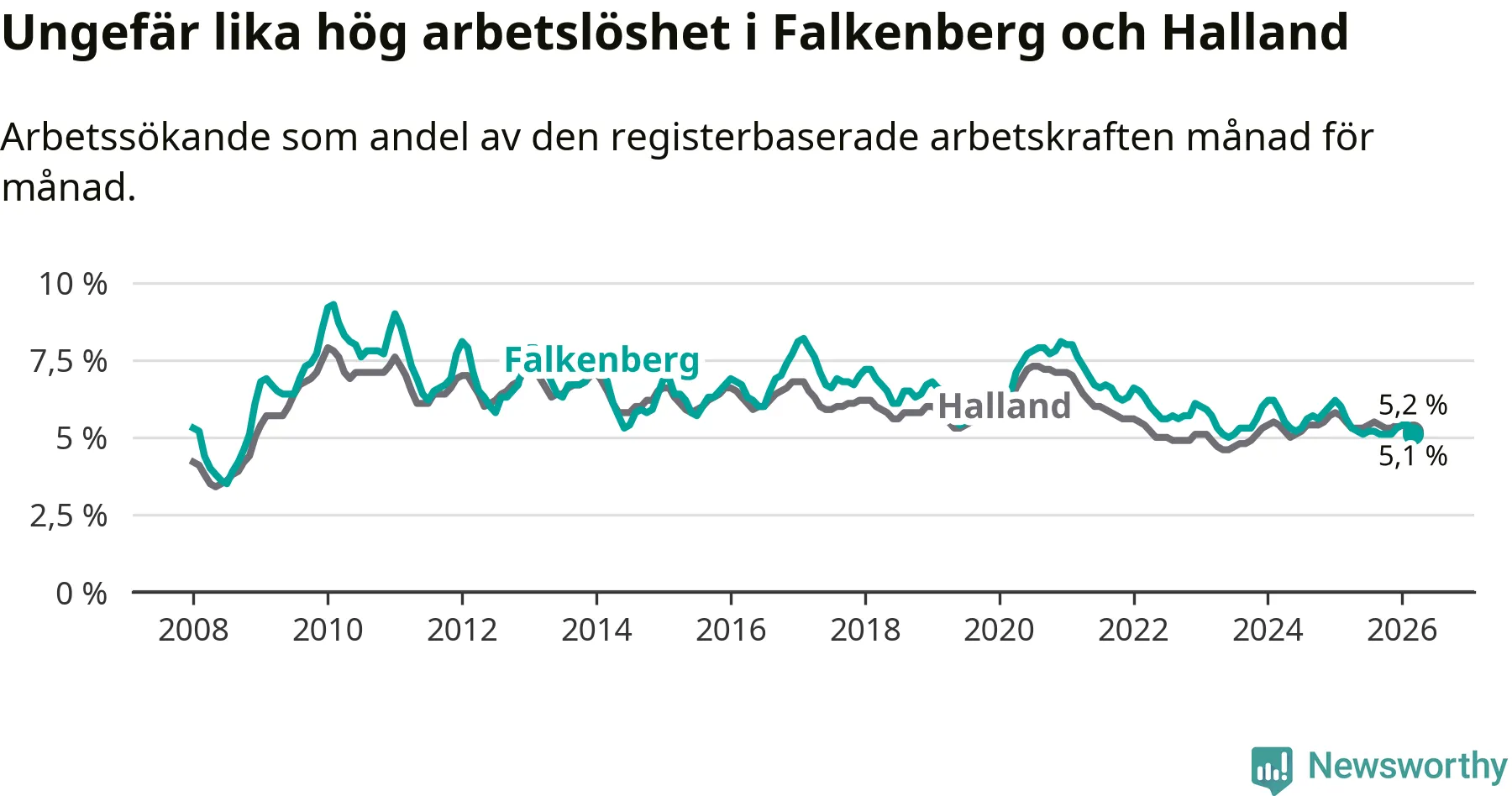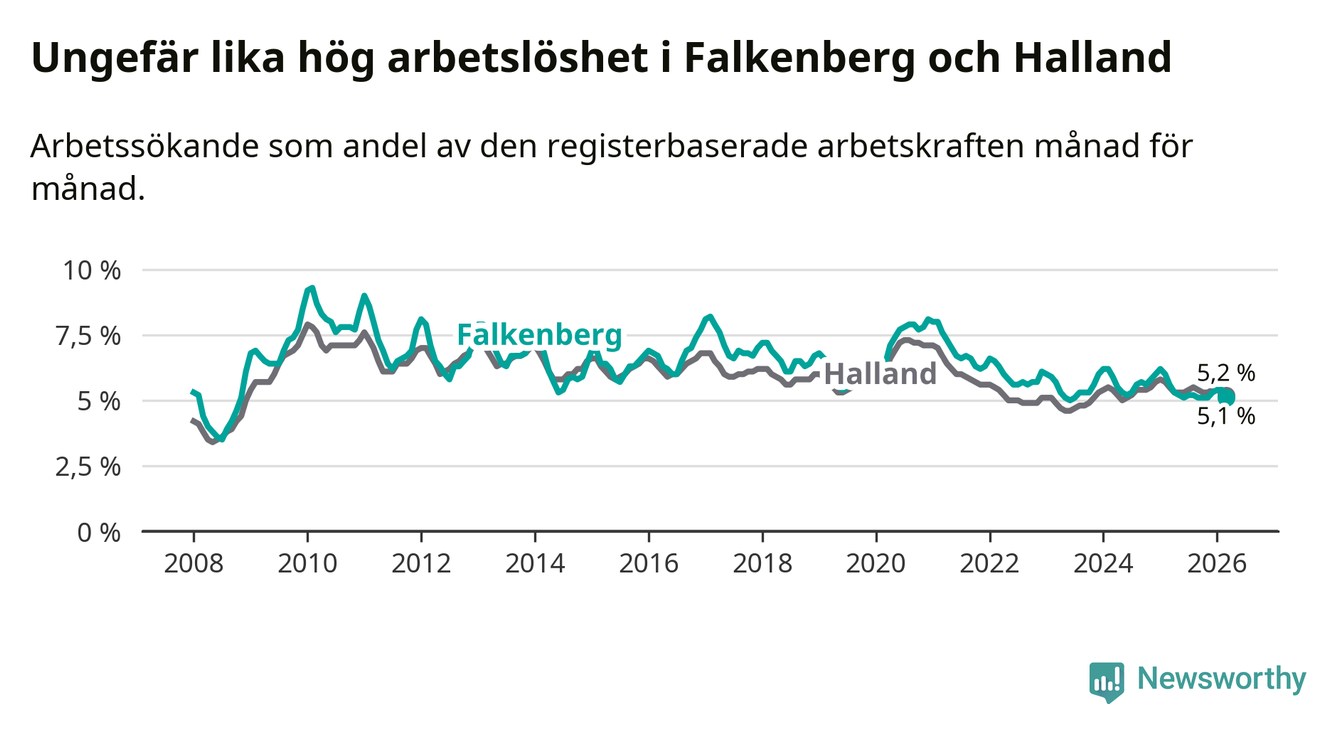 Under mars månad rapporterade Falkenbergs kommun en total arbetslöshet på 5,1 procent. Det är en minskning jämfört med samma tidpunkt i fjol (−0,5 procentenheter). Även i Hallands län sjunker arbetslösheten .