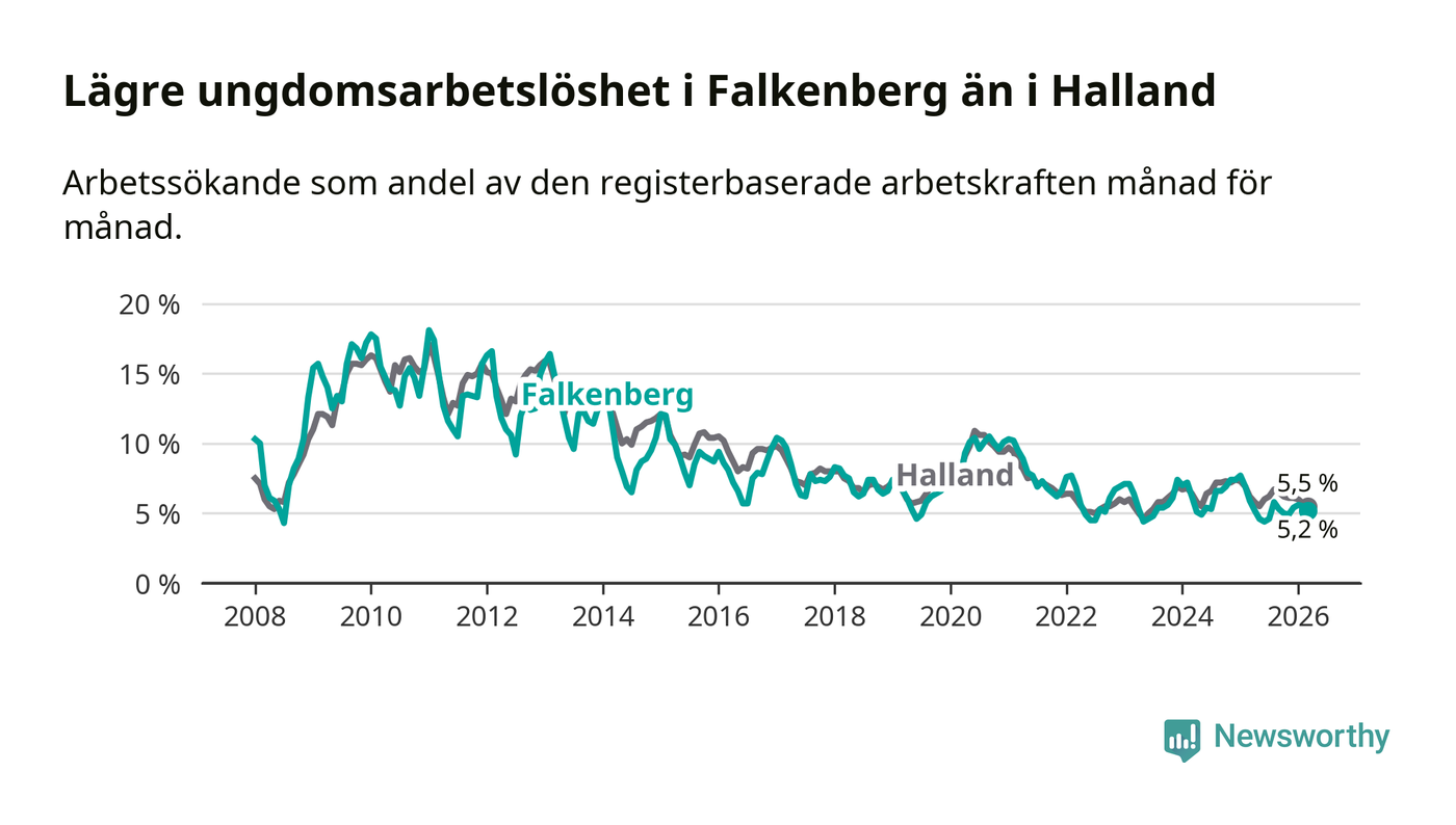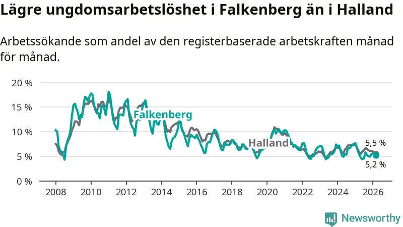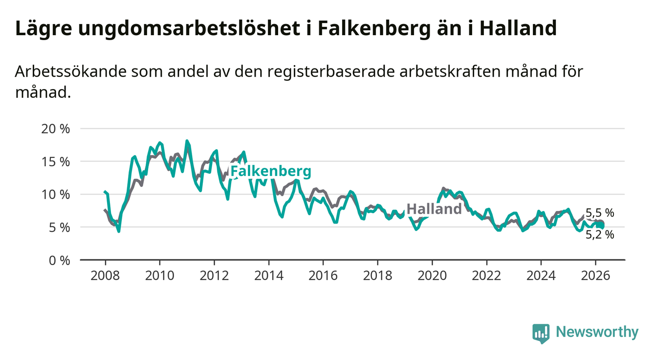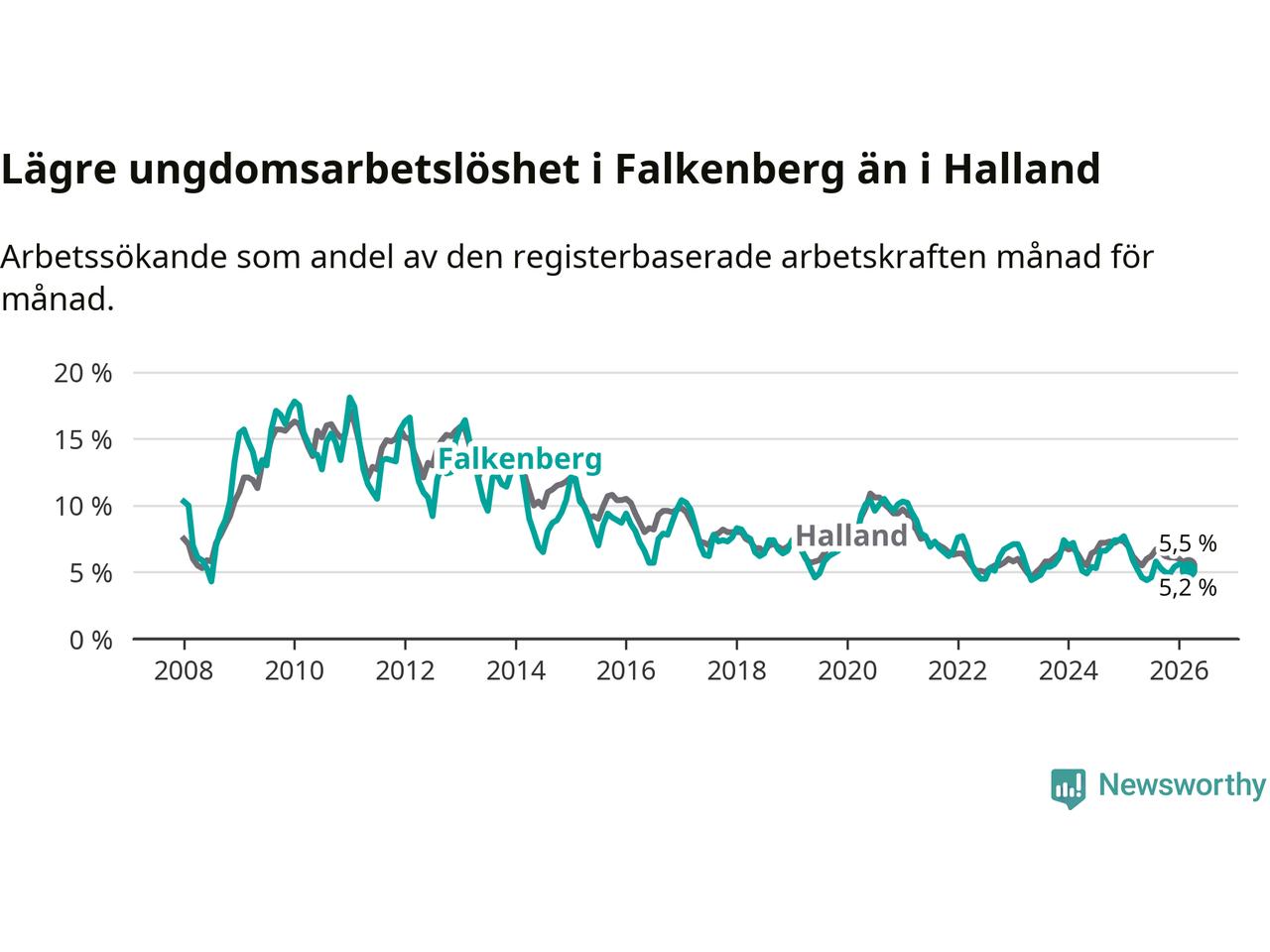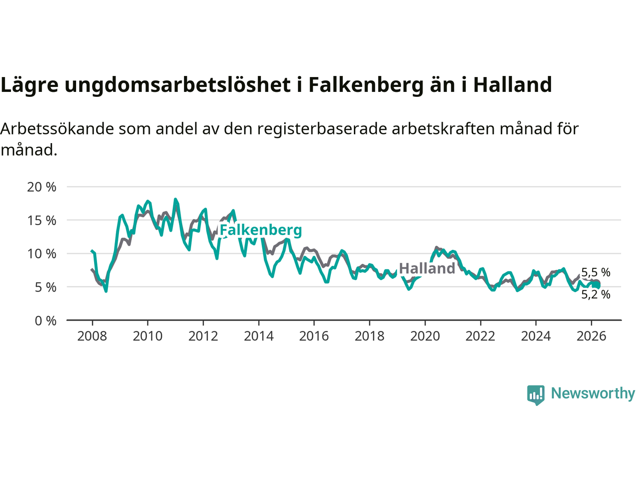 Medan Falkenberg har ungefär samma total arbetslöshet som Halland, ligger ungdomsarbetslösheten 0,3 procentenheter lägre i Falkenberg.