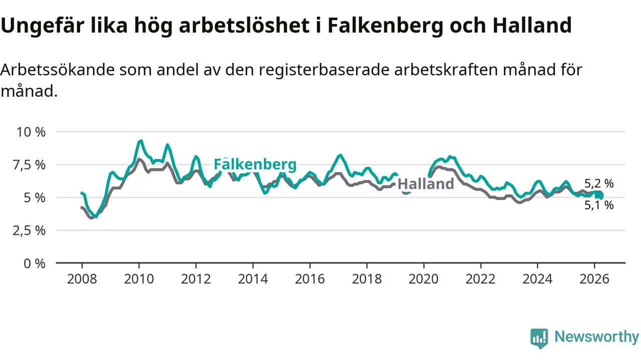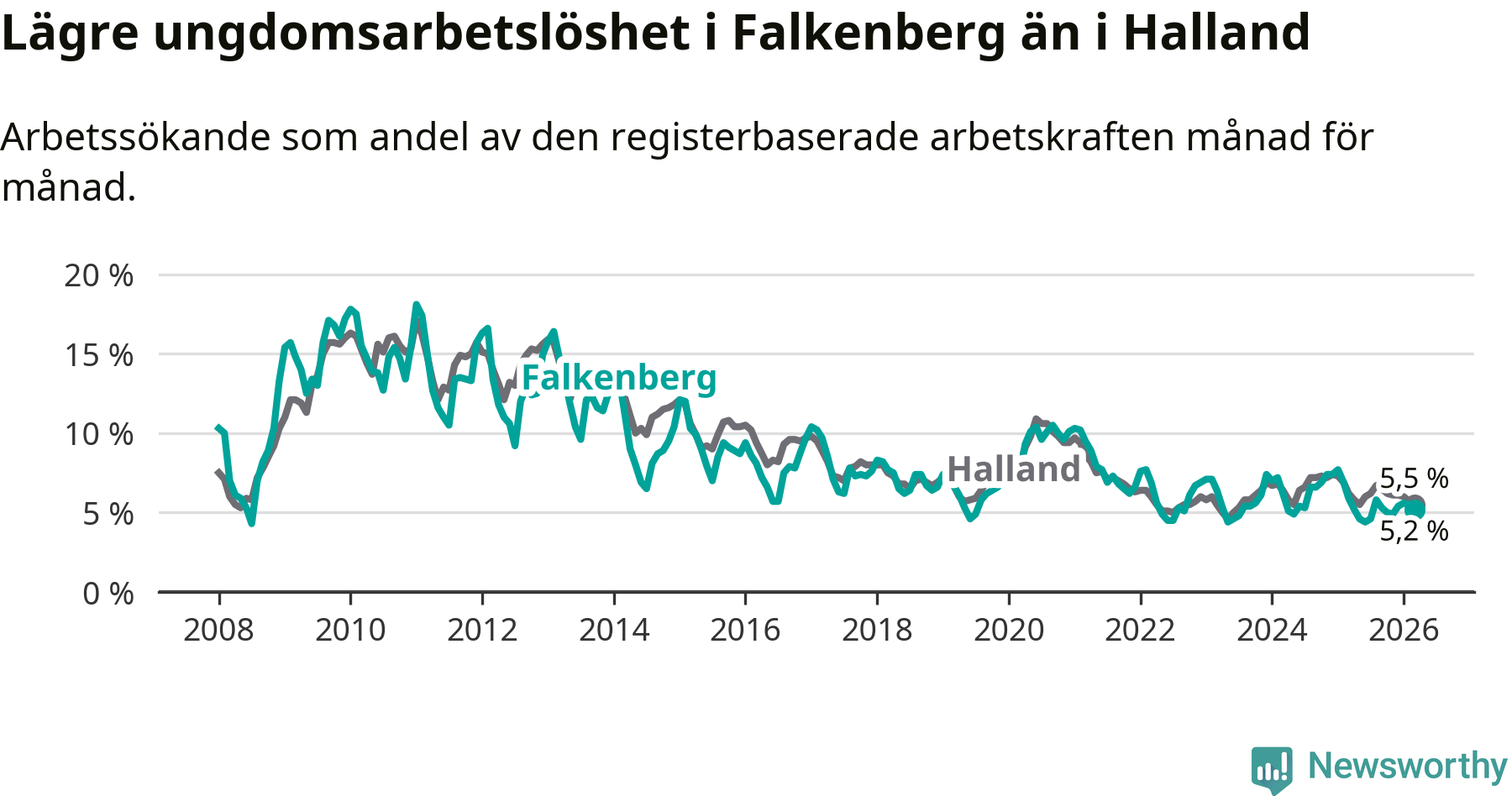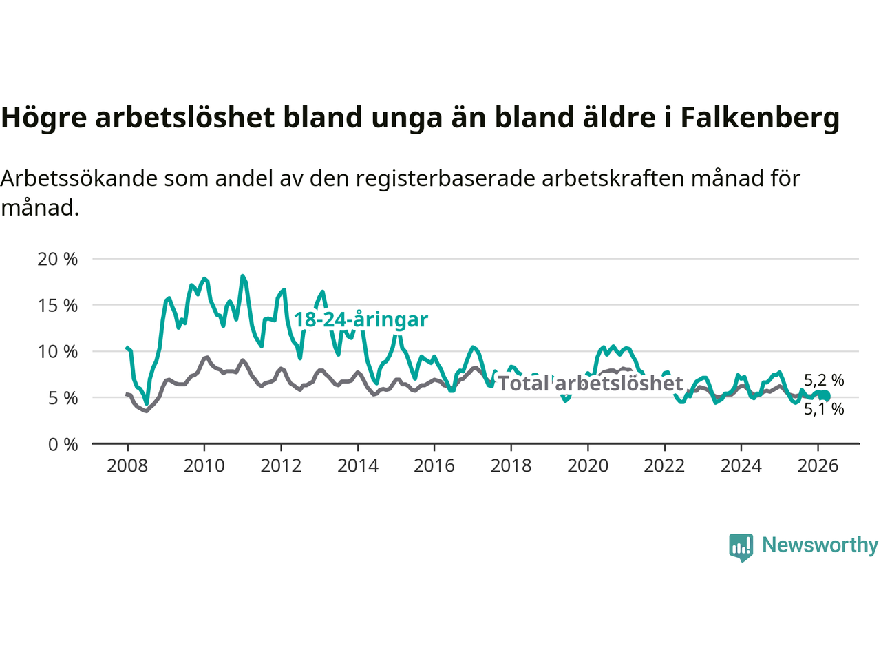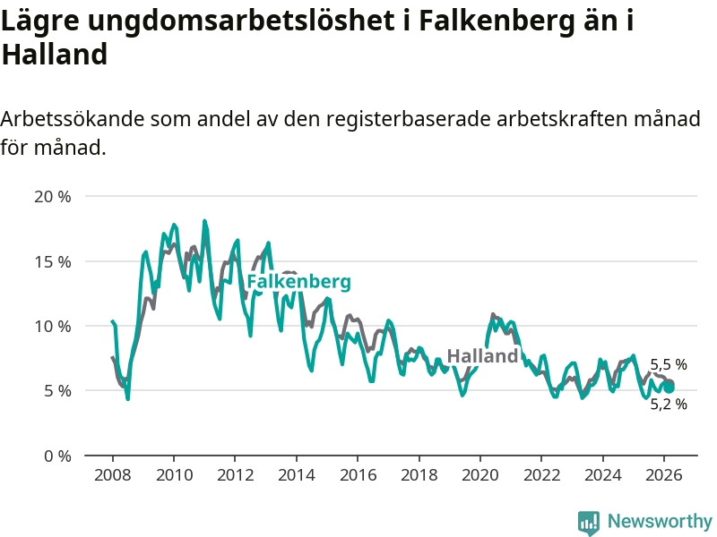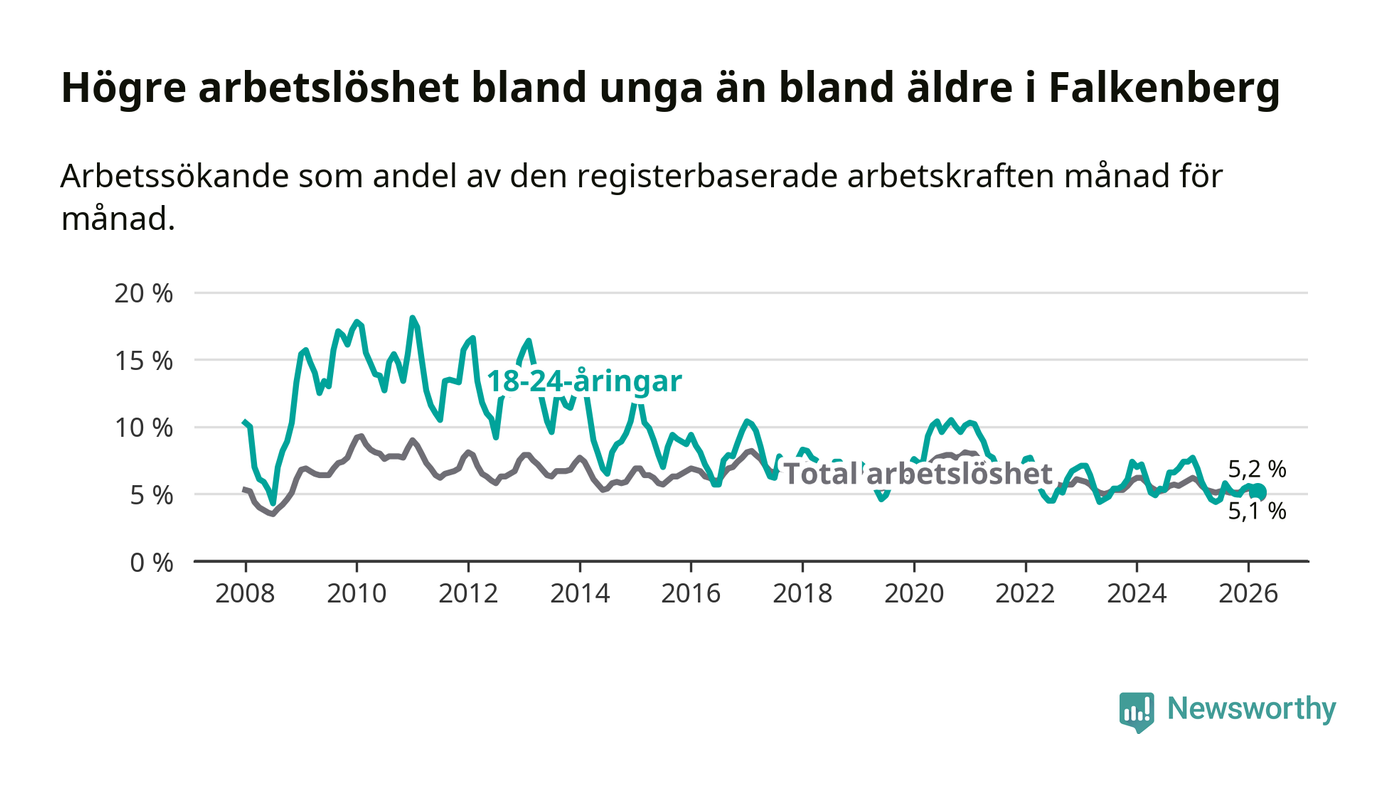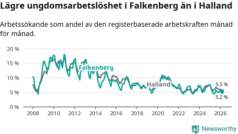 Medan Falkenberg har ungefär samma total arbetslöshet som Halland, ligger ungdomsarbetslösheten 0,3 procentenheter lägre i Falkenberg.