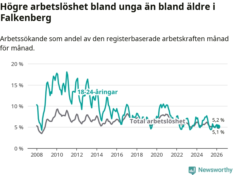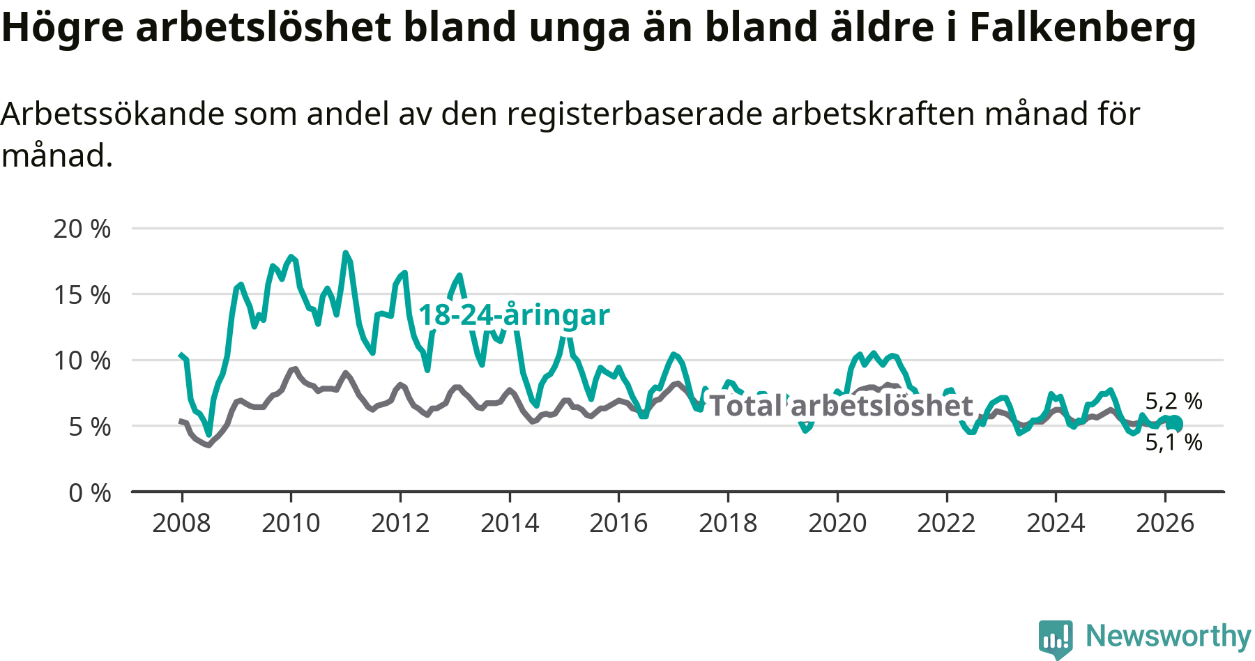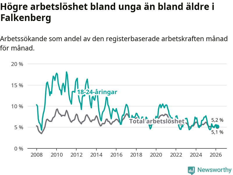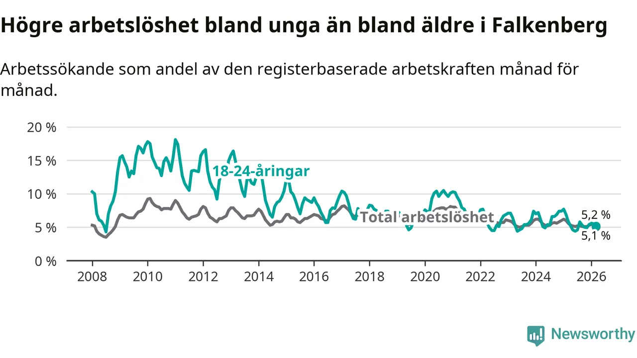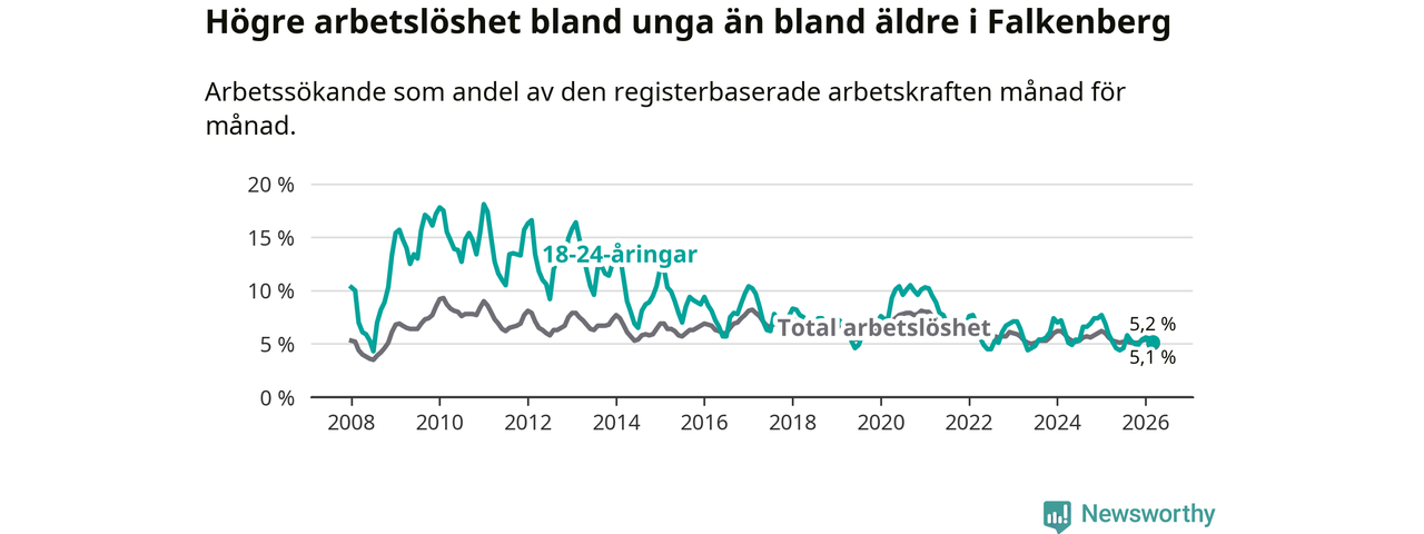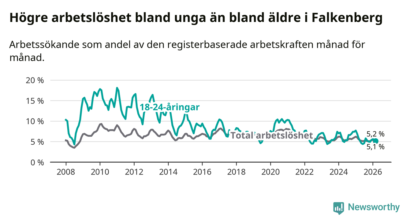 Medan Falkenberg har ungefär samma total arbetslöshet som Halland, ligger ungdomsarbetslösheten 0,3 procentenheter lägre i Falkenberg.