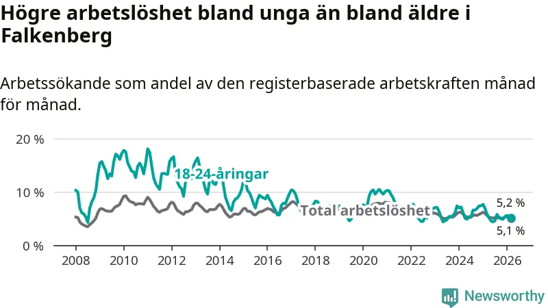 I och med den senaste månadens nedgång har de ungas arbetslöshet i Falkenberg sjunkit elva månader i följd (ner från 5,2 procent i april 2025 till 5,2 procent nu).