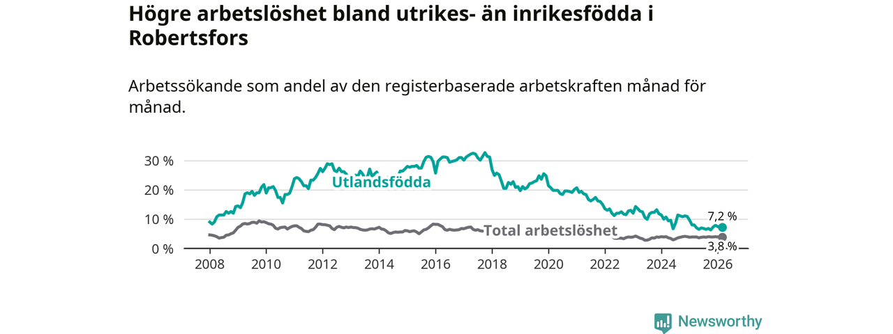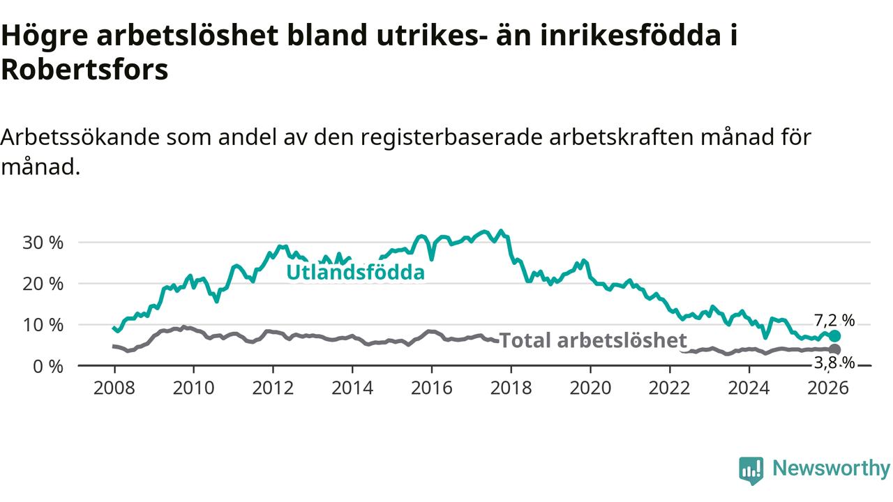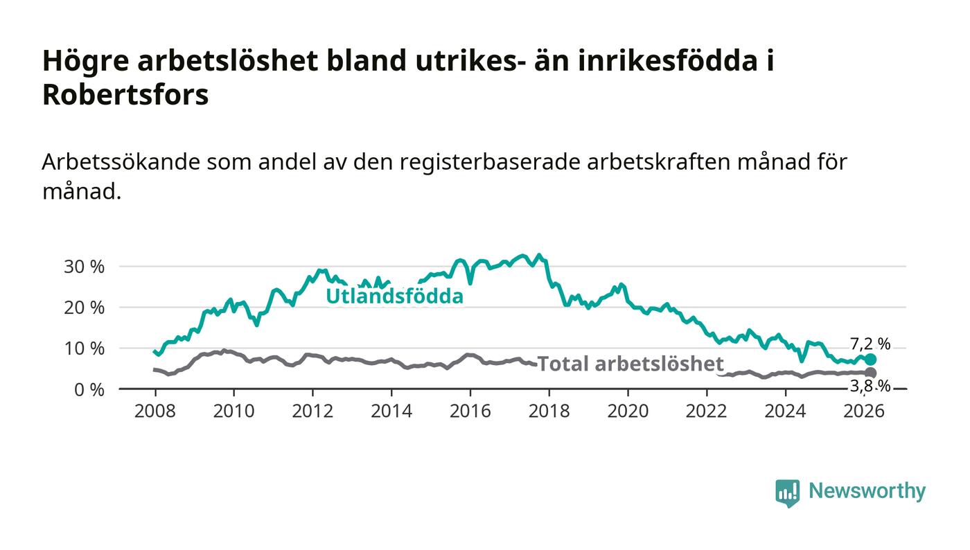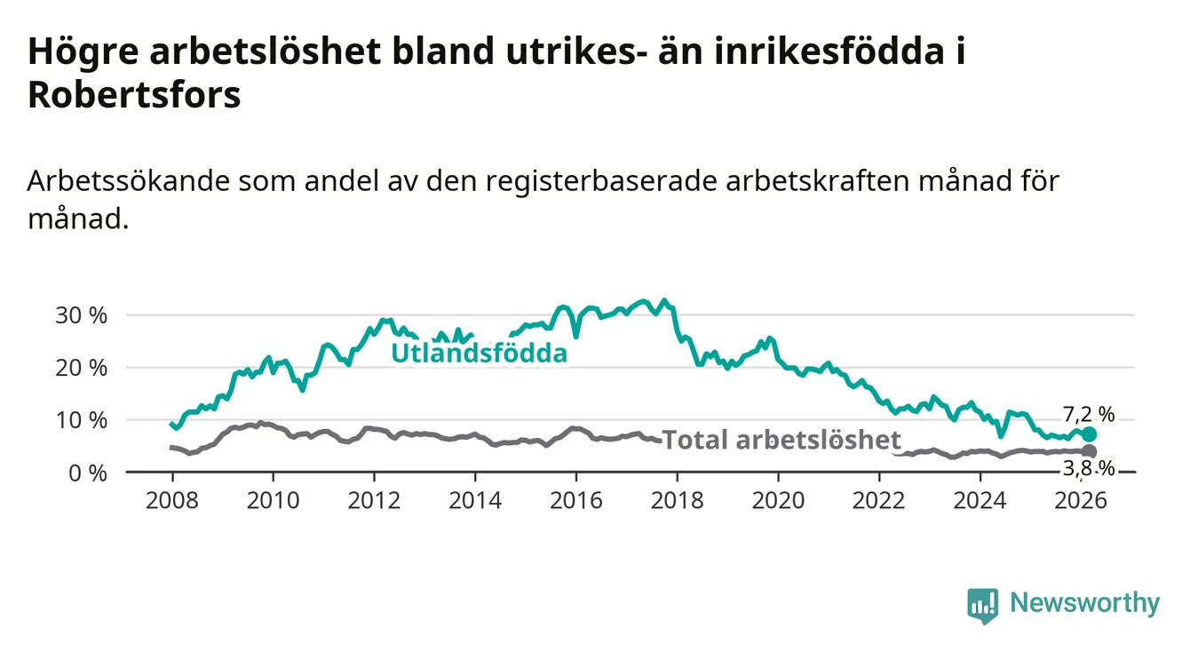 Skillnaden i arbetslöshet mellan utrikesfödda och hela befolkningen är 3,4 procentenheter i Robertsfors. Det är en mindre skillnad än för ett år sedan (−0,7 procentenheter).