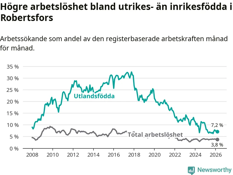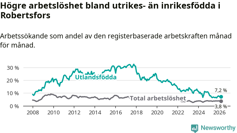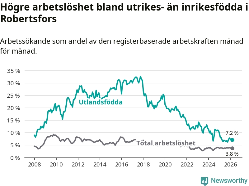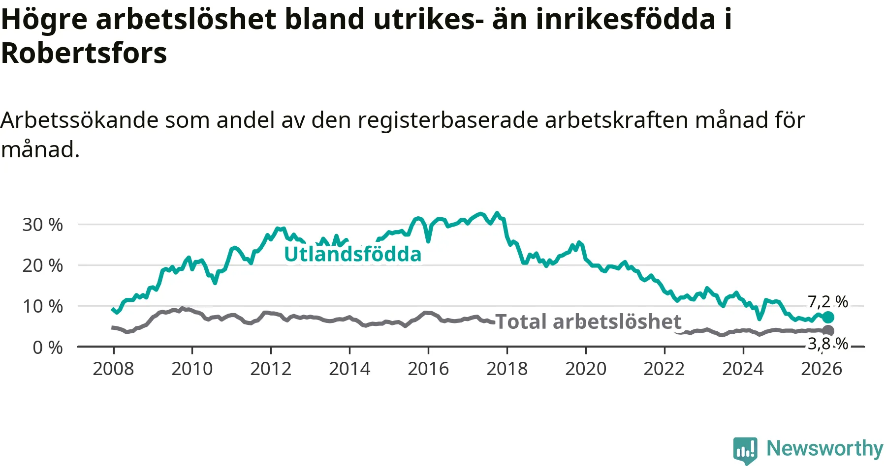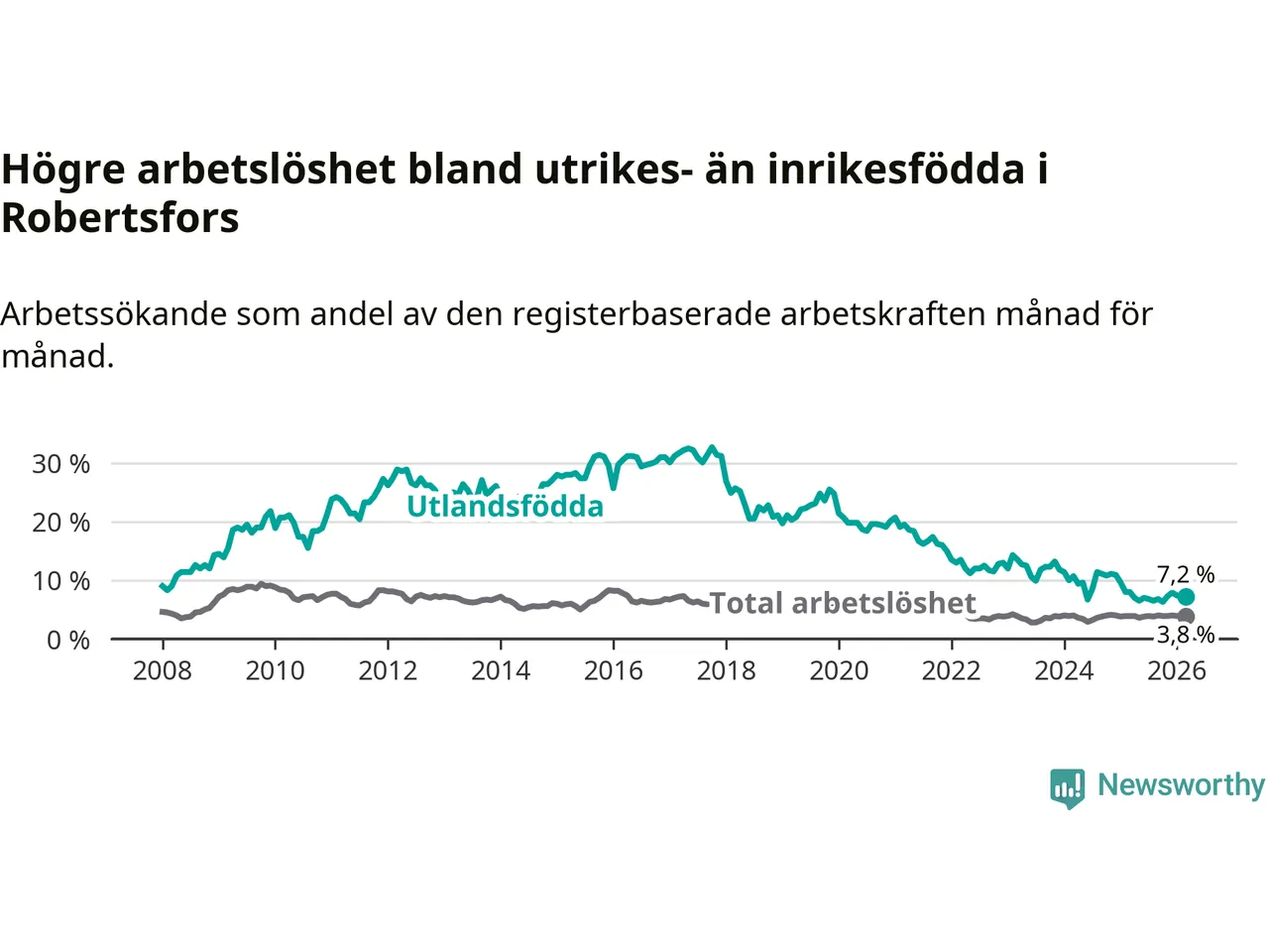 Skillnaden i arbetslöshet mellan utrikesfödda och hela befolkningen är 3,4 procentenheter i Robertsfors. Det är en mindre skillnad än för ett år sedan (−0,7 procentenheter).