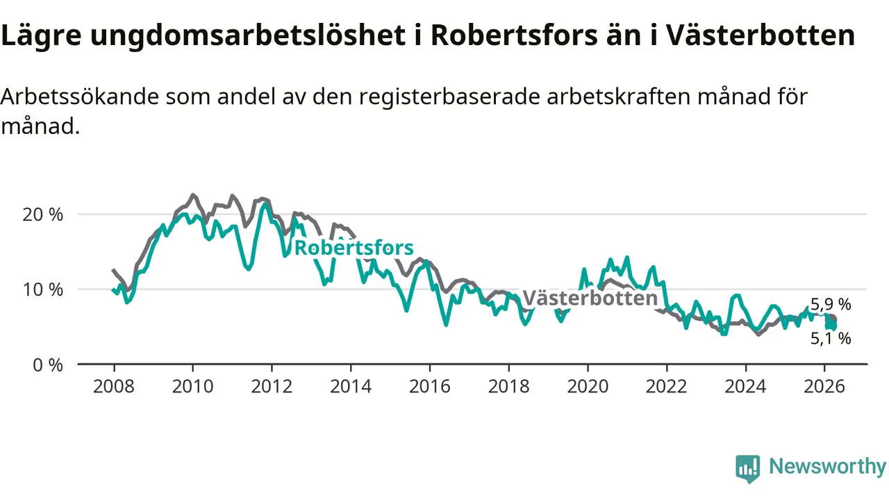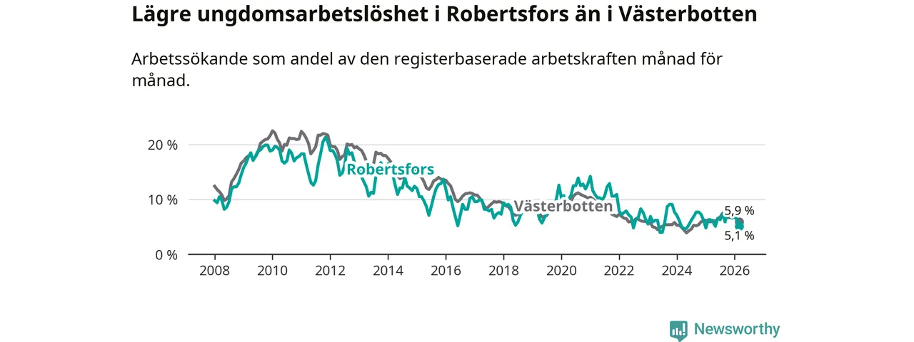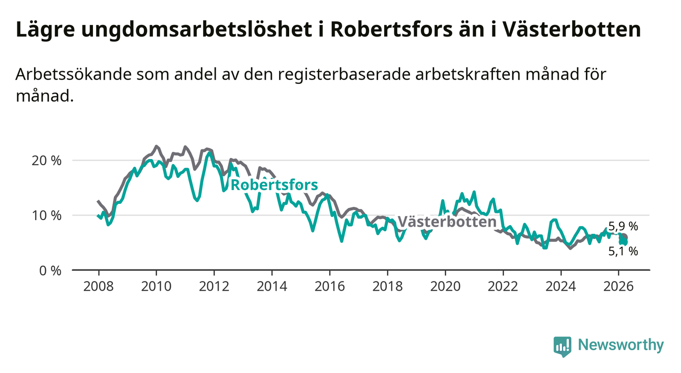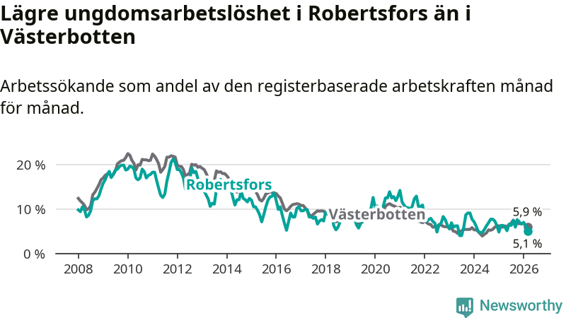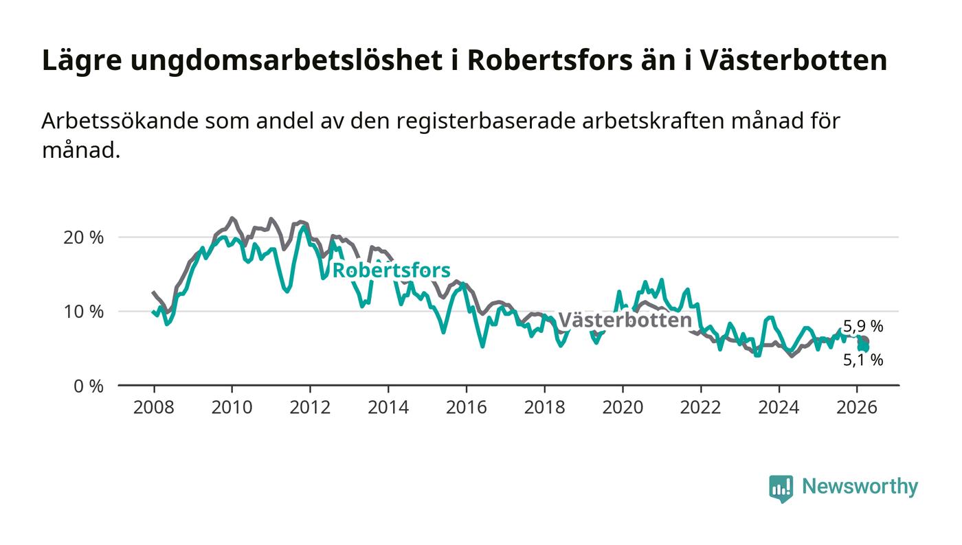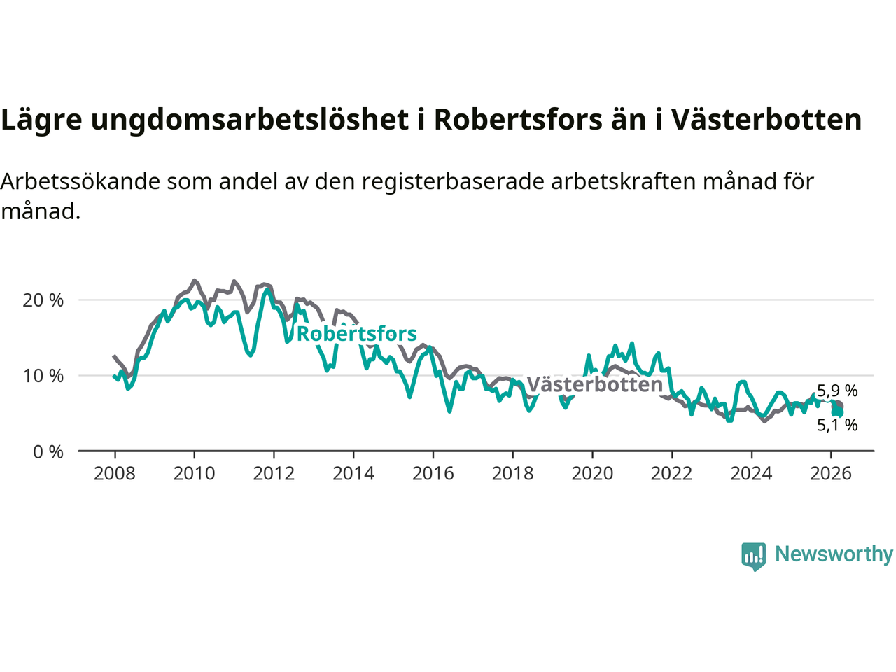 Precis som den totala arbetslösheten ligger ungdomsarbetslösheten i Robertsfors lägre än i Västerbotten som helhet. Skillnaden mellan kommunen och länet är 0,8 procentenheter.