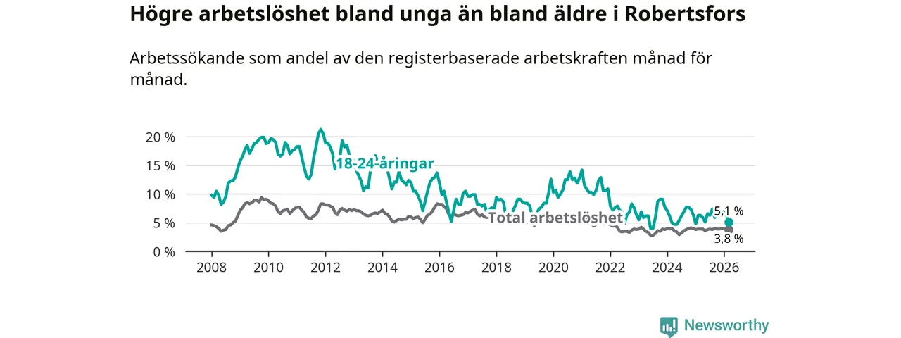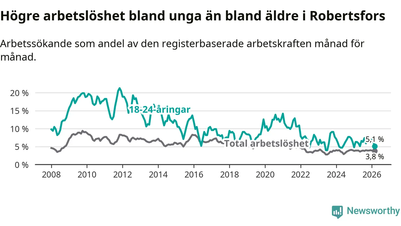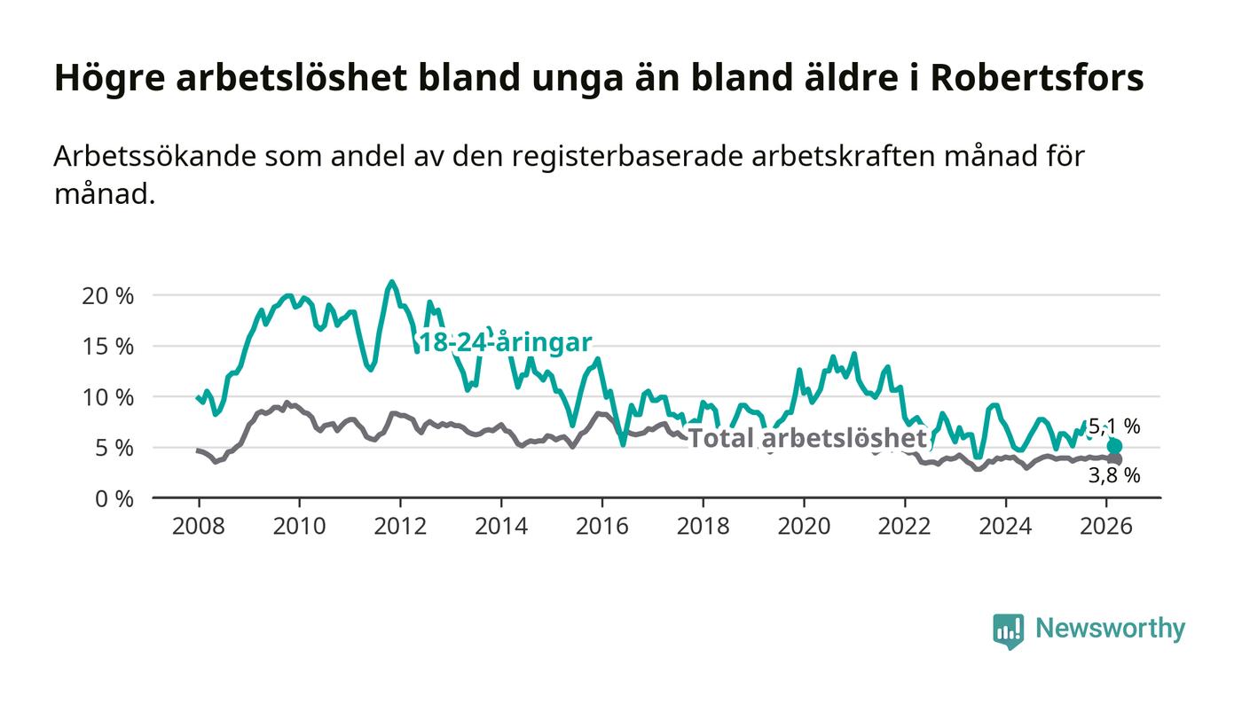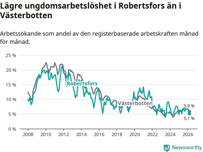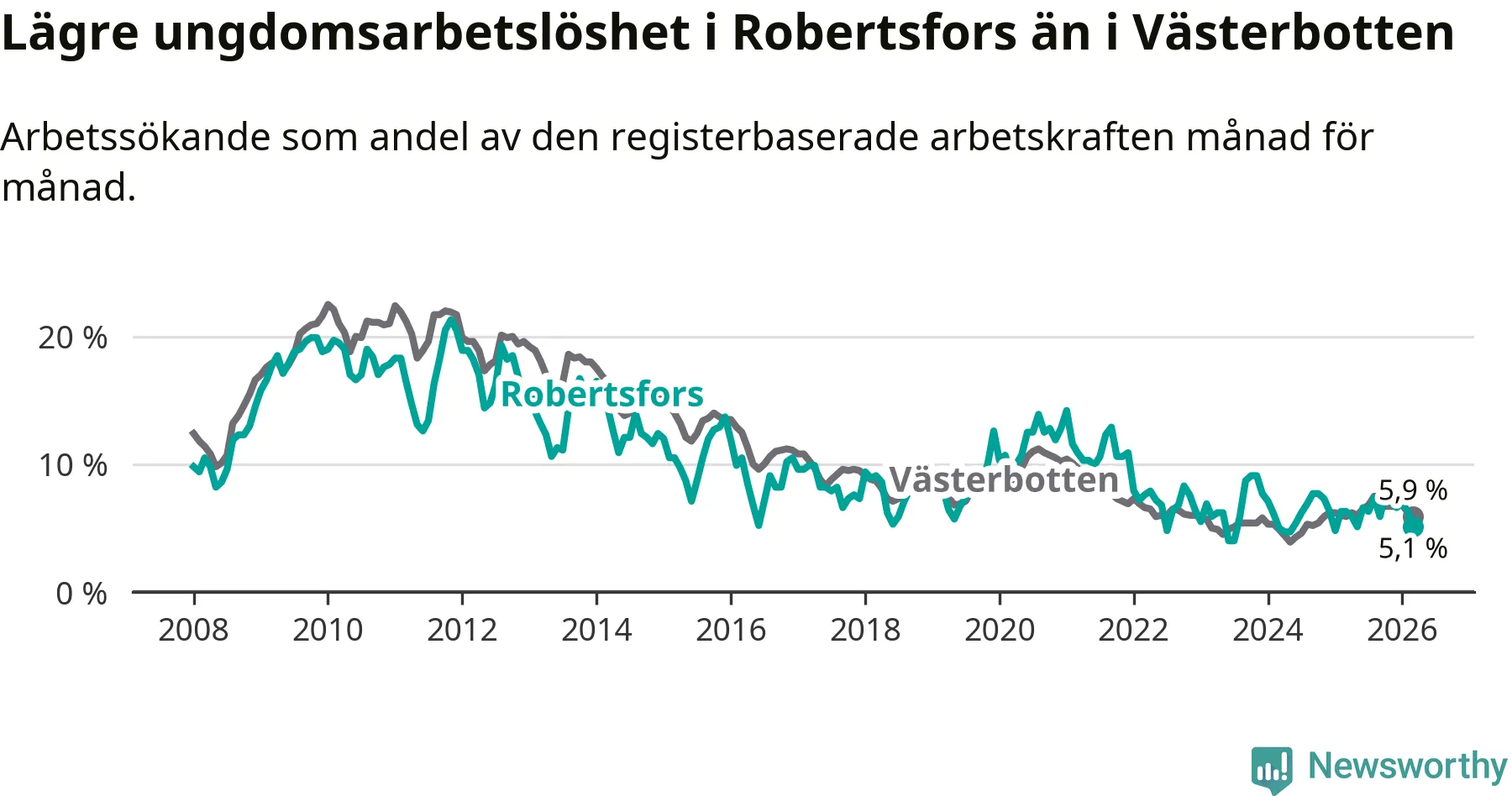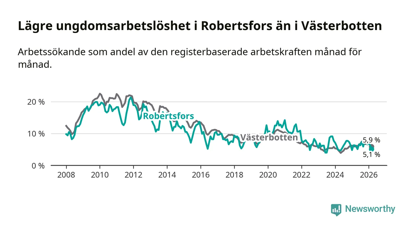 Graf: Arbetslöshet bland unga i Robertsfors kommun och Västerbottens län