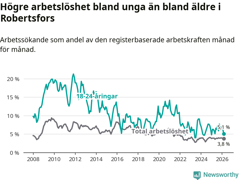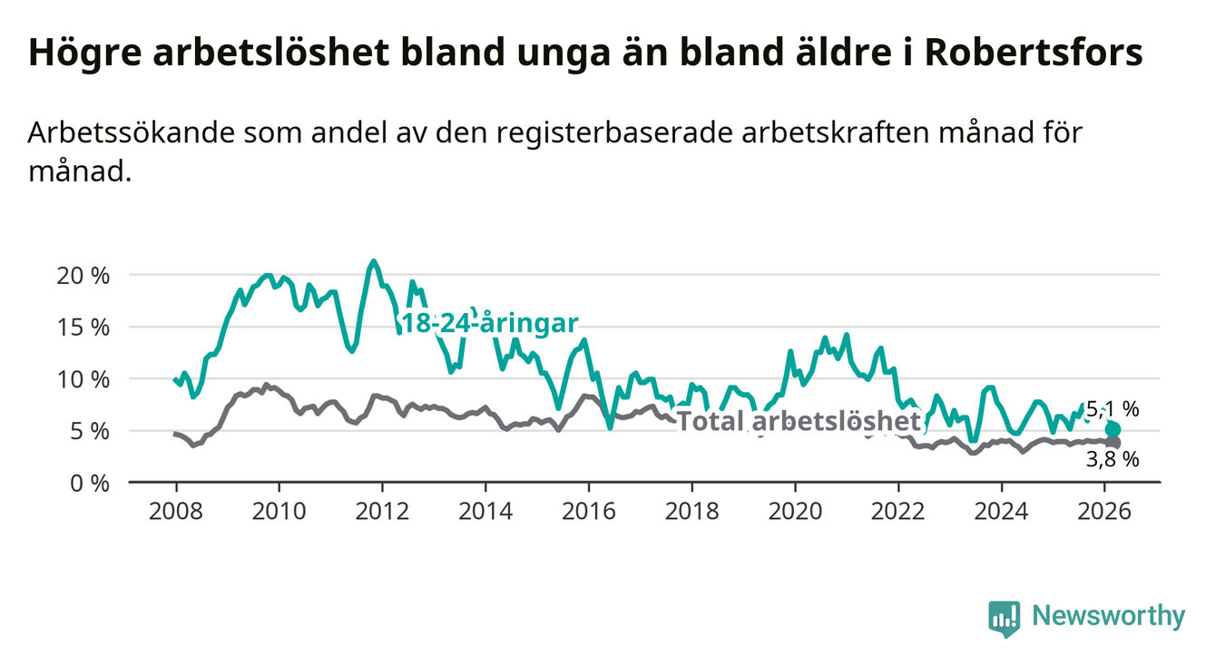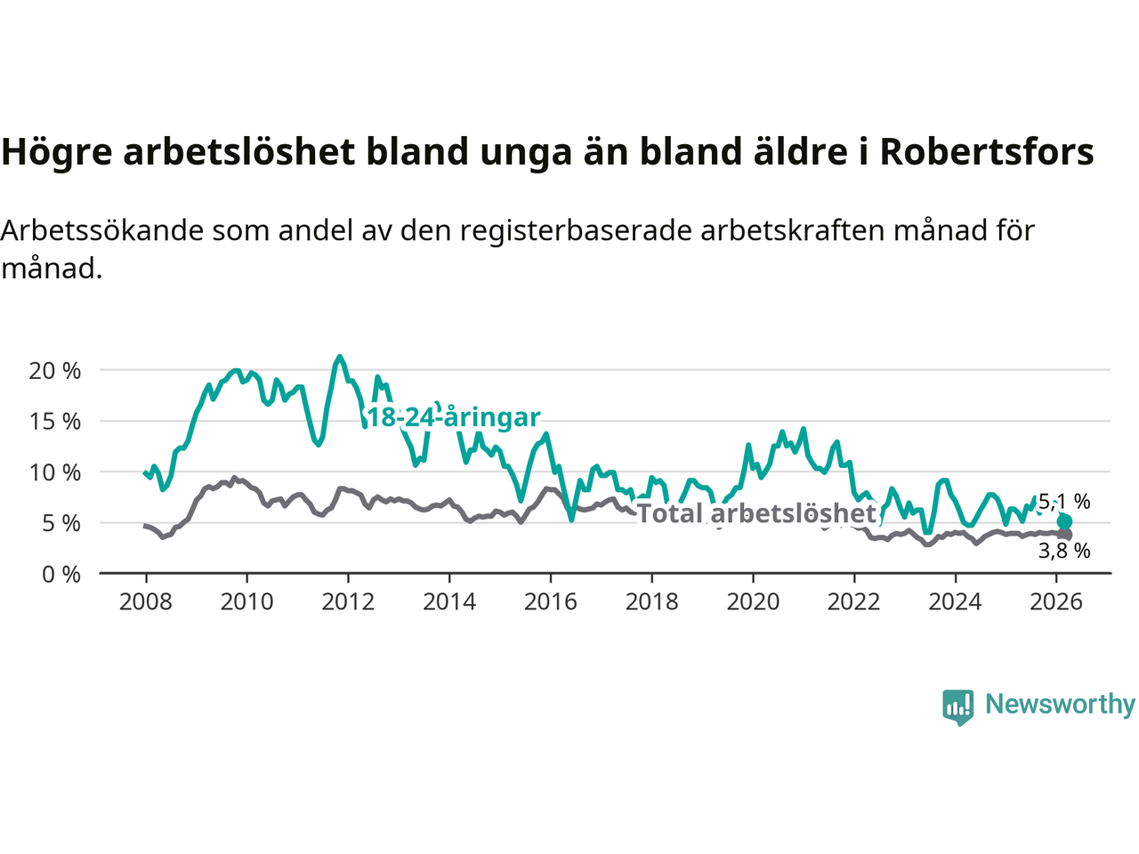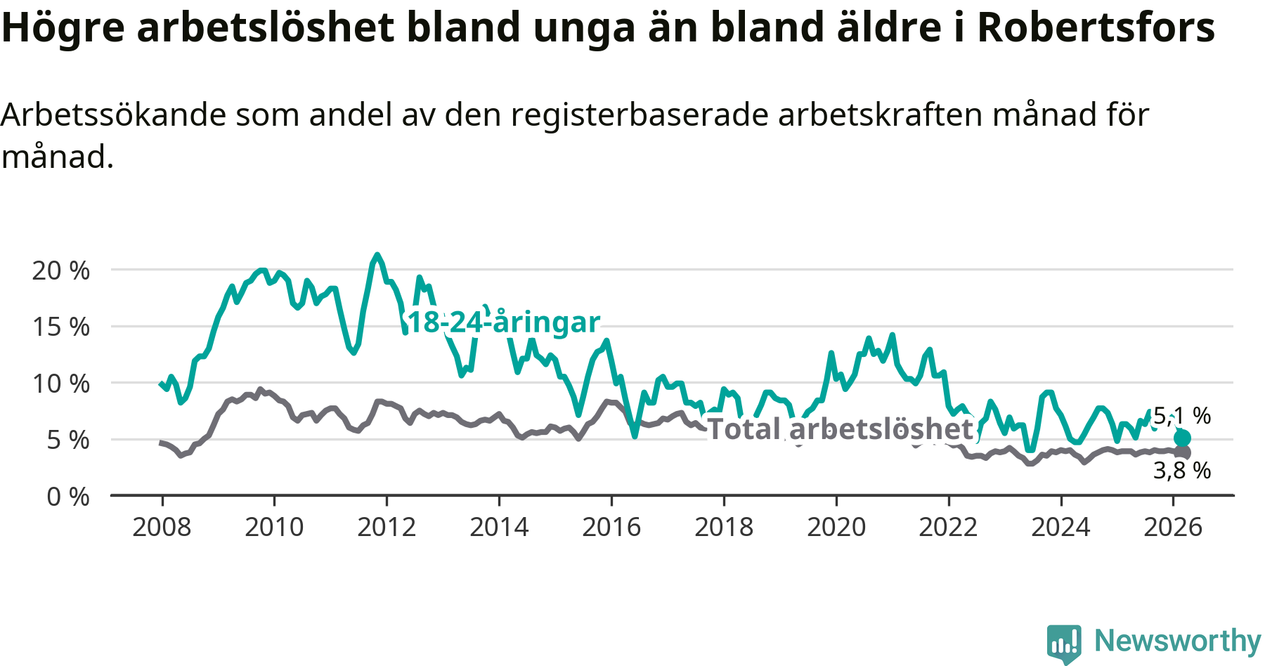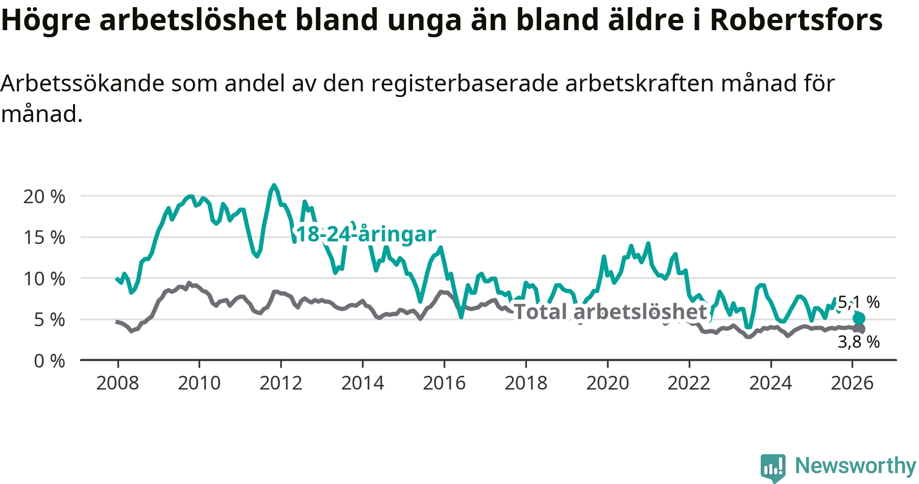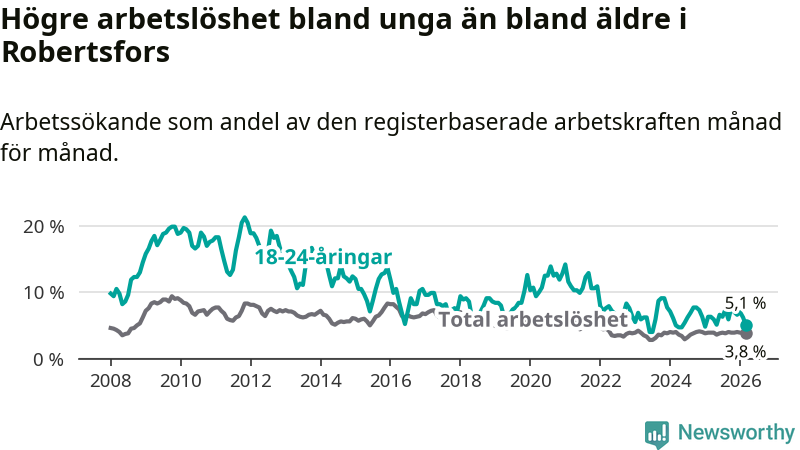 Graf: Arbetslöshet bland unga i Robertsfors kommun och Västerbottens län