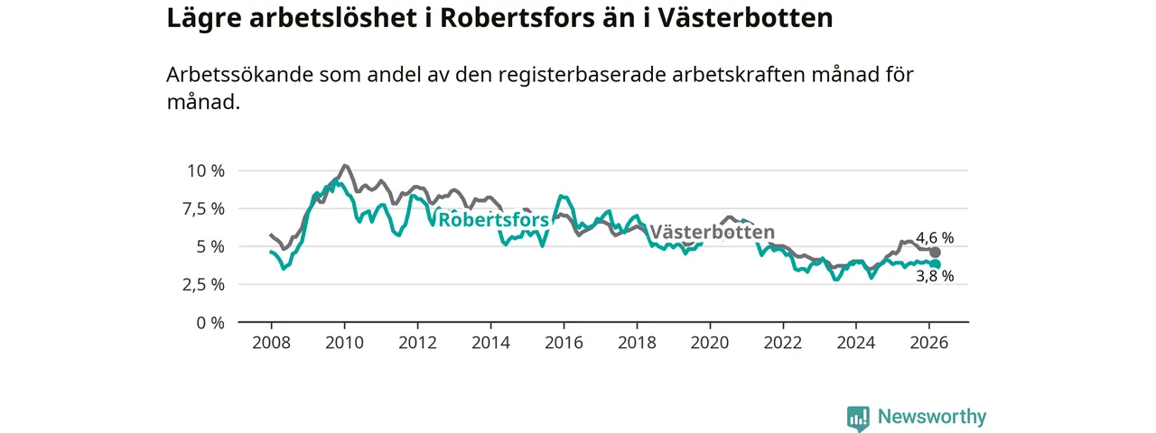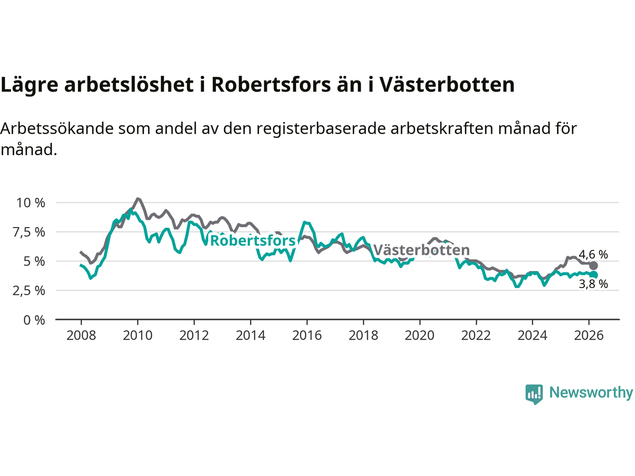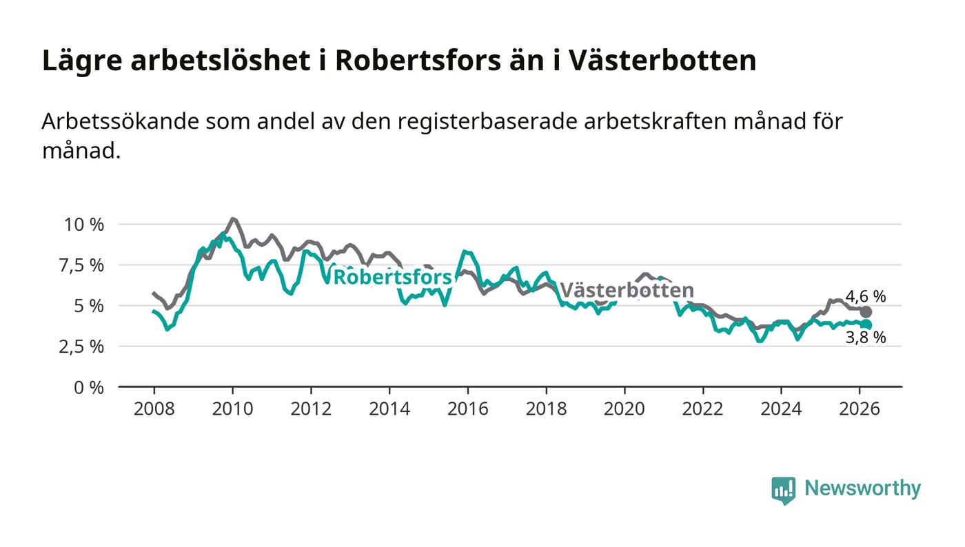 Under mars månad rapporterade Robertsfors kommun en total arbetslöshet på 3,8 procent. Det är en minskning jämfört med samma tidpunkt i fjol (−0,1 procentenheter). Även i Västerbottens län sjunker arbetslösheten något.