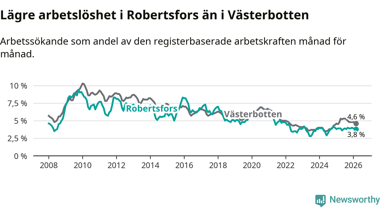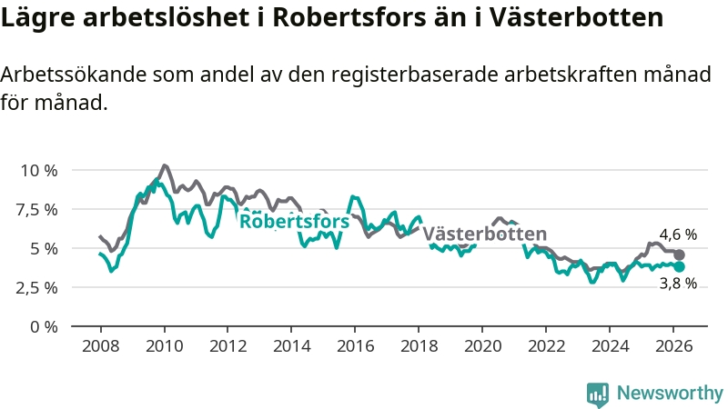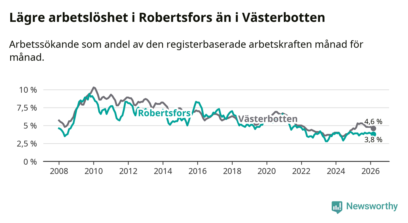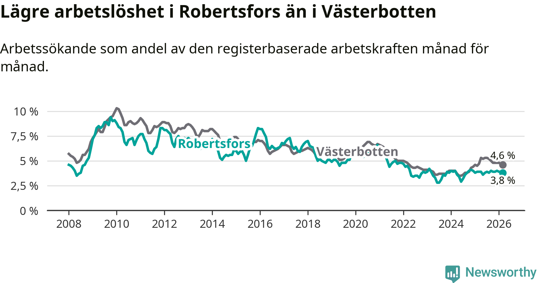 Under mars månad rapporterade Robertsfors kommun en total arbetslöshet på 3,8 procent. Det är en minskning jämfört med samma tidpunkt i fjol (−0,1 procentenheter). Även i Västerbottens län sjunker arbetslösheten något.