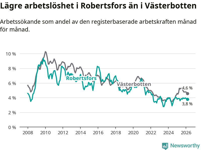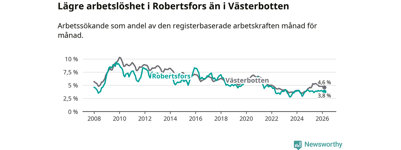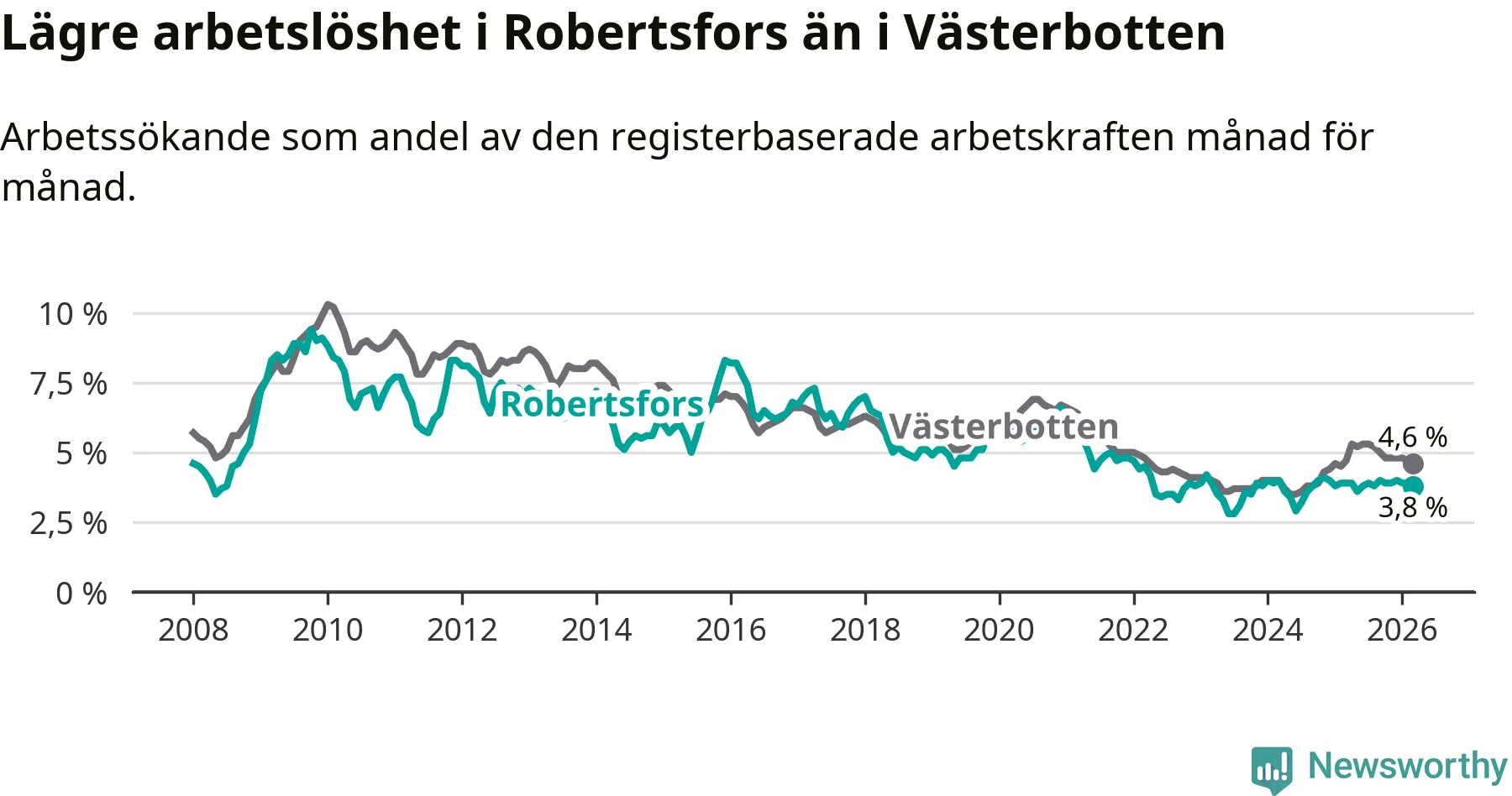 Graf: Arbetslöshet i Robertsfors kommun och Västerbottens län