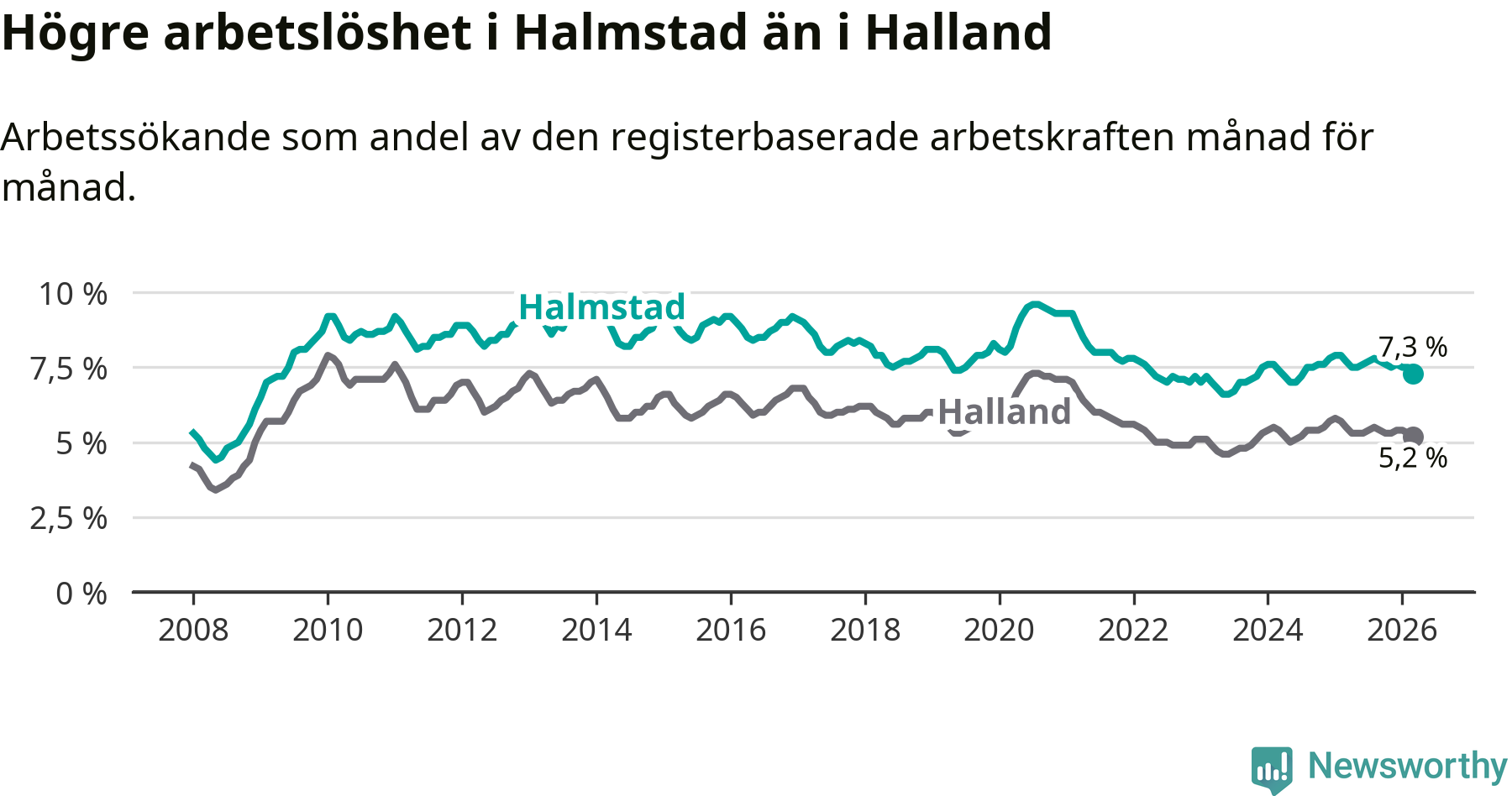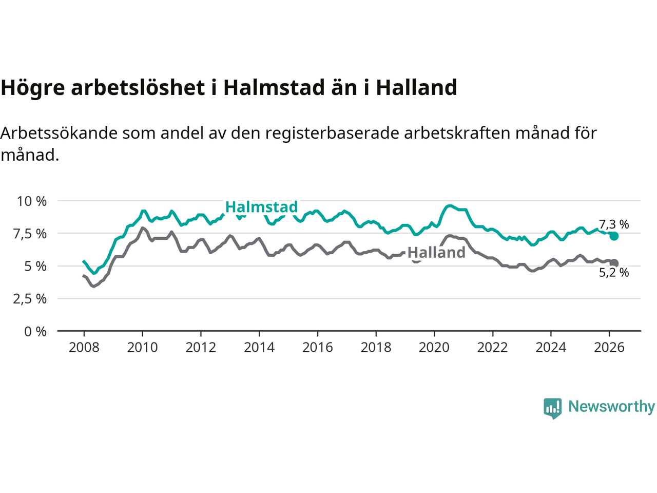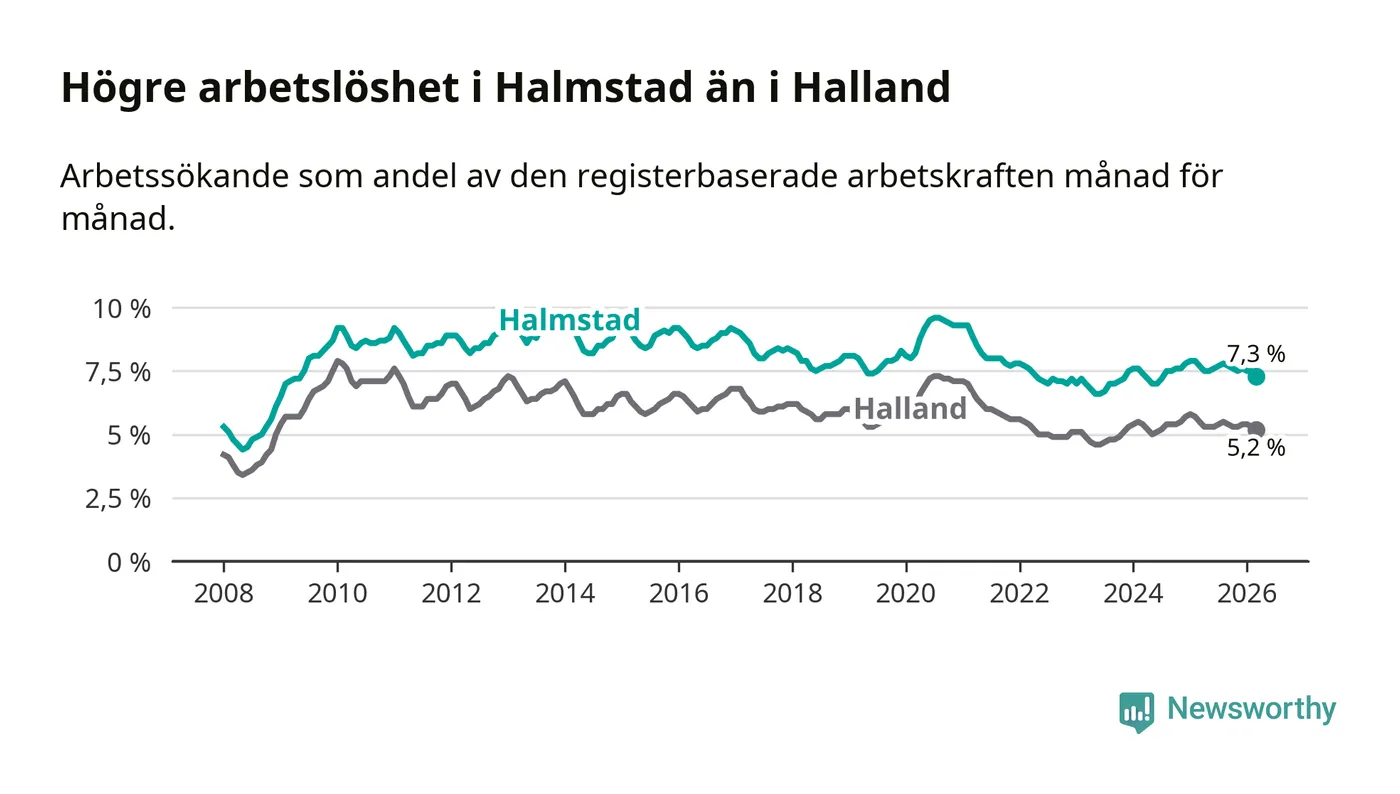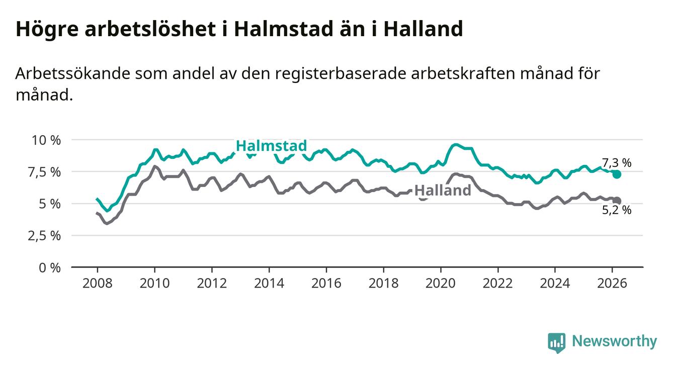 Under mars månad rapporterade Halmstads kommun en total arbetslöshet på 7,3 procent. Det är en minskning jämfört med samma tidpunkt i fjol (−0,4 procentenheter). Även i Hallands län sjunker arbetslösheten .