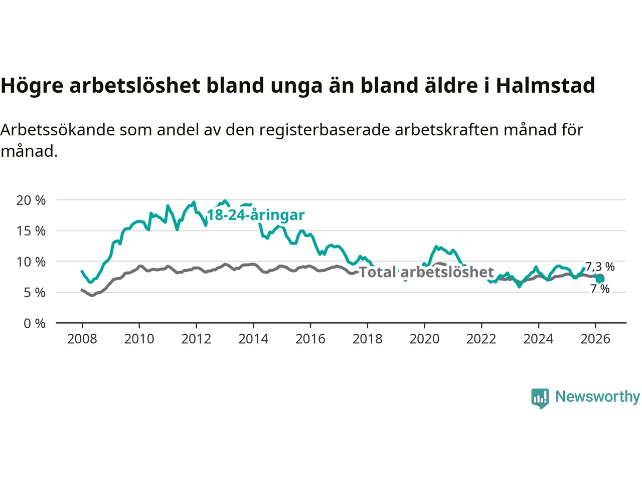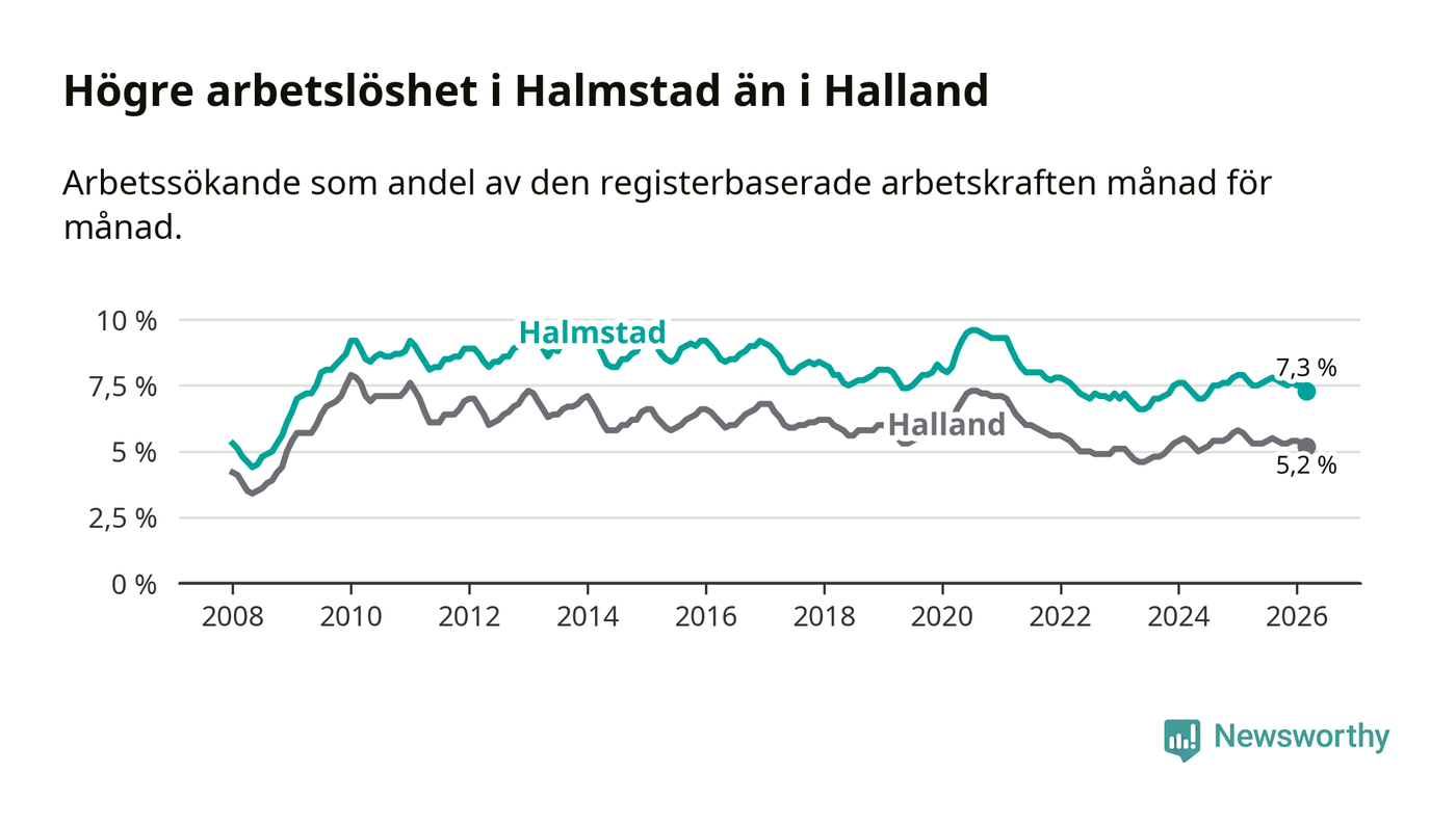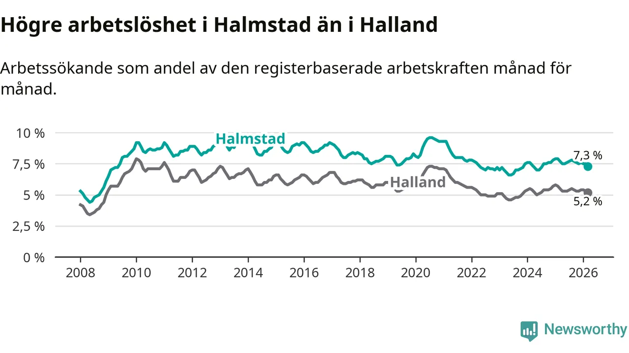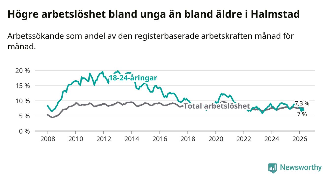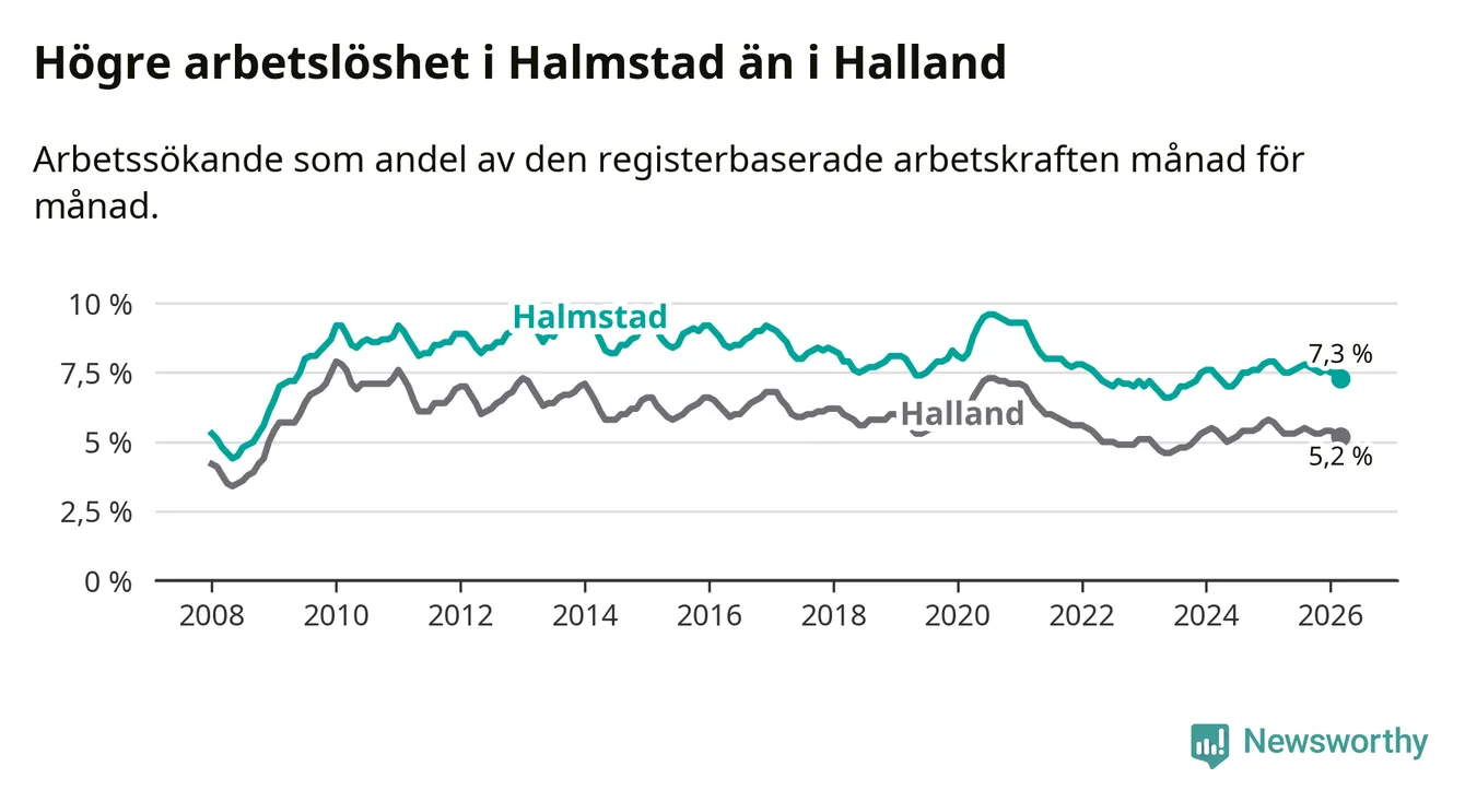 Under mars månad rapporterade Halmstads kommun en total arbetslöshet på 7,3 procent. Det är en minskning jämfört med samma tidpunkt i fjol (−0,4 procentenheter). Även i Hallands län sjunker arbetslösheten .