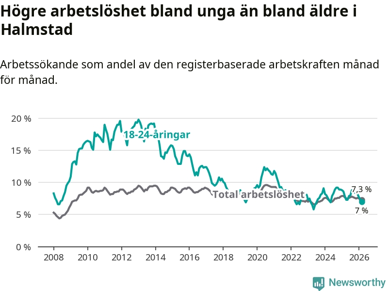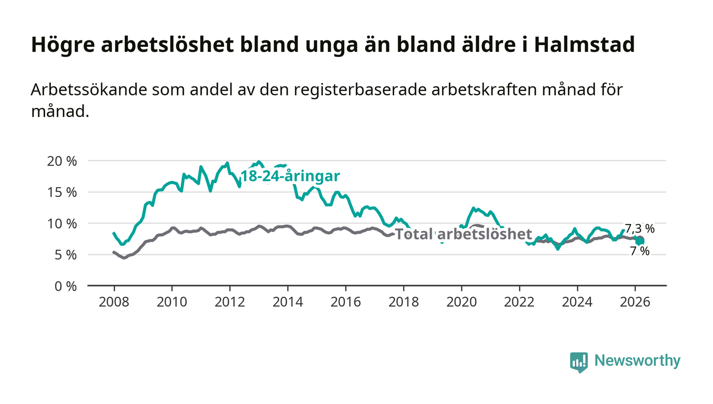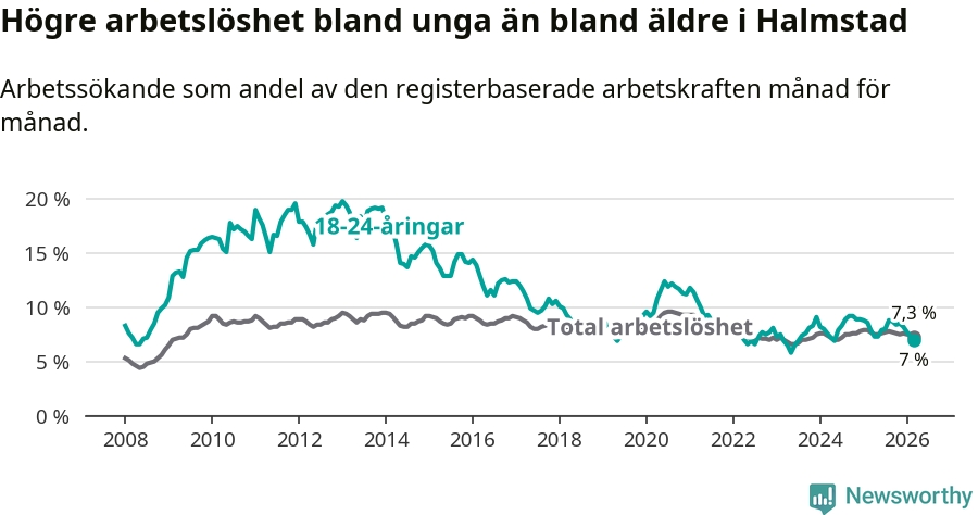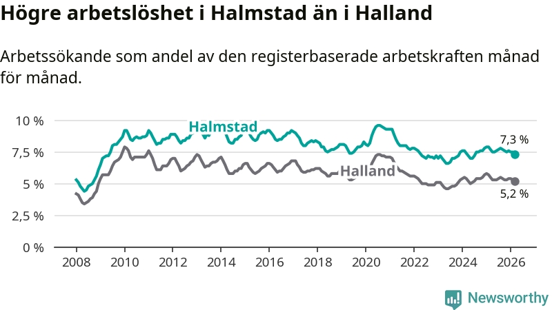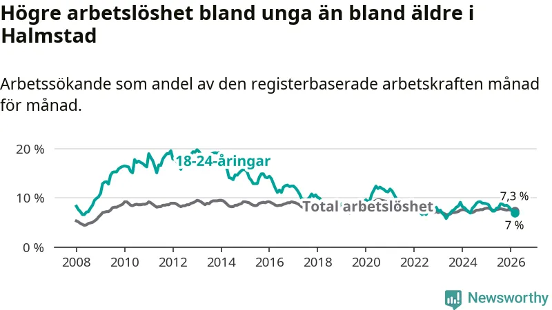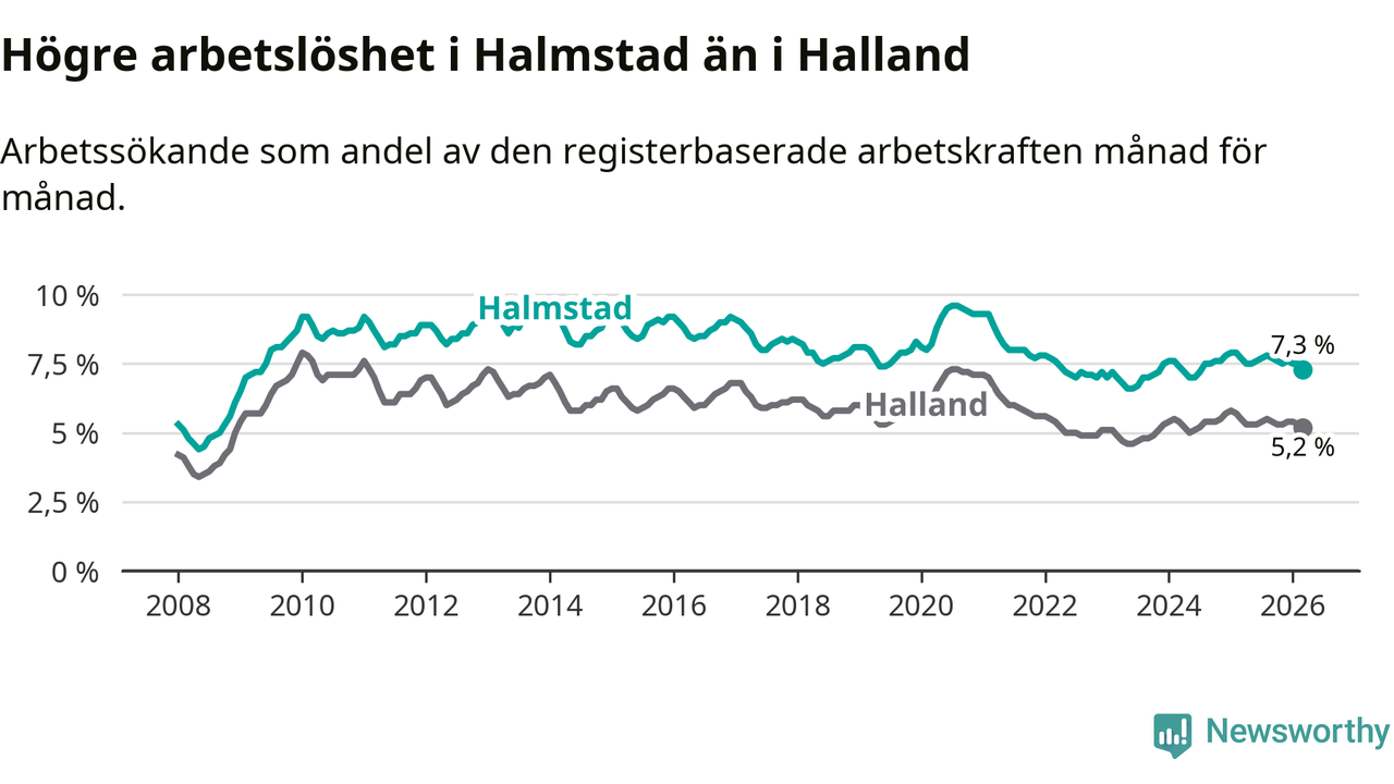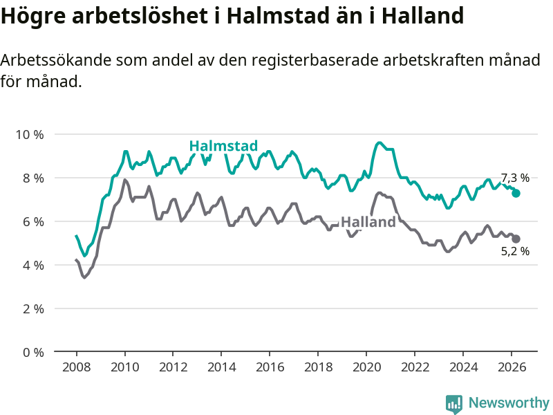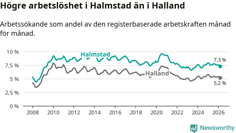 Under mars månad rapporterade Halmstads kommun en total arbetslöshet på 7,3 procent. Det är en minskning jämfört med samma tidpunkt i fjol (−0,4 procentenheter). Även i Hallands län sjunker arbetslösheten .