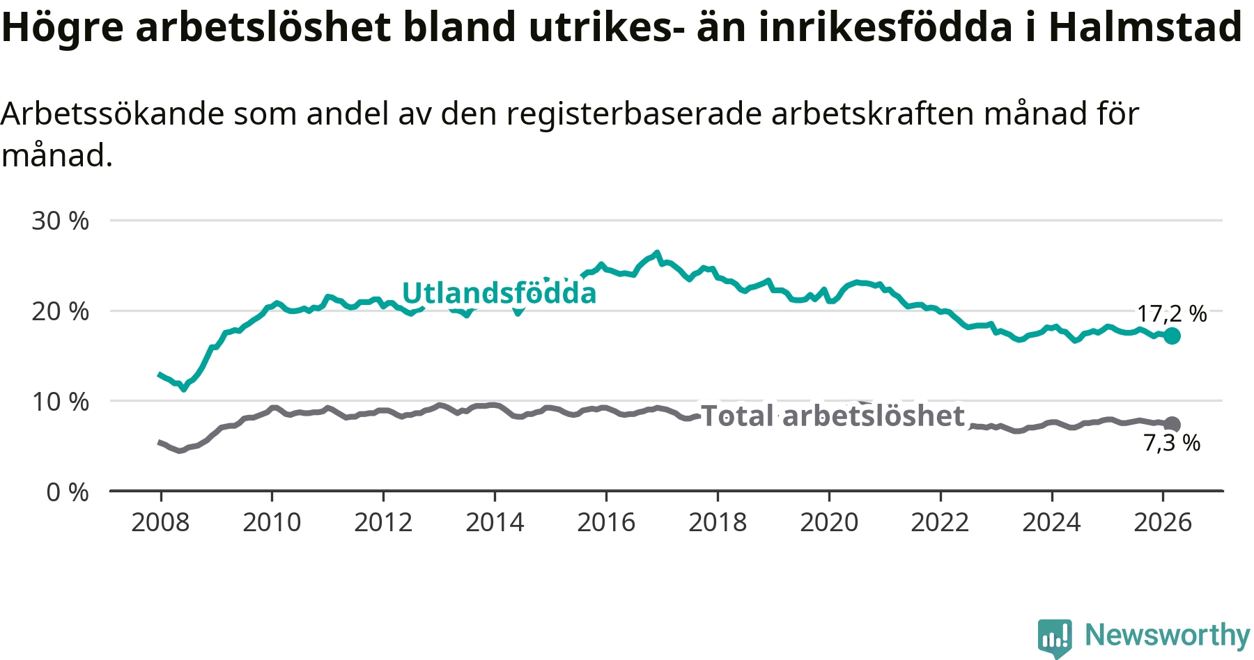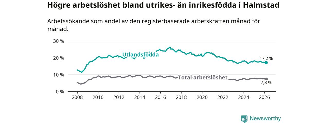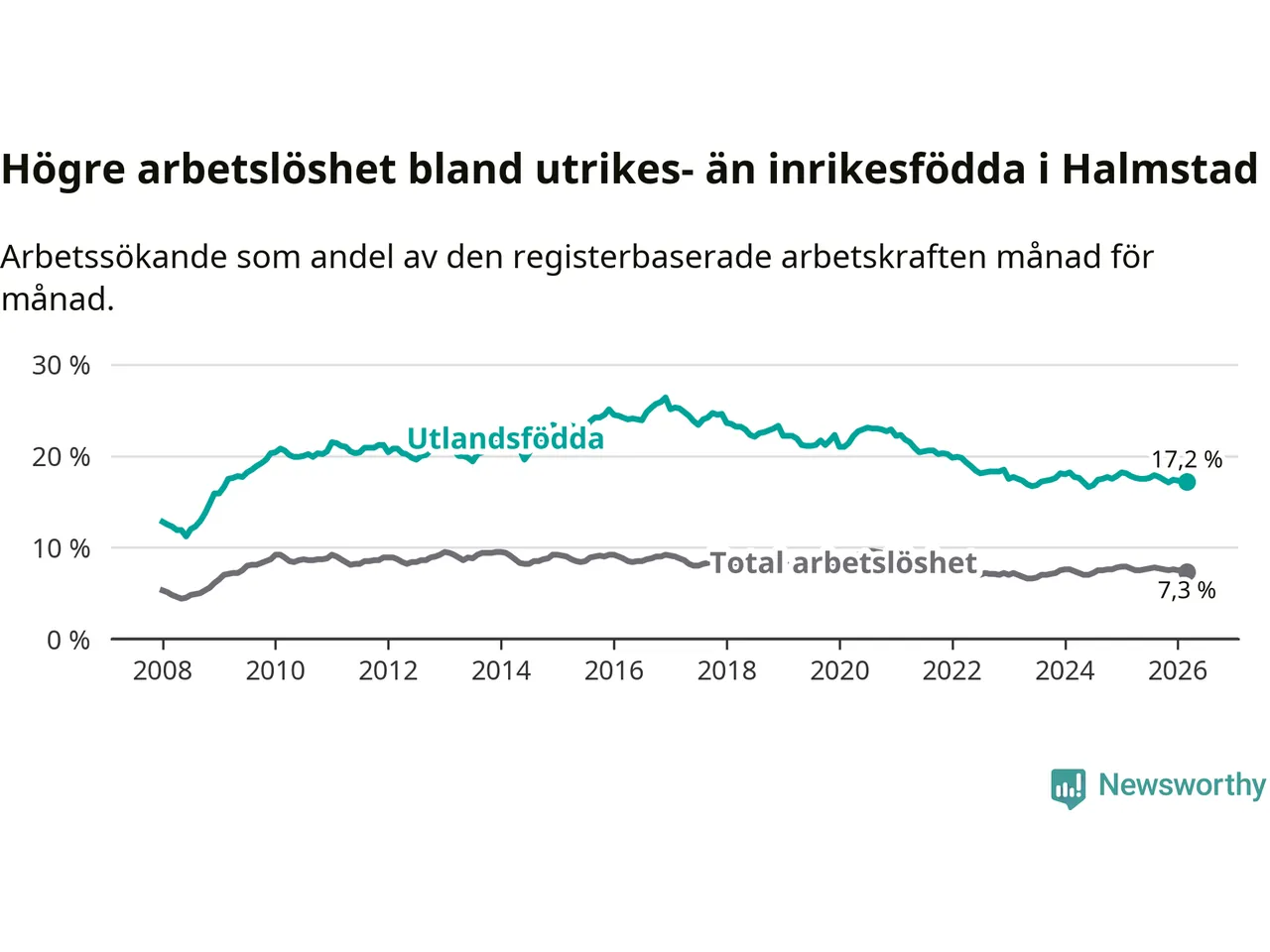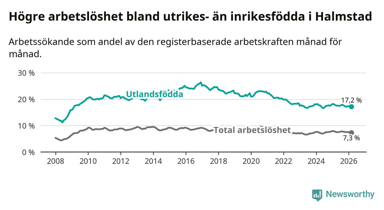 Arbetslösheten bland utlandsfödda var 17,2 procent i Halmstad under mars månad, motsvarande 2 255 av 13 110 personer. Det är 0,6 procentenheter färre än vid samma tidpunkt i fjol (−50 om man räknar personer). Därmed är de utlandsföddas arbetslöshet lägre än vid samma tidpunkt i fjol för sjätte månaden i följd.