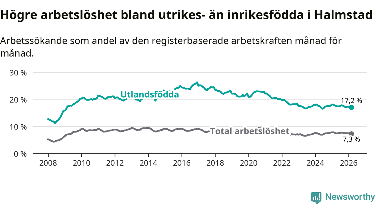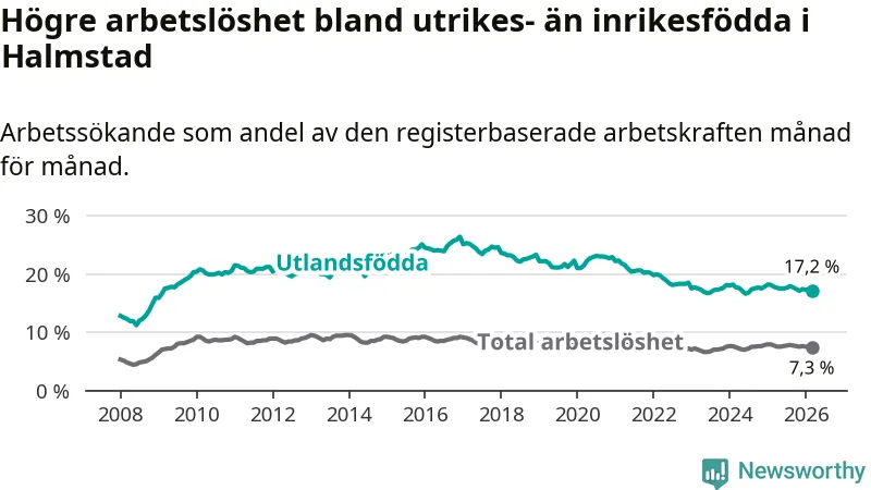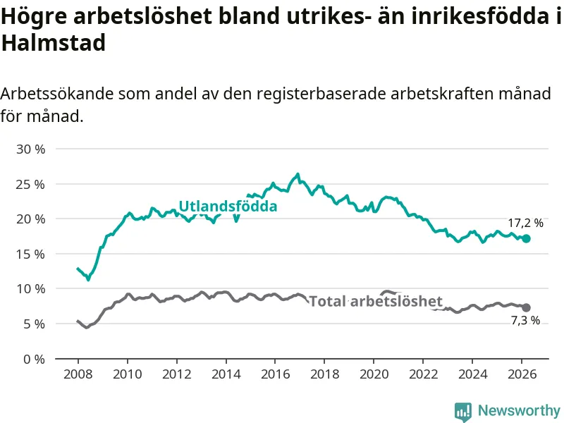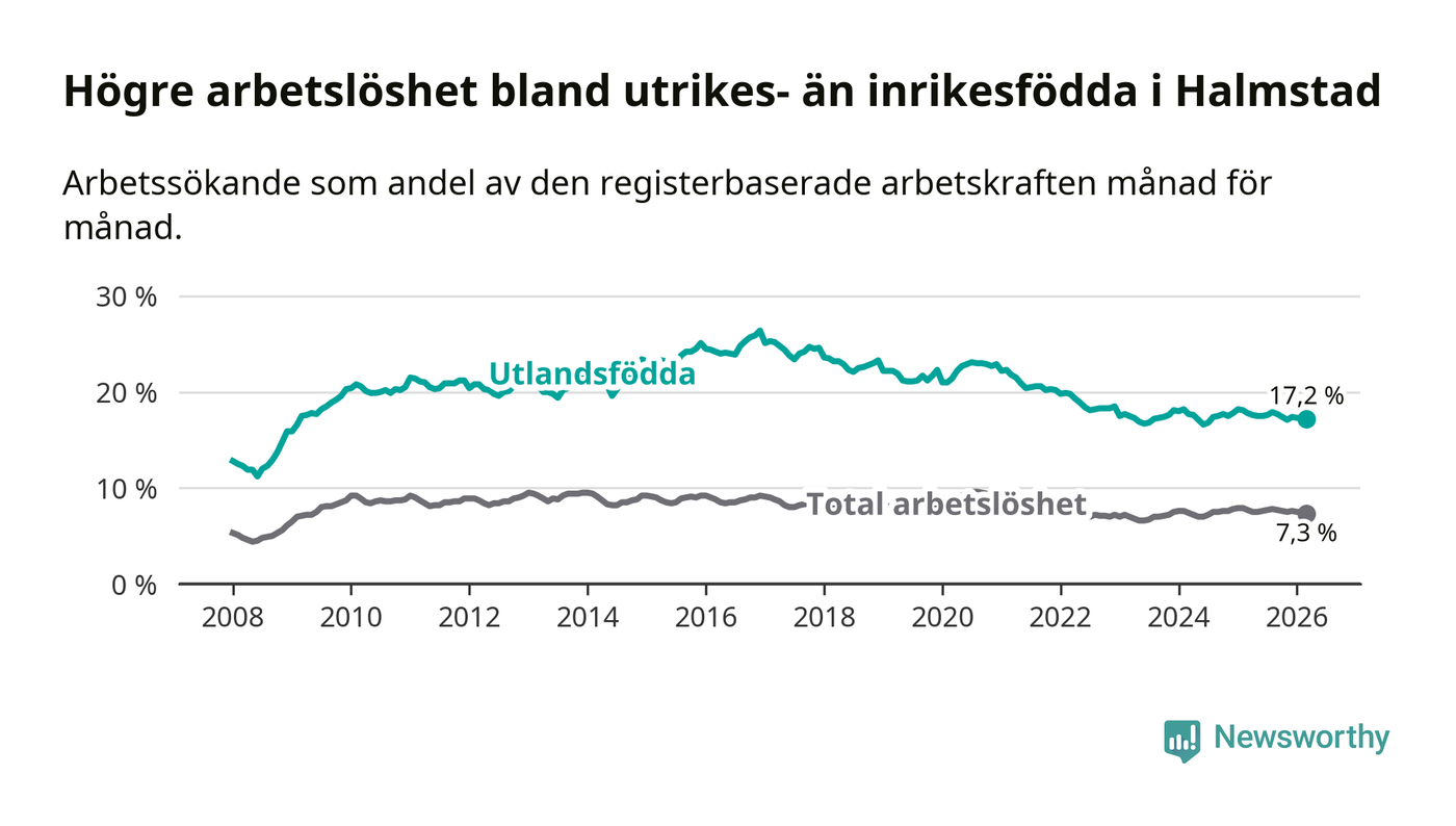 Arbetslösheten bland utlandsfödda var 17,2 procent i Halmstad under mars månad, motsvarande 2 255 av 13 110 personer. Det är 0,6 procentenheter färre än vid samma tidpunkt i fjol (−50 om man räknar personer). Därmed är de utlandsföddas arbetslöshet lägre än vid samma tidpunkt i fjol för sjätte månaden i följd.