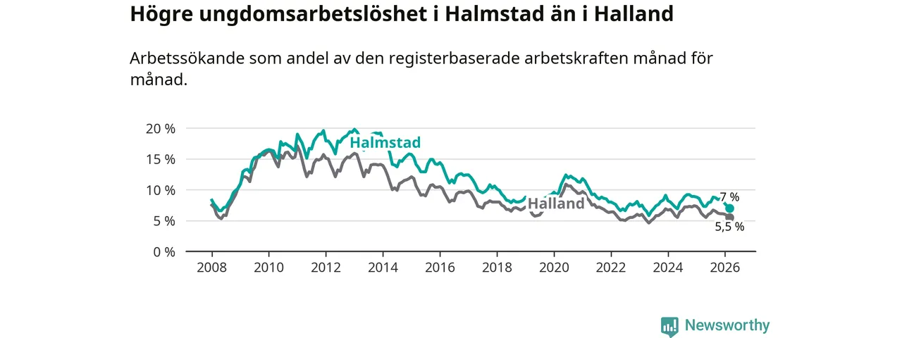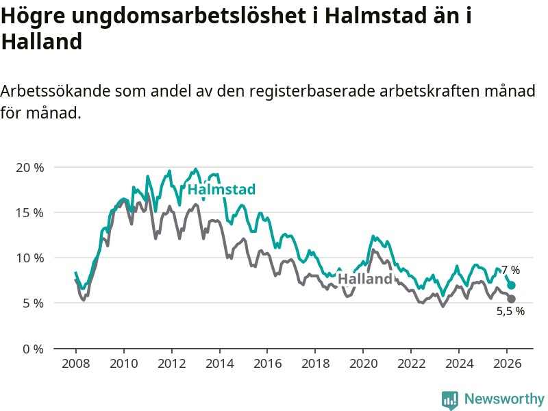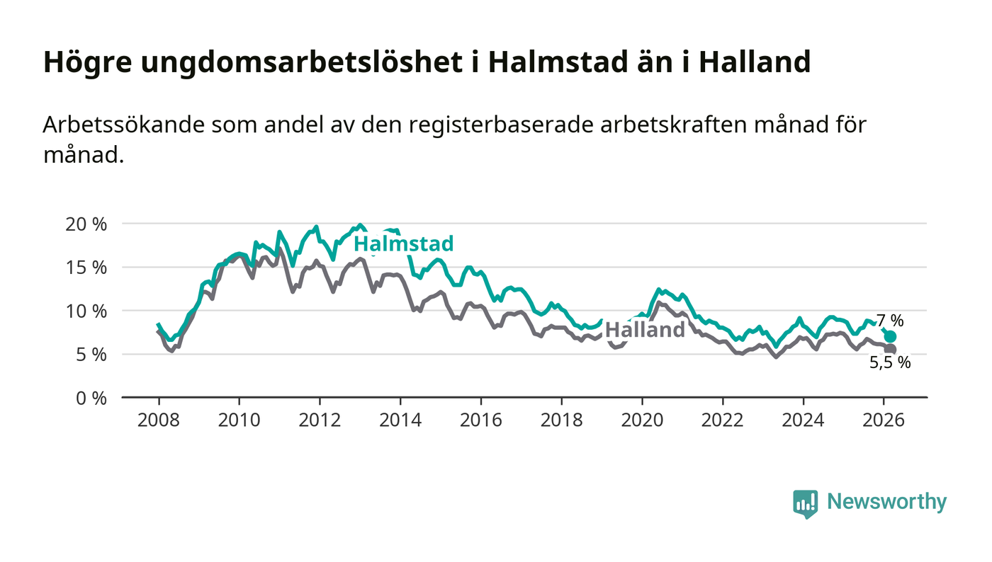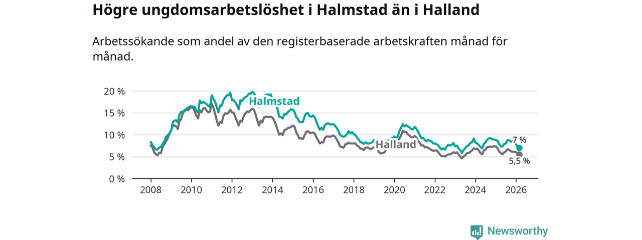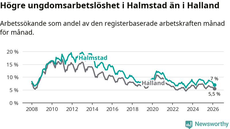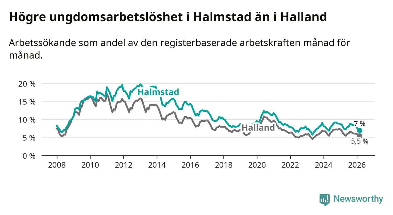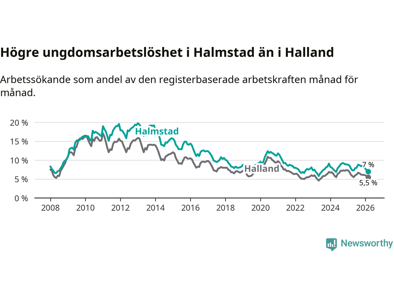 Precis som den totala arbetslösheten ligger ungdomsarbetslösheten i Halmstad högre än i Halland som helhet. Skillnaden mellan kommunen och länet är 1,5 procentenheter.
