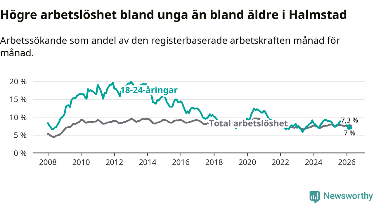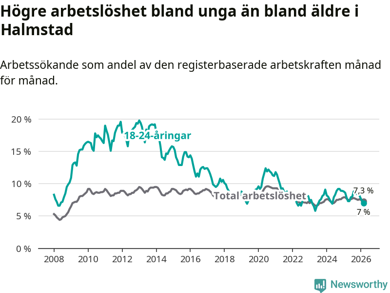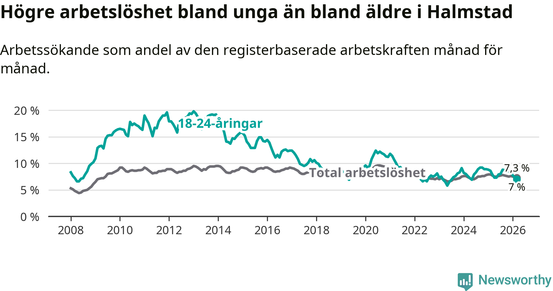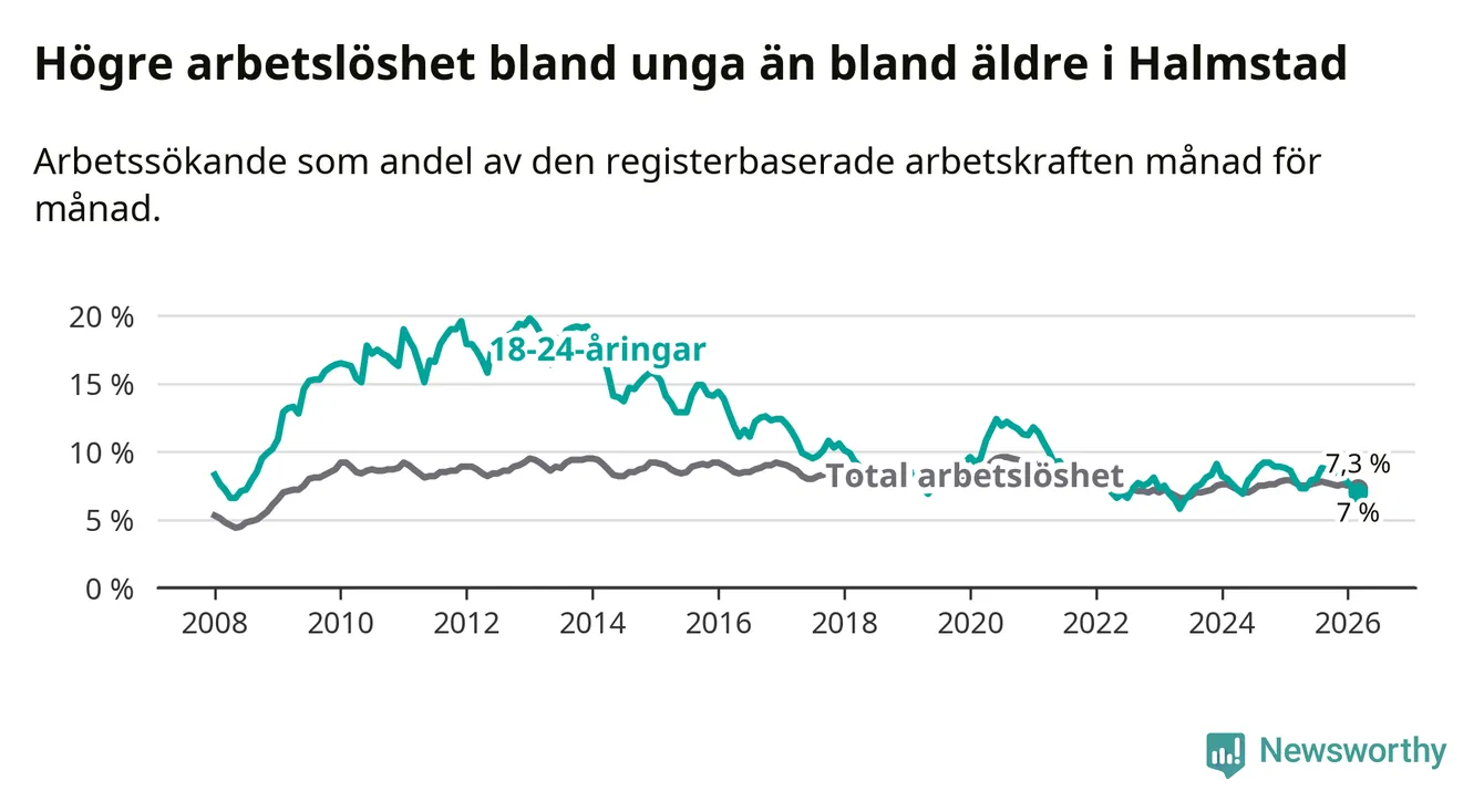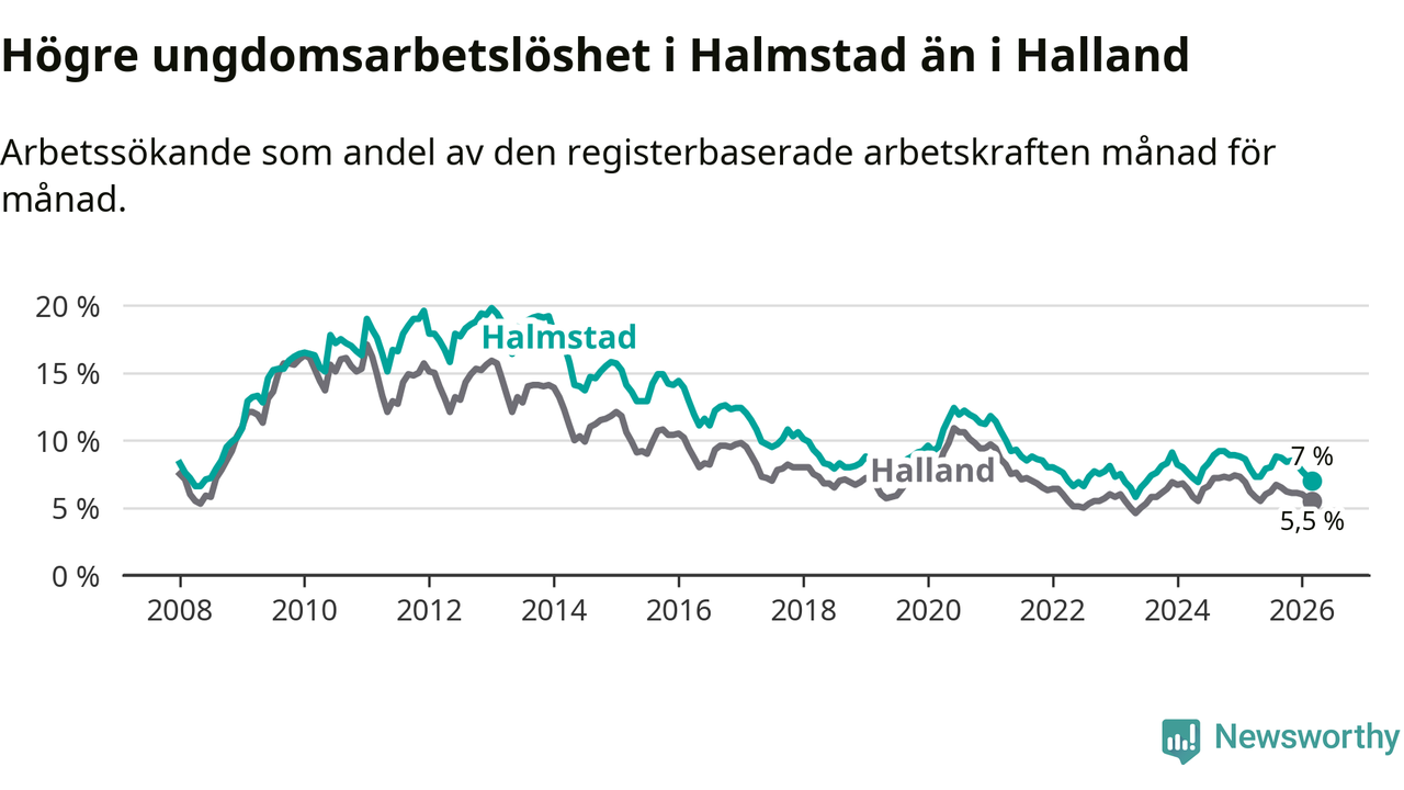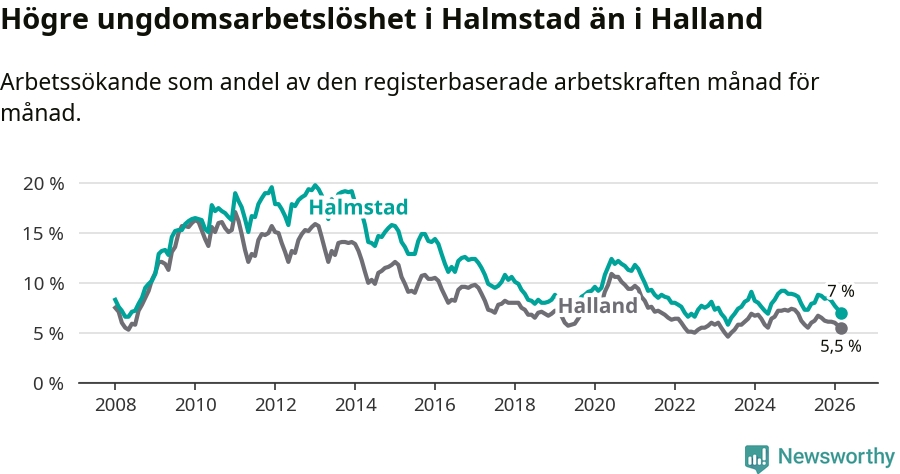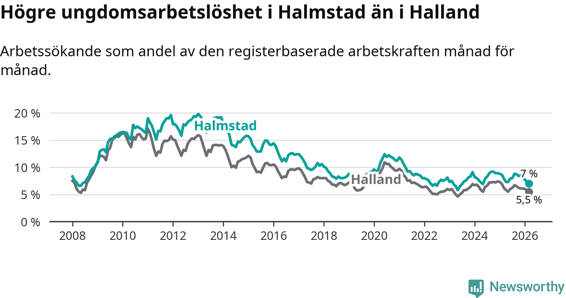 Precis som den totala arbetslösheten ligger ungdomsarbetslösheten i Halmstad högre än i Halland som helhet. Skillnaden mellan kommunen och länet är 1,5 procentenheter.