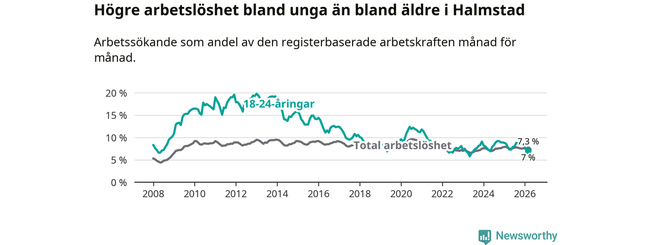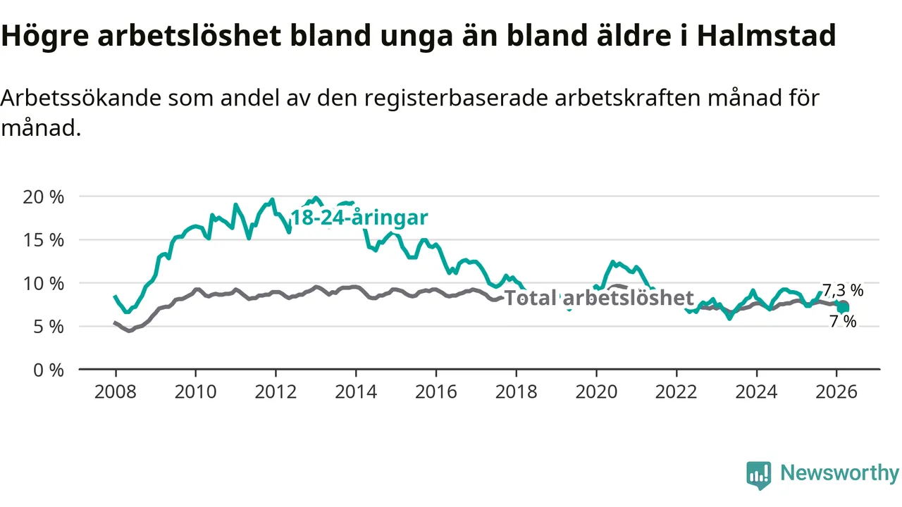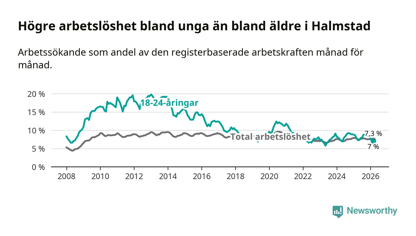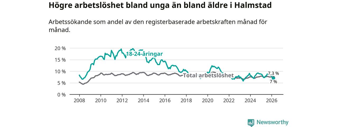 I och med den senaste månadens nedgång har de ungas arbetslöshet i Halmstad sjunkit nio månader i följd (ner från 7,9 procent i juni 2025 till 7,0 procent nu).