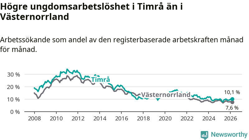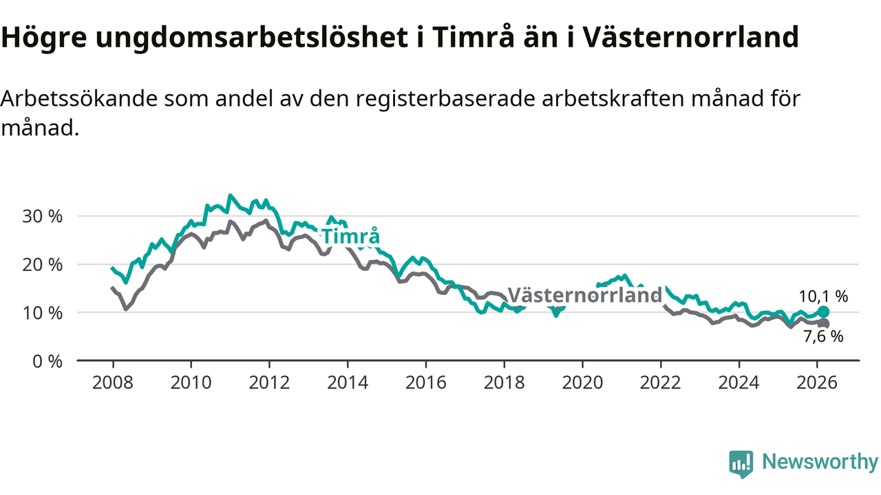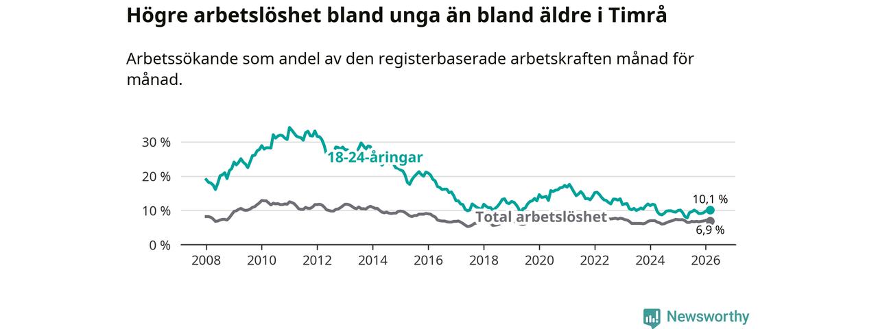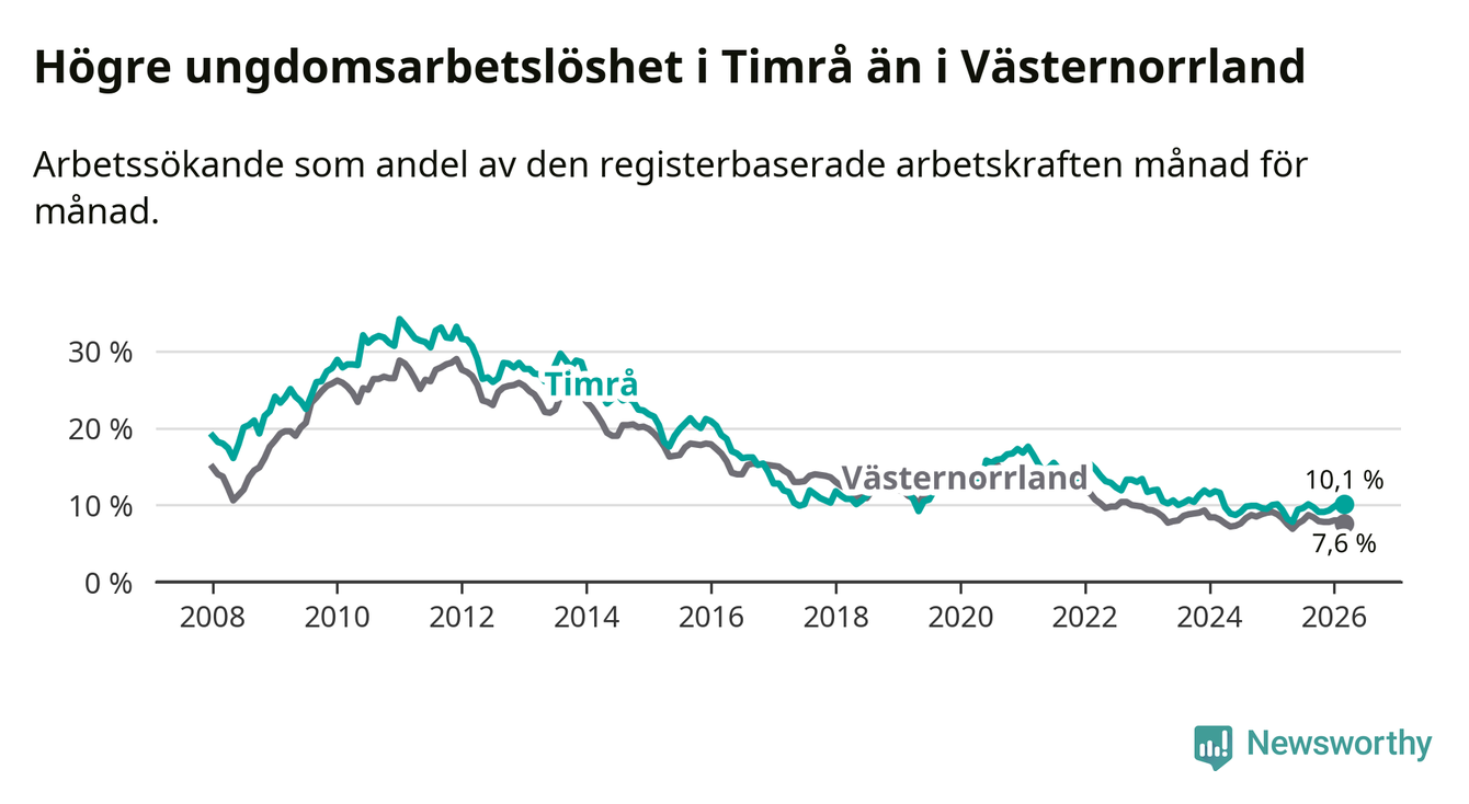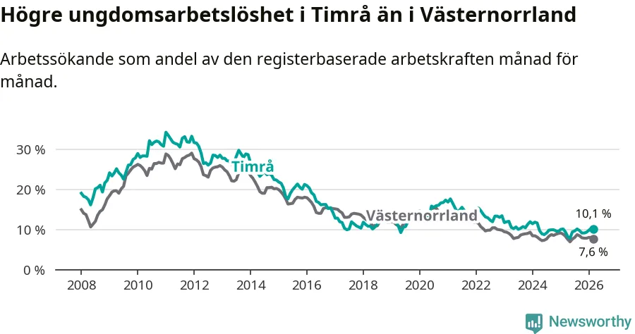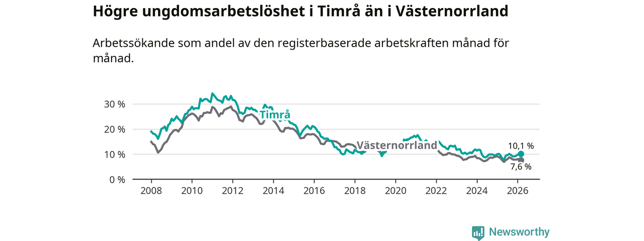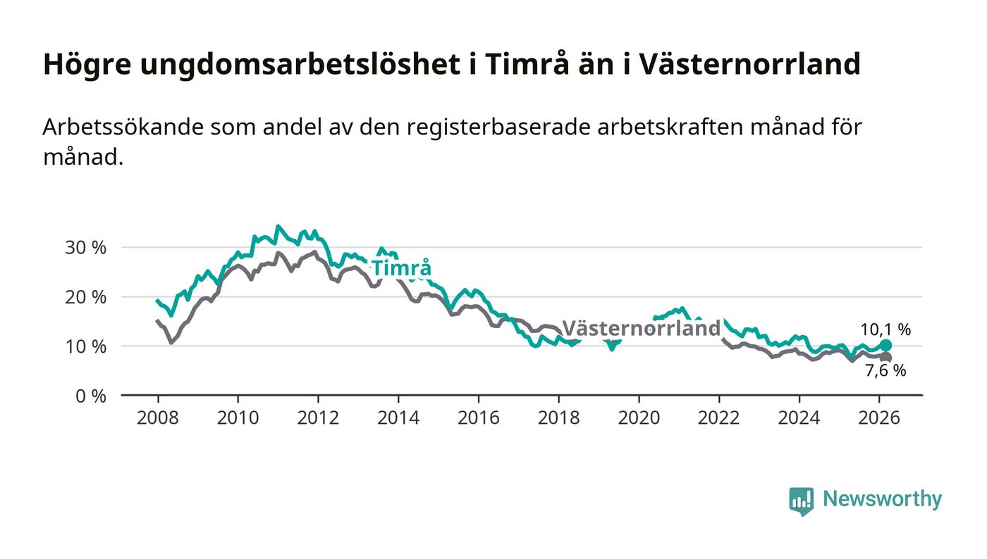 Precis som den totala arbetslösheten ligger ungdomsarbetslösheten i Timrå högre än i Västernorrland som helhet. Skillnaden mellan kommunen och länet är 2,5 procentenheter.