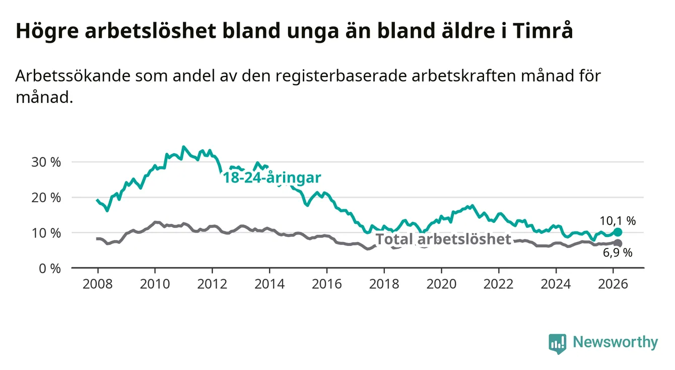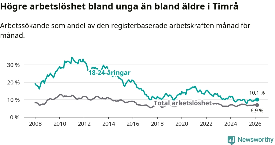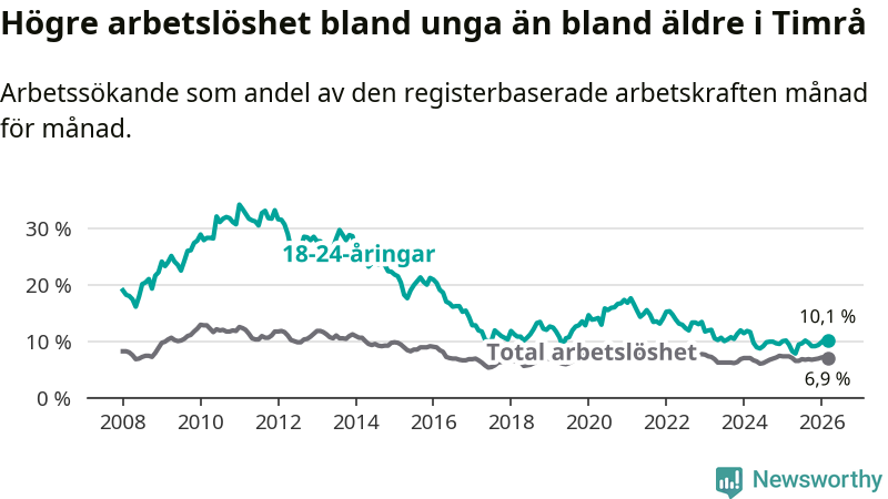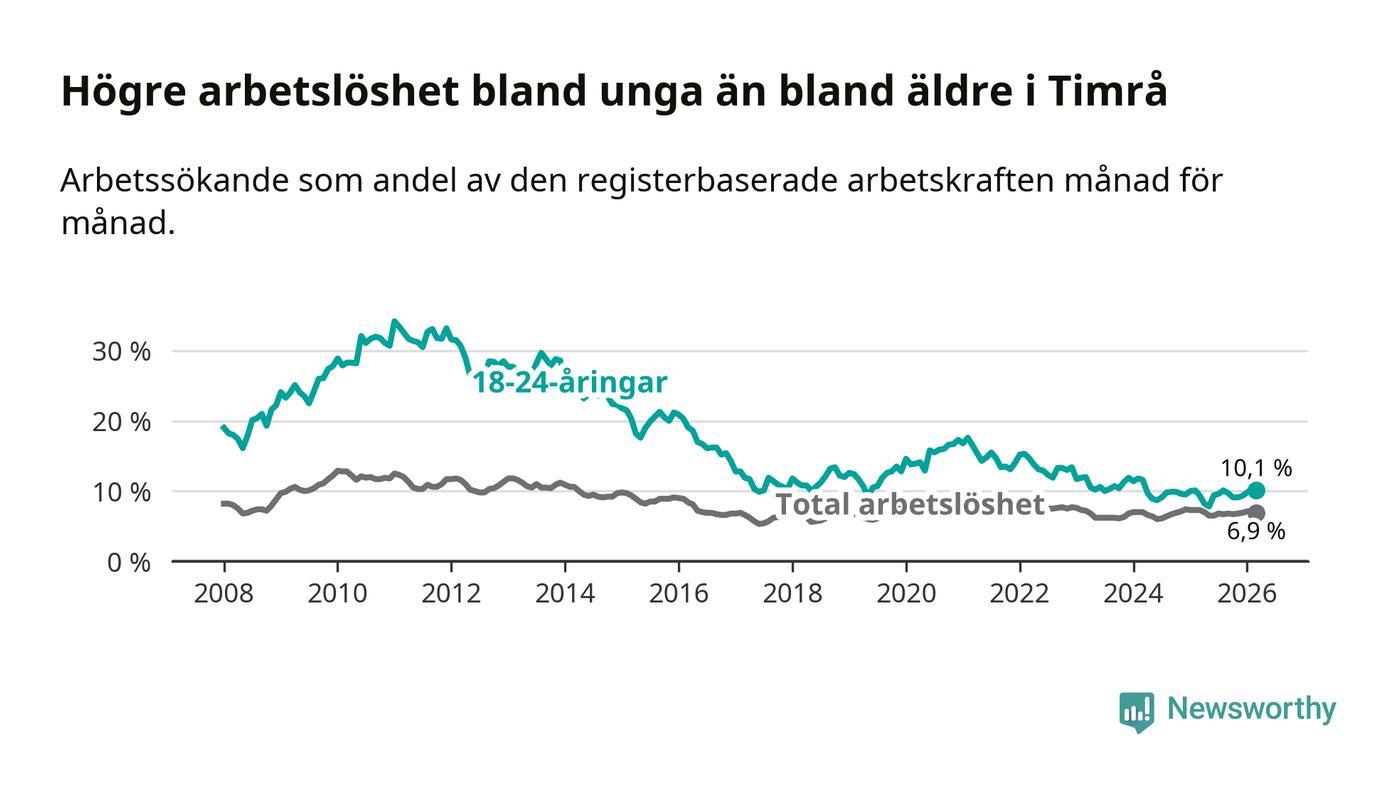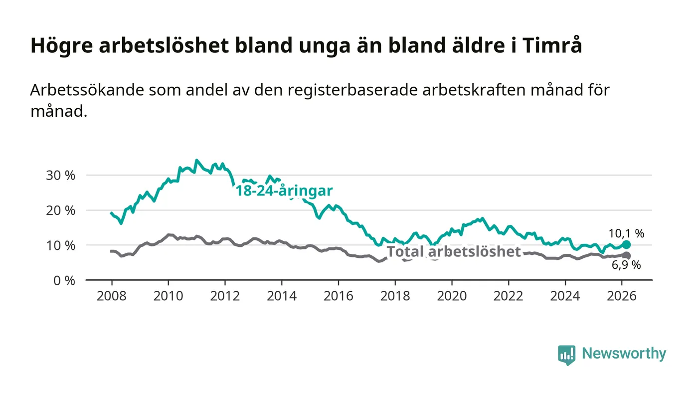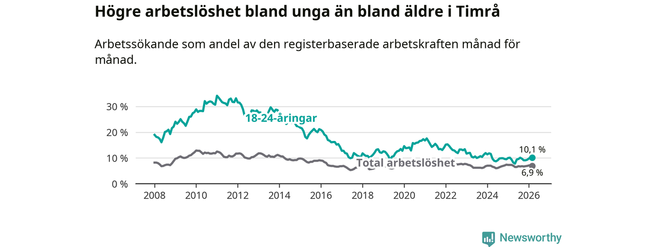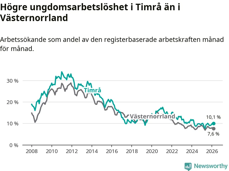 Precis som den totala arbetslösheten ligger ungdomsarbetslösheten i Timrå högre än i Västernorrland som helhet. Skillnaden mellan kommunen och länet är 2,5 procentenheter.