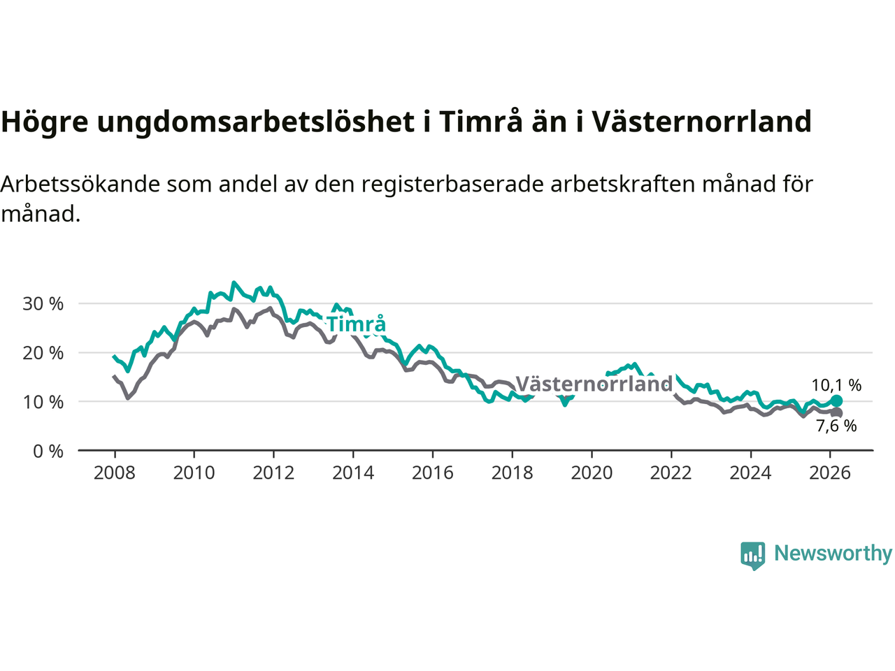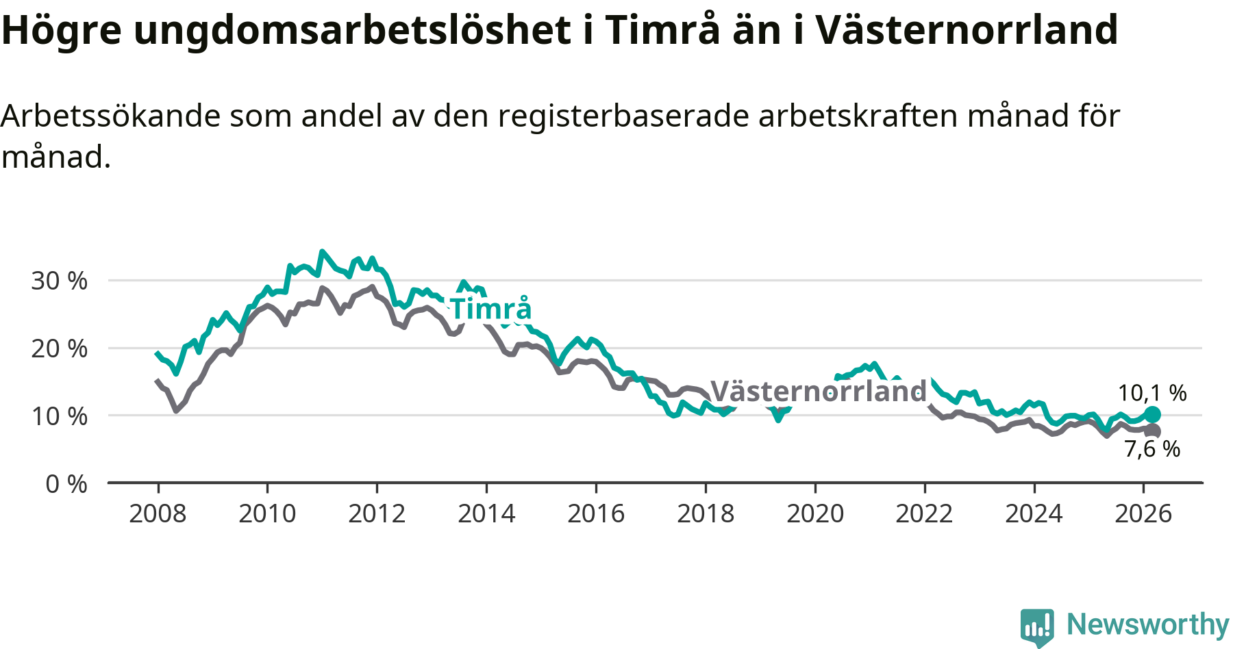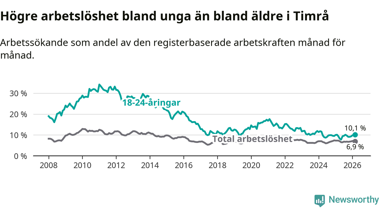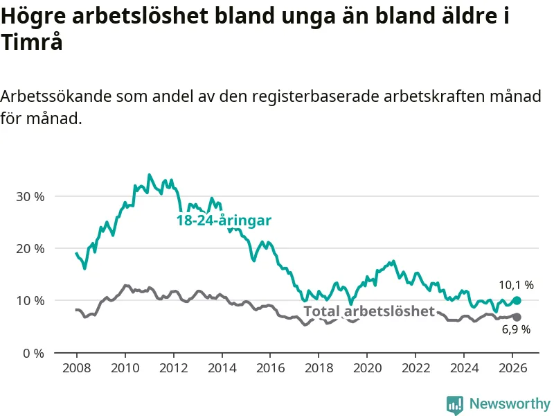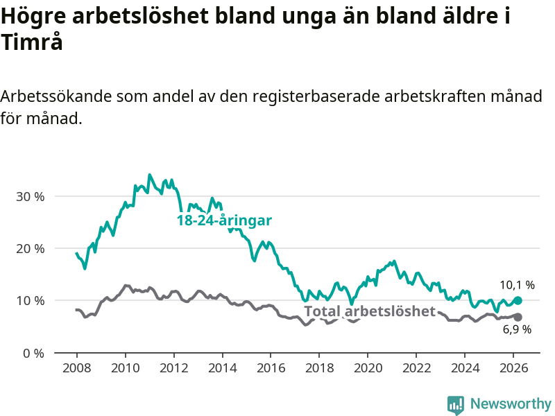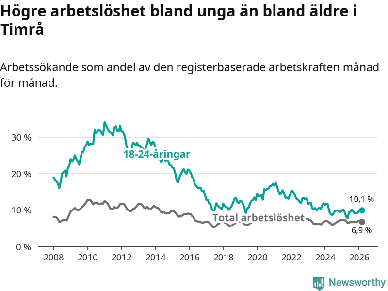 Precis som den totala arbetslösheten ligger ungdomsarbetslösheten i Timrå högre än i Västernorrland som helhet. Skillnaden mellan kommunen och länet är 2,5 procentenheter.