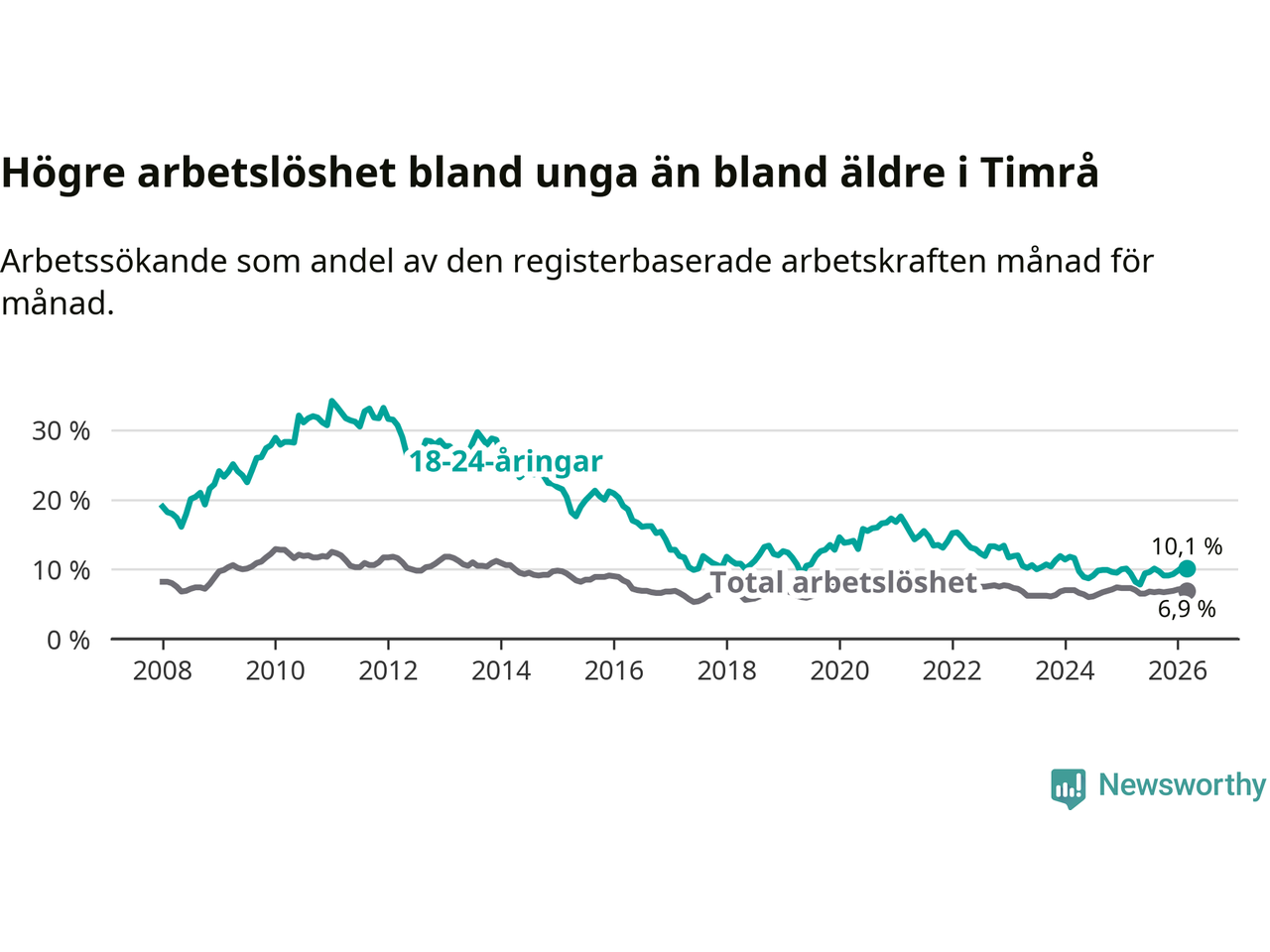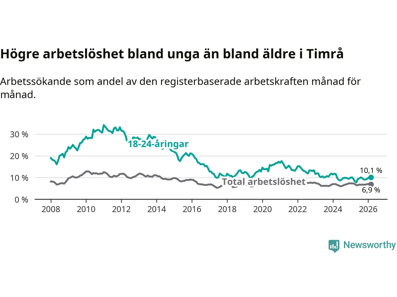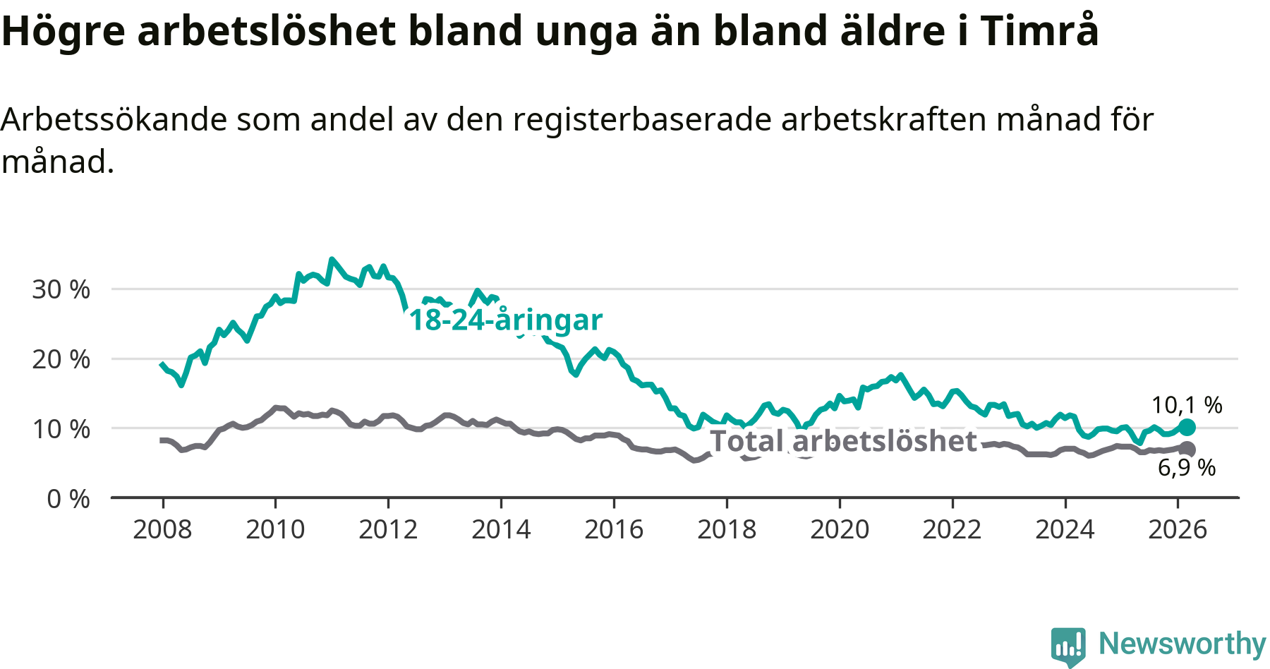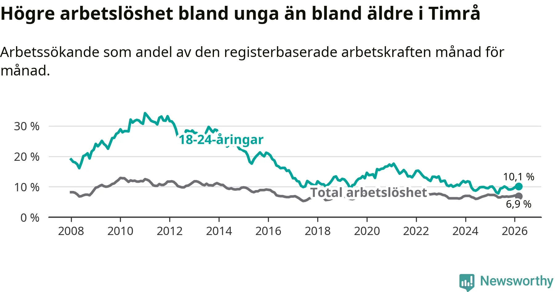 Precis som den totala arbetslösheten ligger ungdomsarbetslösheten i Timrå högre än i Västernorrland som helhet. Skillnaden mellan kommunen och länet är 2,5 procentenheter.
