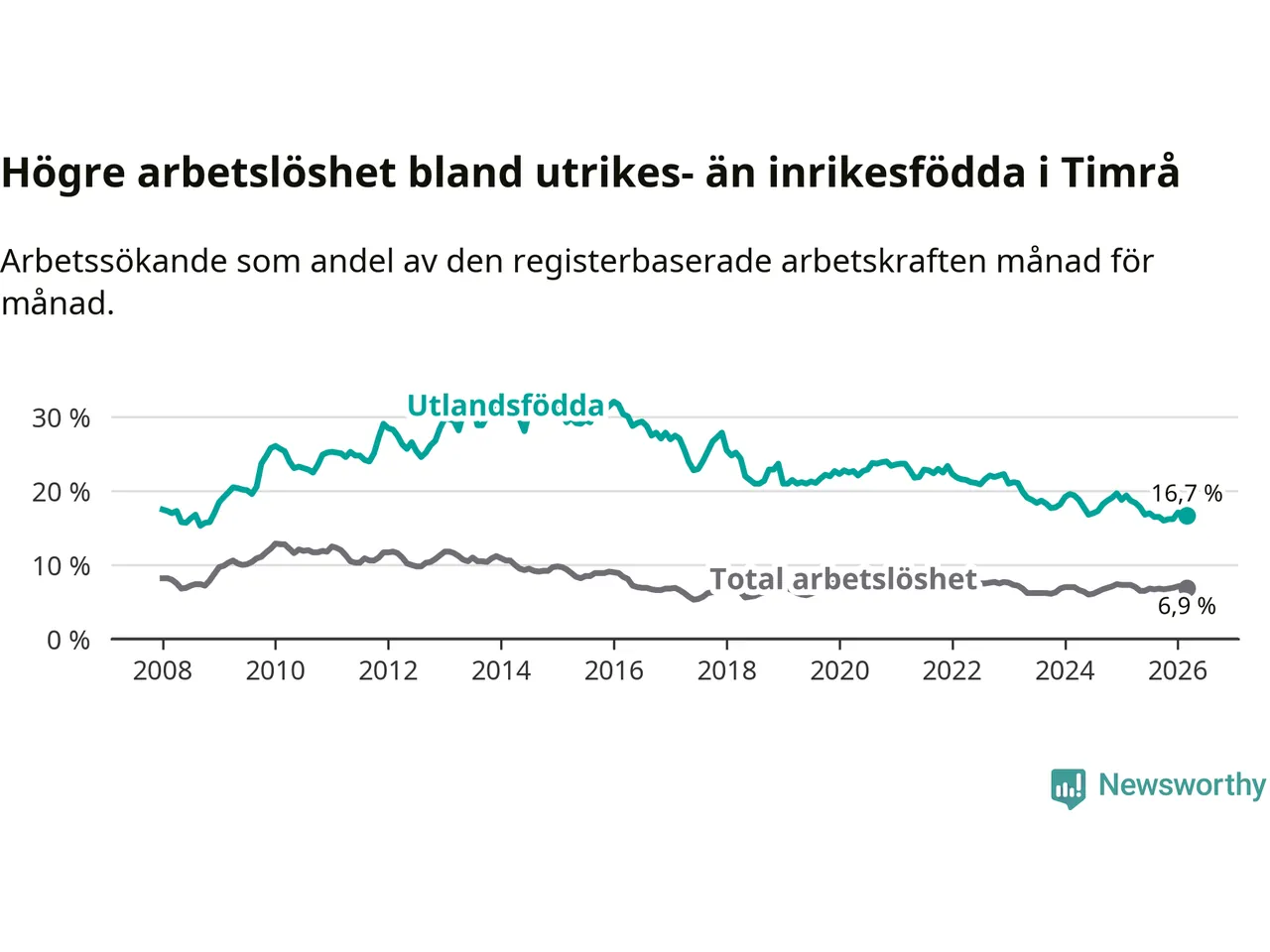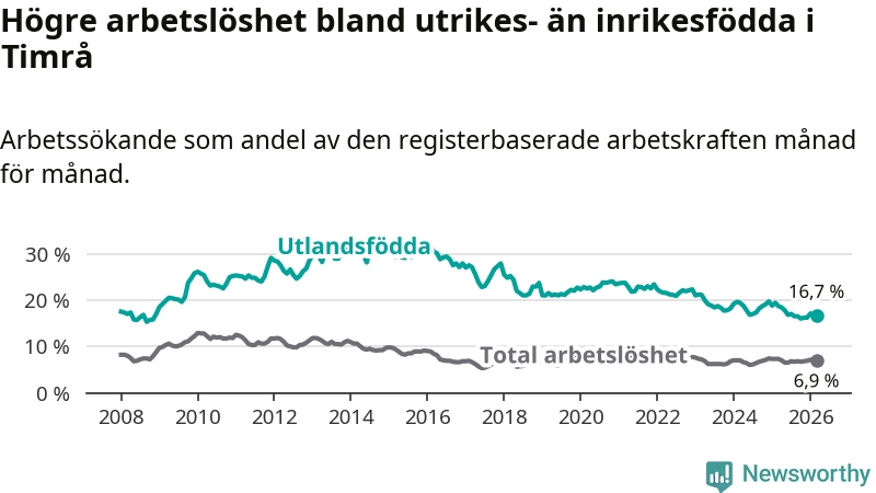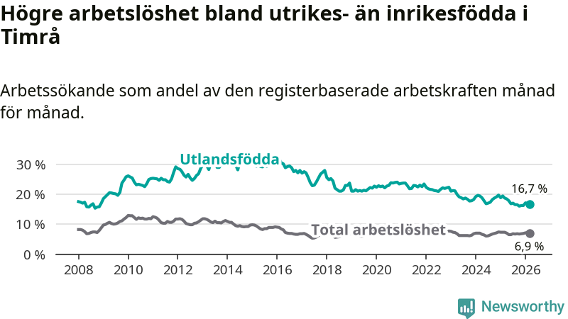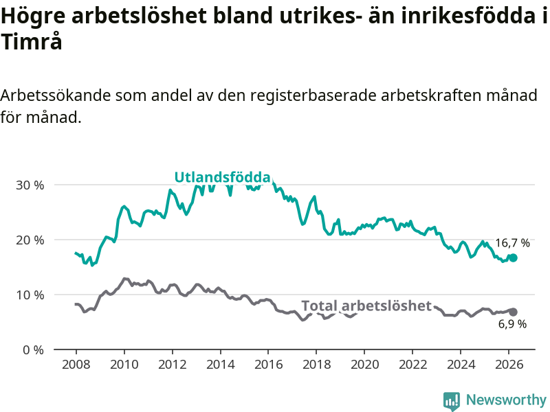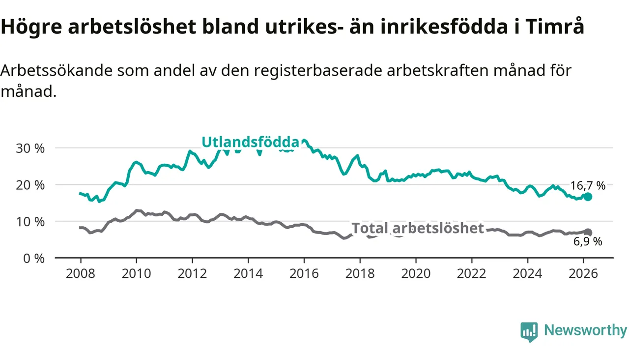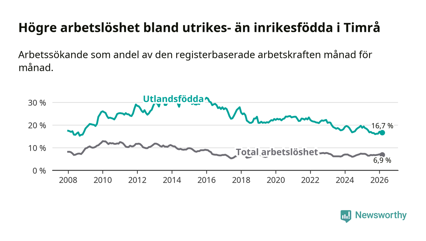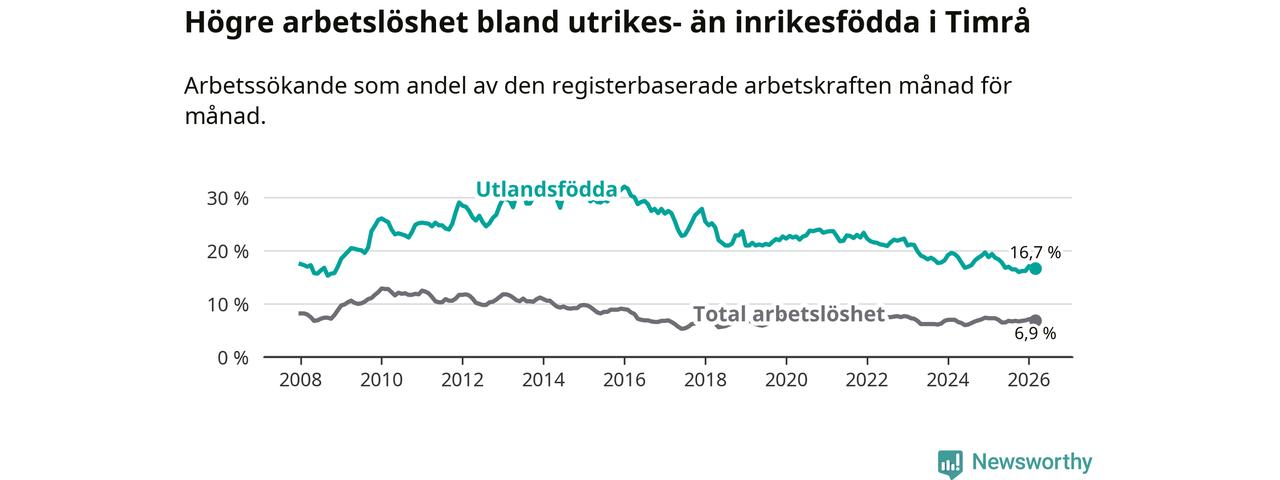 Skillnaden i arbetslöshet mellan utrikesfödda och hela befolkningen är 9,8 procentenheter i Timrå. Det är en betydligt mindre skillnad än för ett år sedan (−1,6 procentenheter).