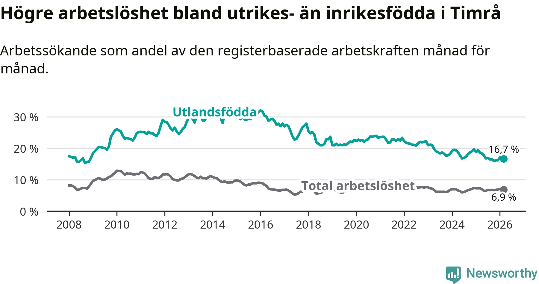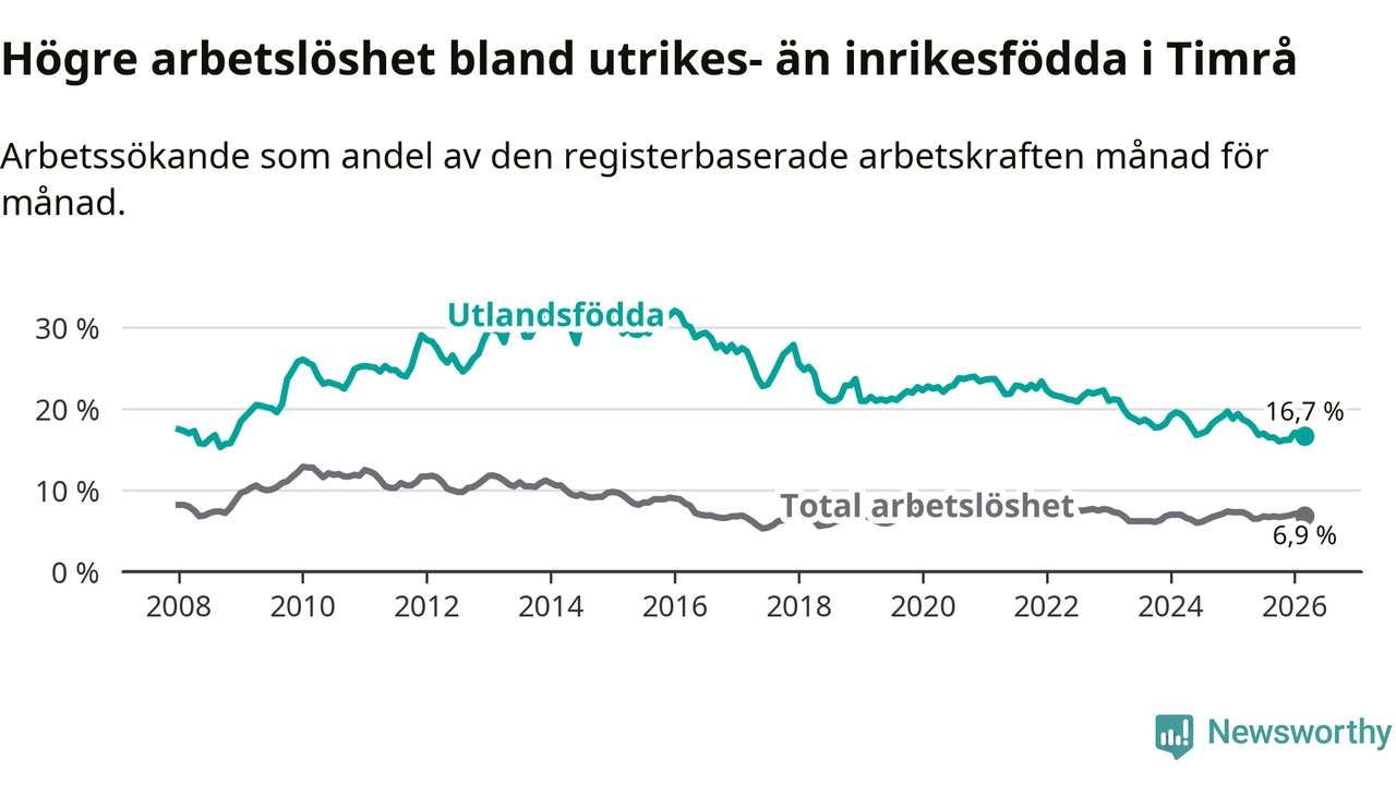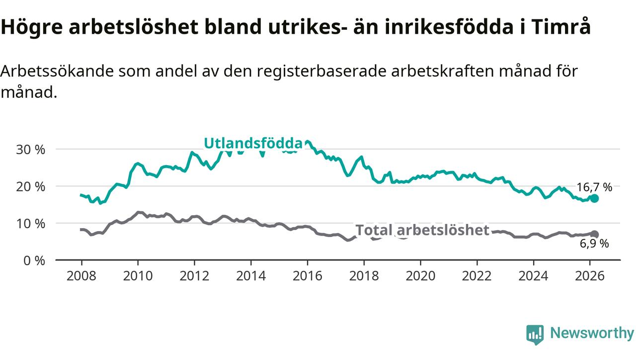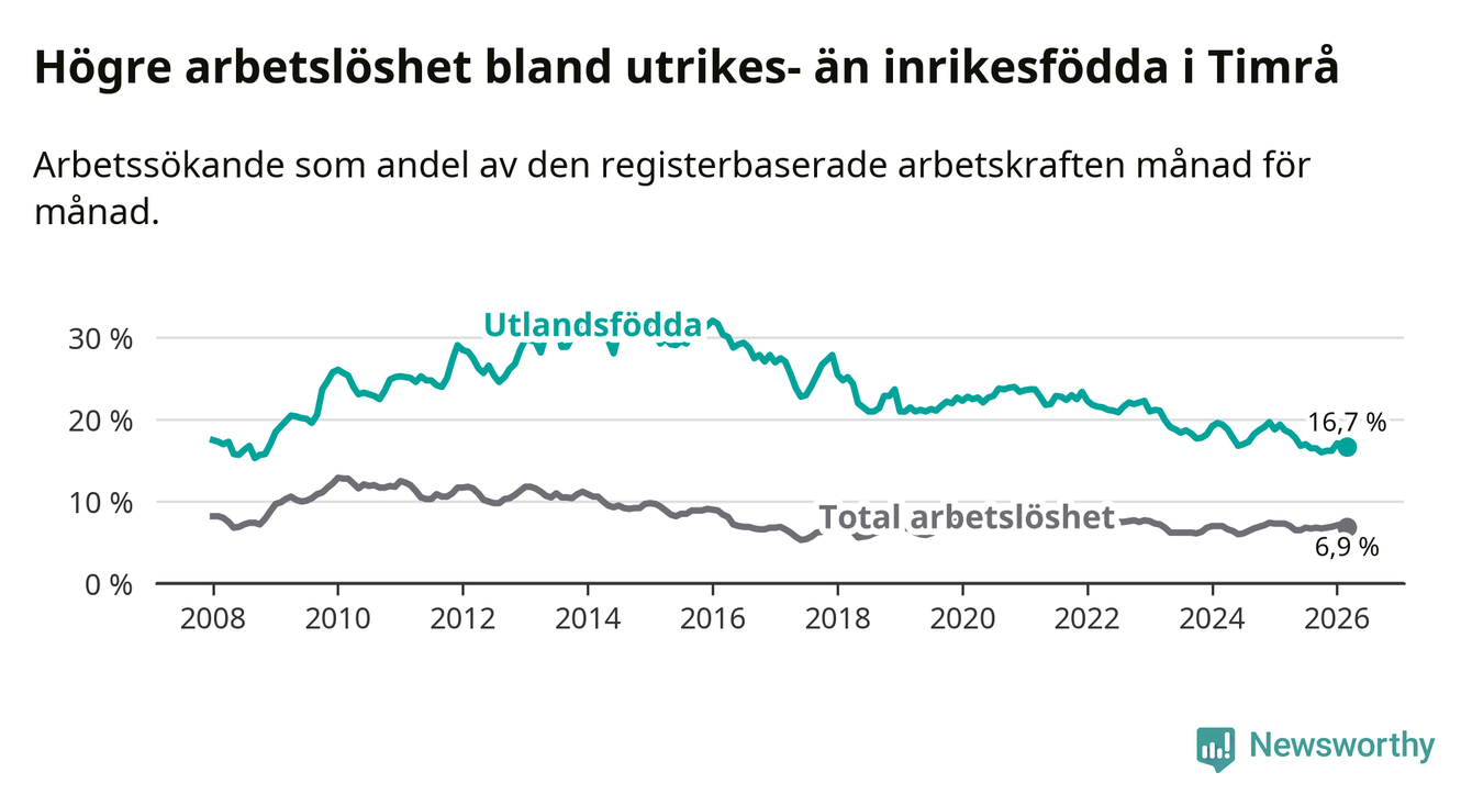 Arbetslösheten bland utlandsfödda var 16,7 procent i Timrå under mars månad, motsvarande 181 av 1 084 personer. Det är 2,0 procentenheter färre än vid samma tidpunkt i fjol (−22 om man räknar personer). Därmed är de utlandsföddas arbetslöshet lägre än vid samma tidpunkt i fjol för åttonde månaden i följd.