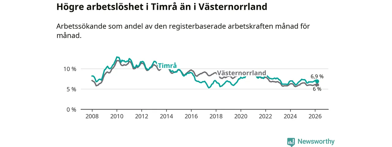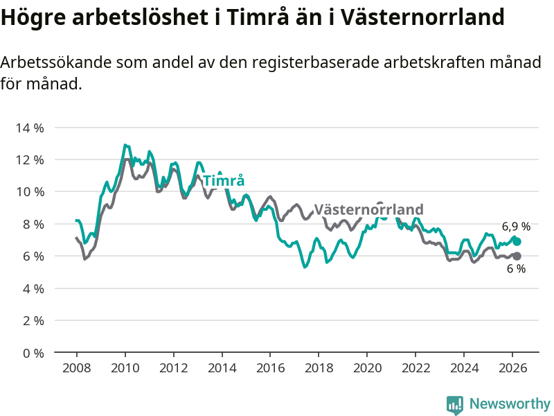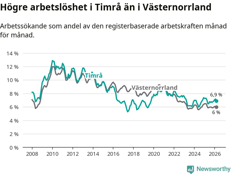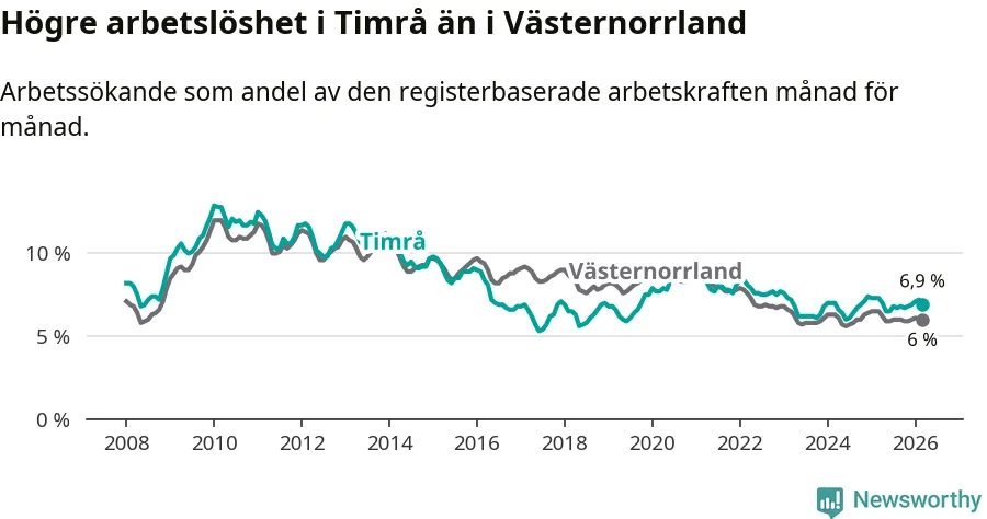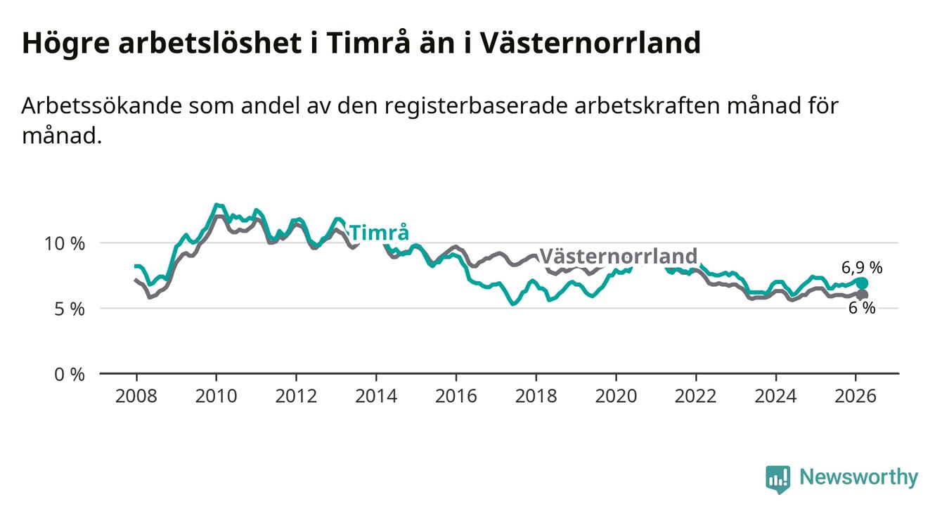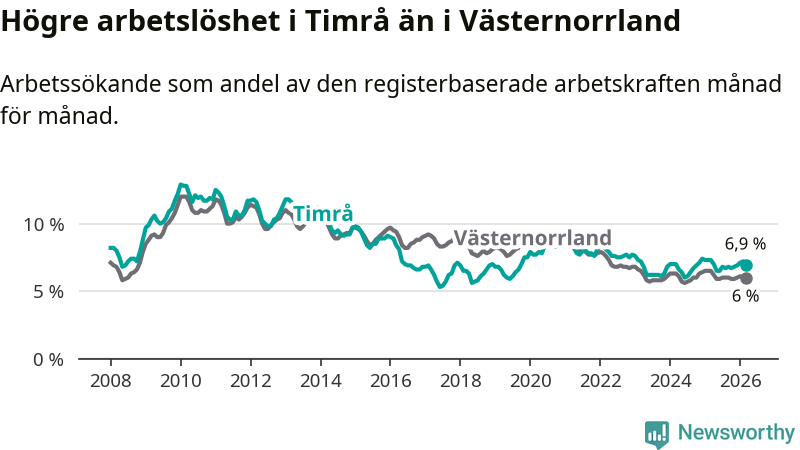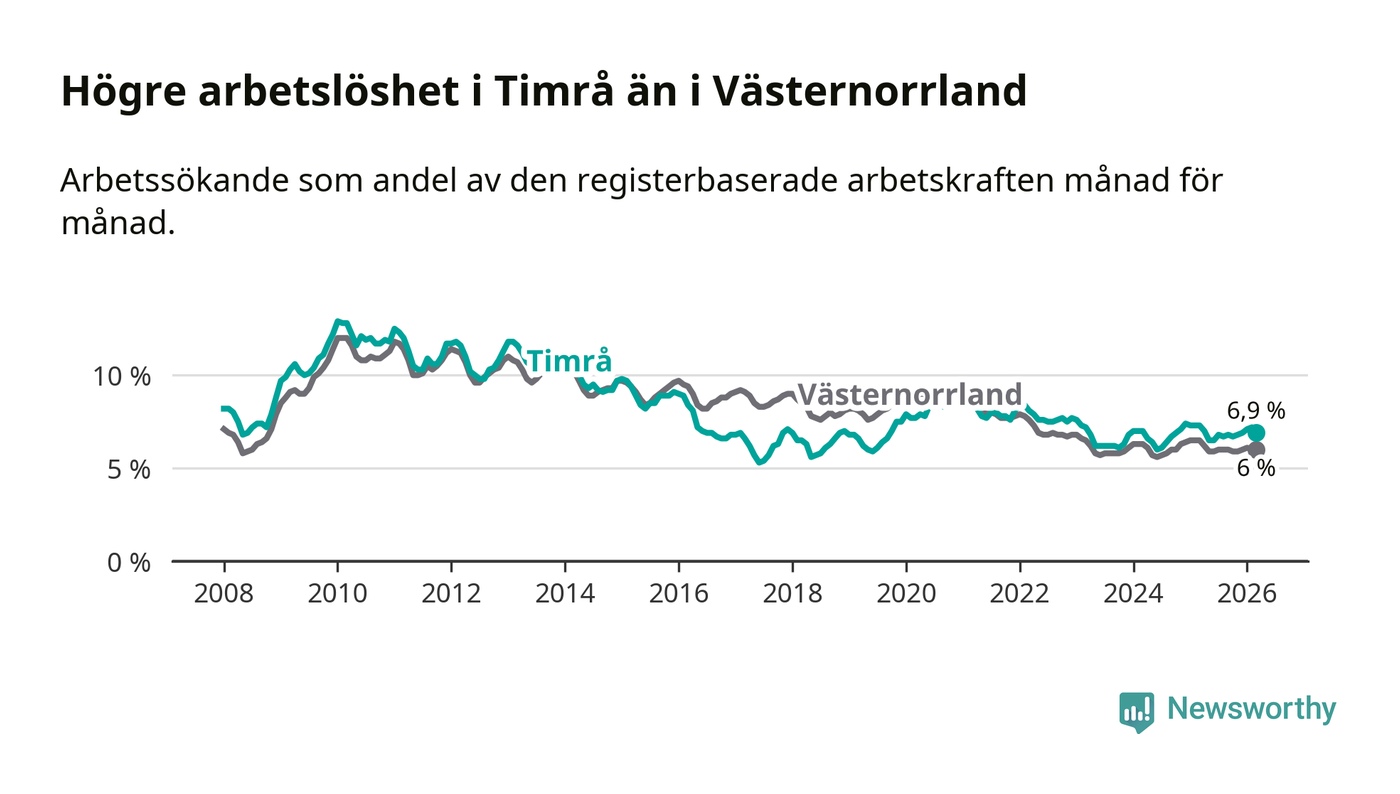 i hela Västernorrlands län (6,9 procent i kommunen, jämfört med 6,0 procent i hela länet). Örnsköldsvik har den lägsta arbetslösheten i länet (5,2 procent), medan Härnösand har den högsta (8,0 procent). För att Timrå skulle komma ner i samma arbetslöshetsnivå som Örnsköldsvik skulle 147 personer behöva sysselsättas.