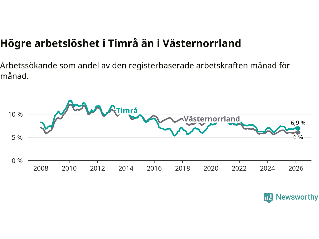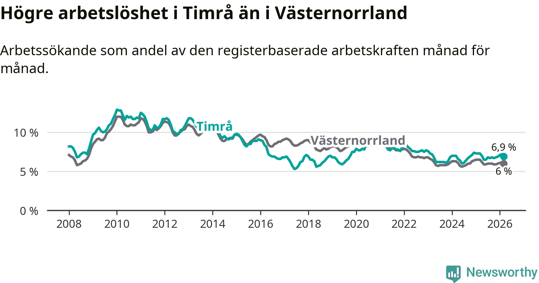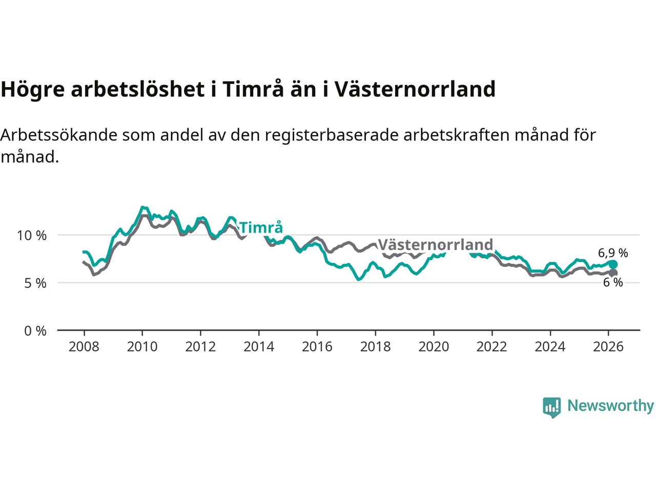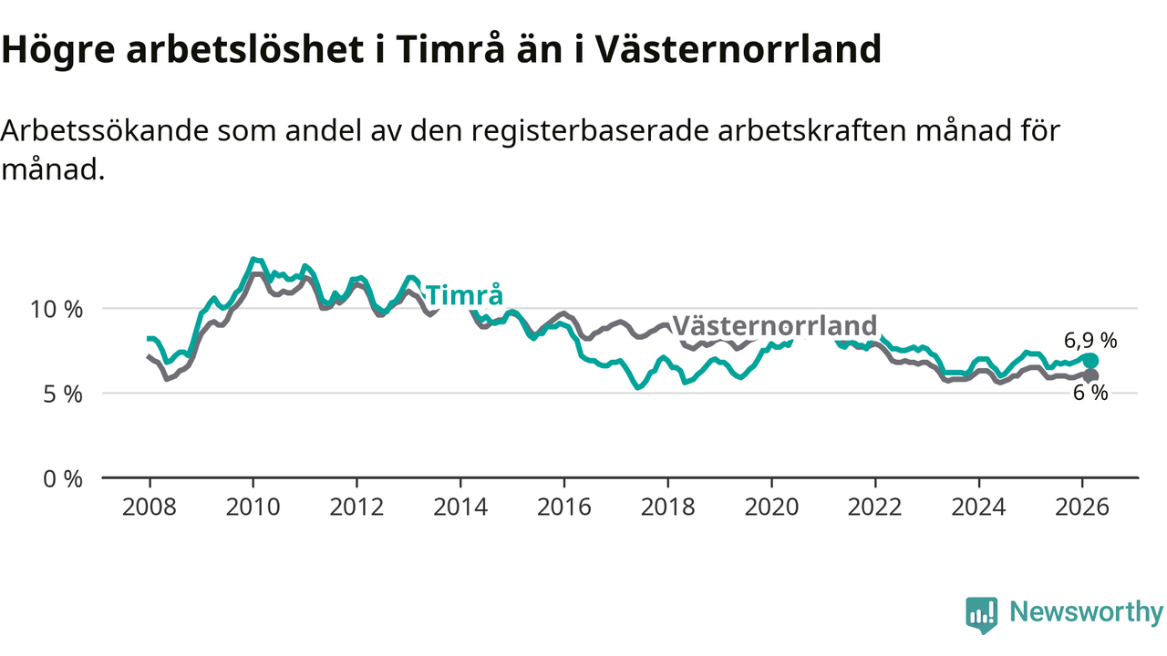 i hela Västernorrlands län (6,9 procent i kommunen, jämfört med 6,0 procent i hela länet). Örnsköldsvik har den lägsta arbetslösheten i länet (5,2 procent), medan Härnösand har den högsta (8,0 procent). För att Timrå skulle komma ner i samma arbetslöshetsnivå som Örnsköldsvik skulle 147 personer behöva sysselsättas.