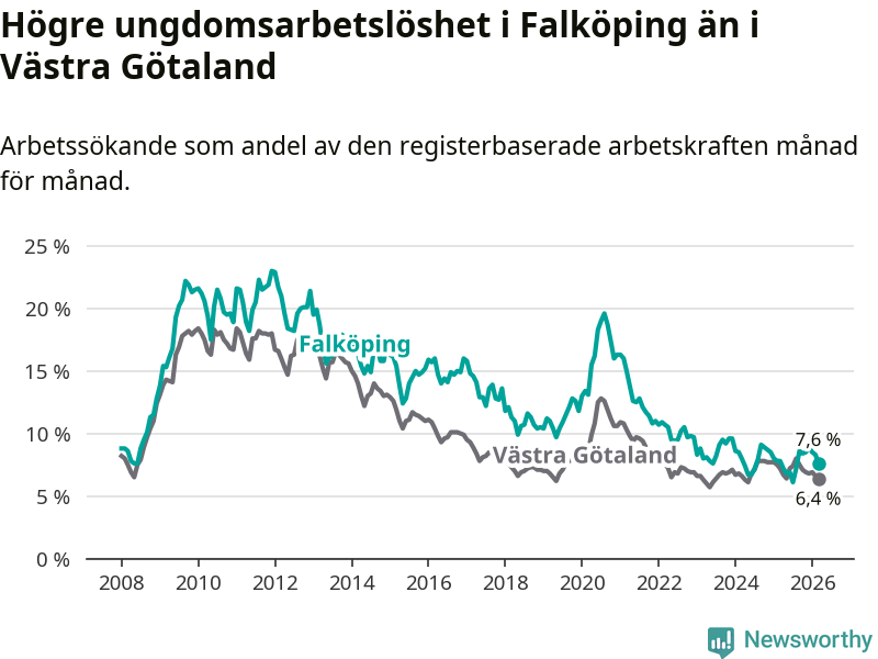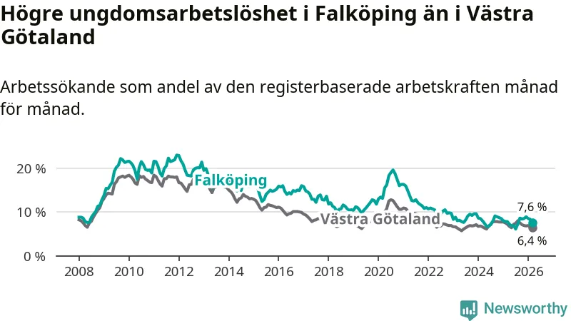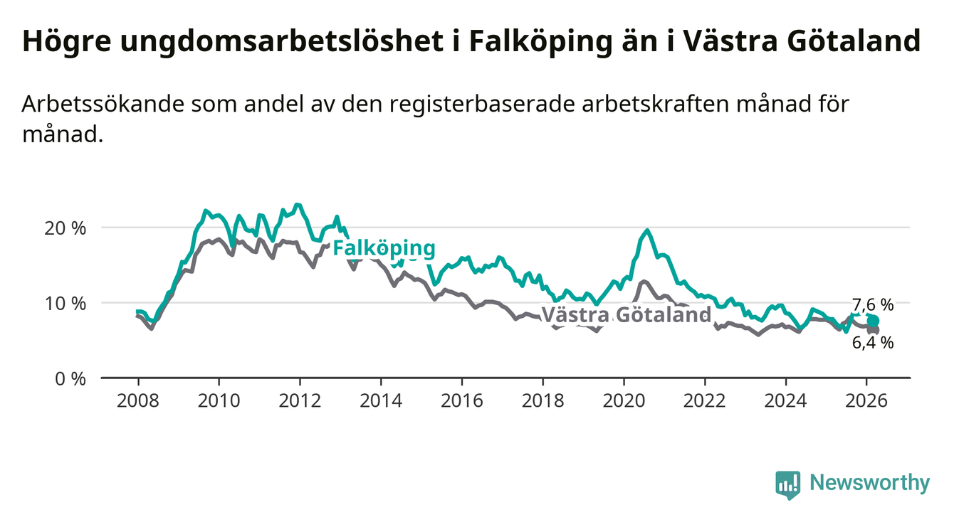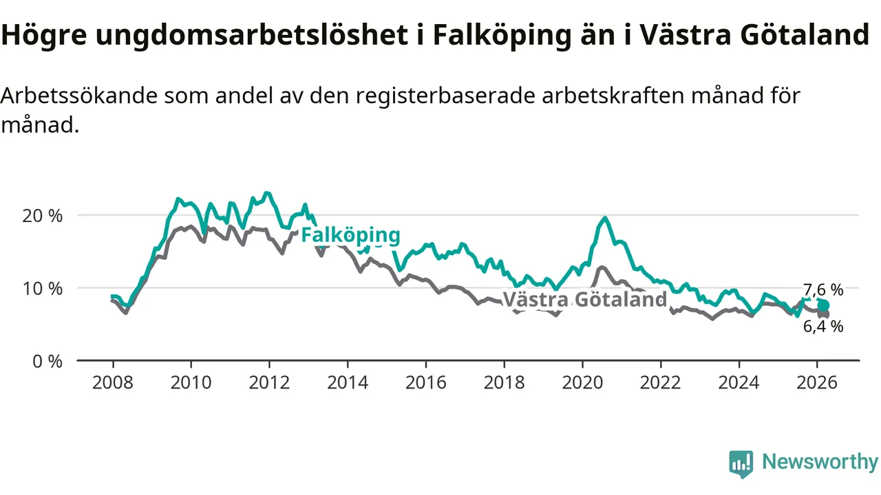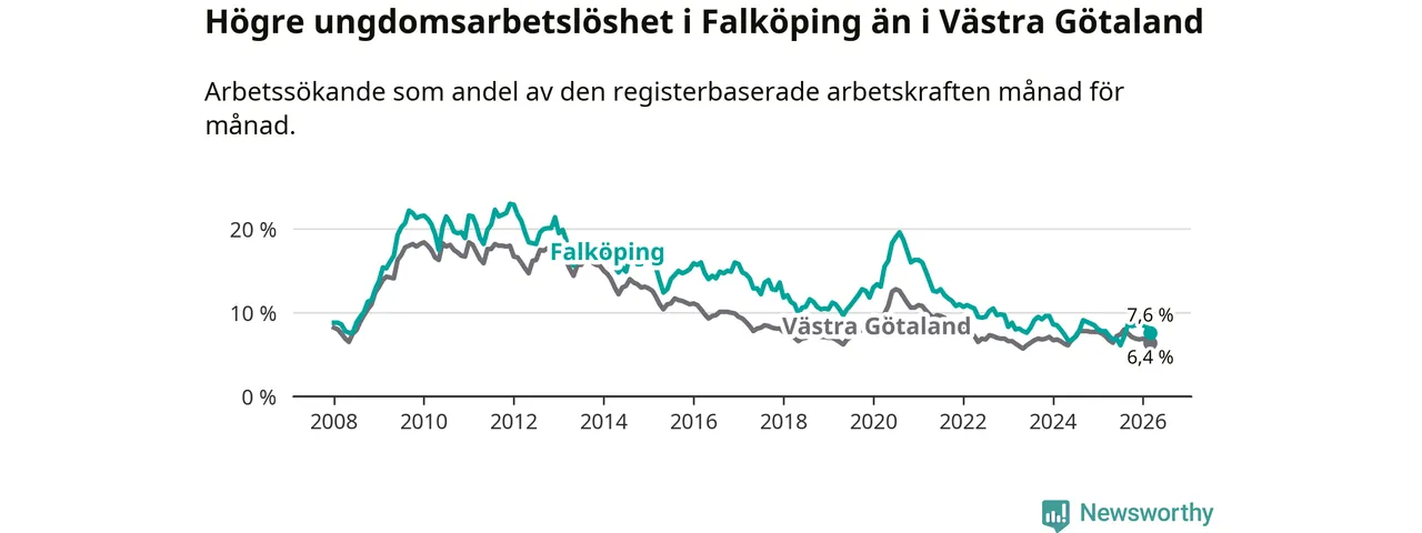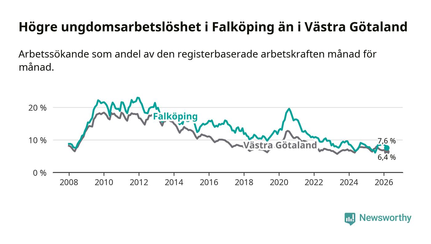 Graf: Arbetslöshet bland unga i Falköpings kommun och Västra Götalands län