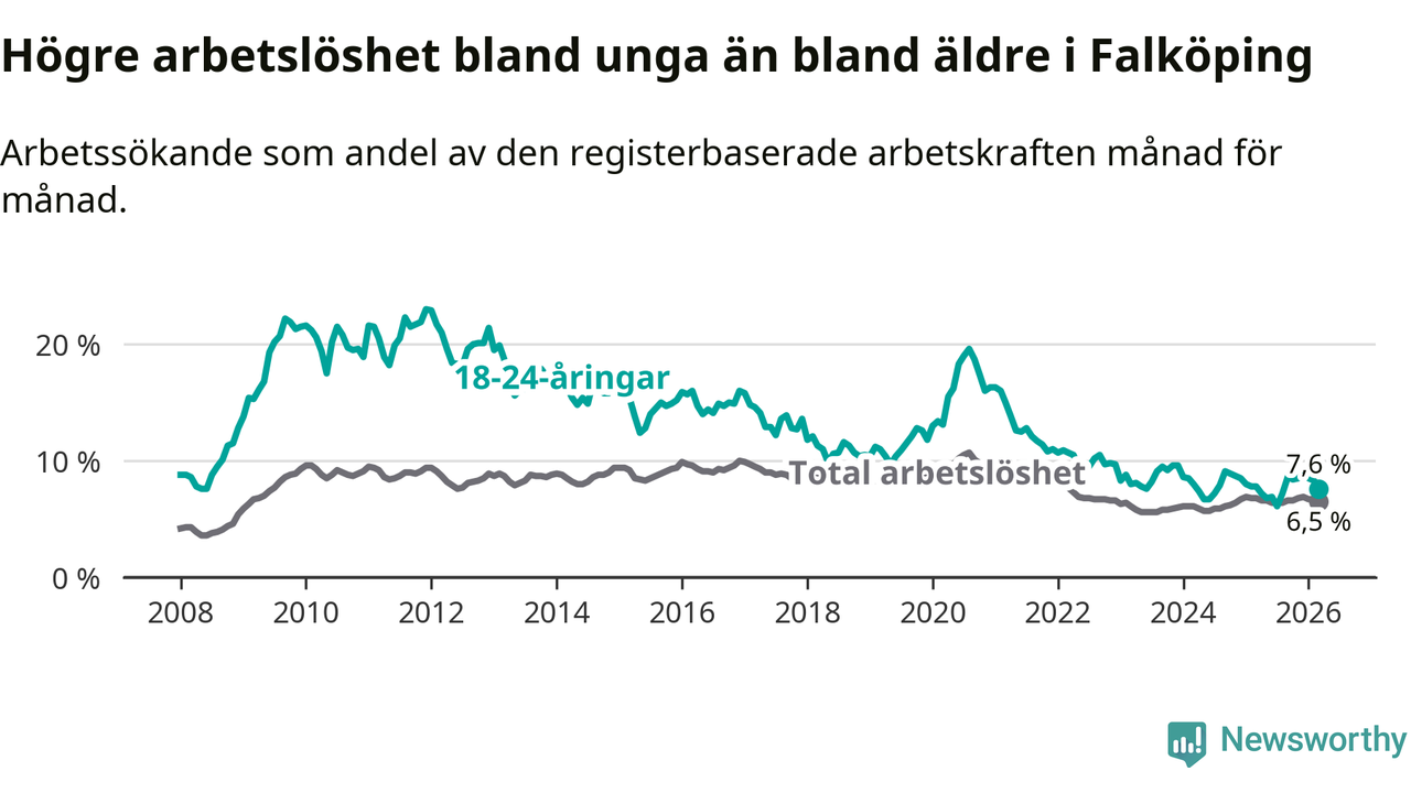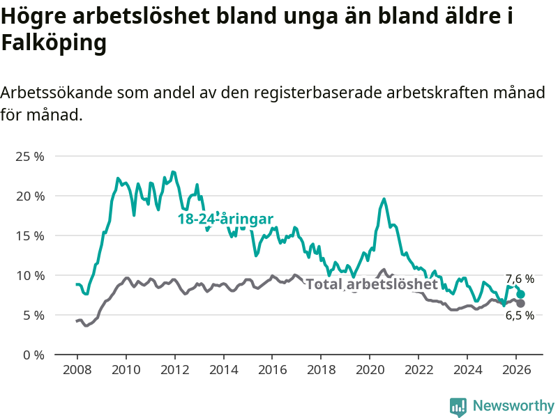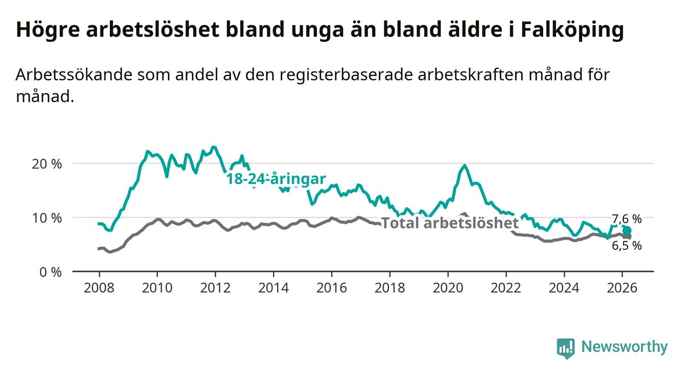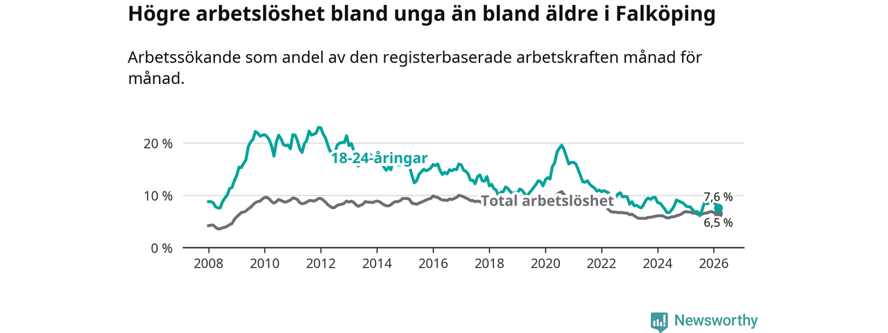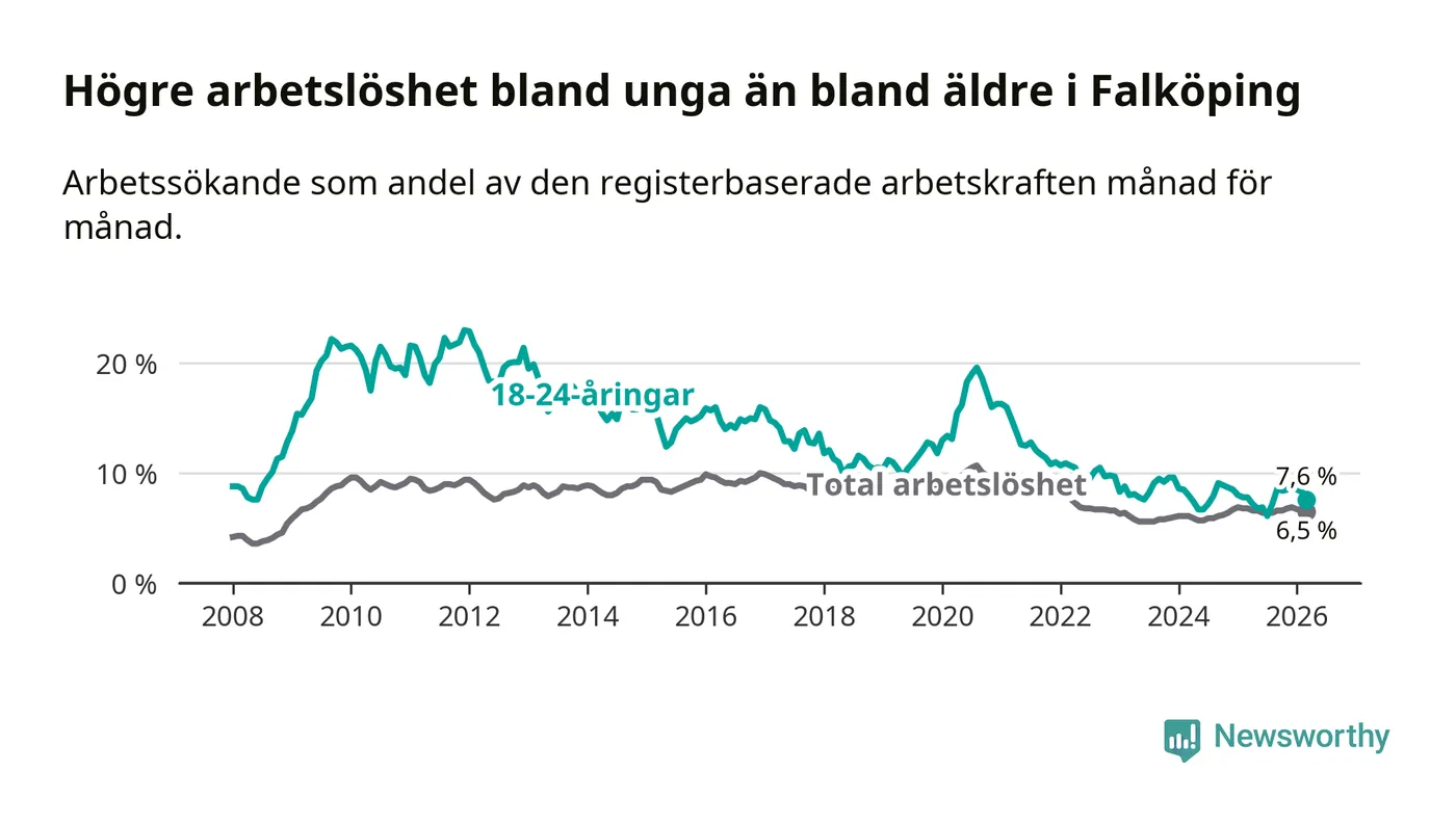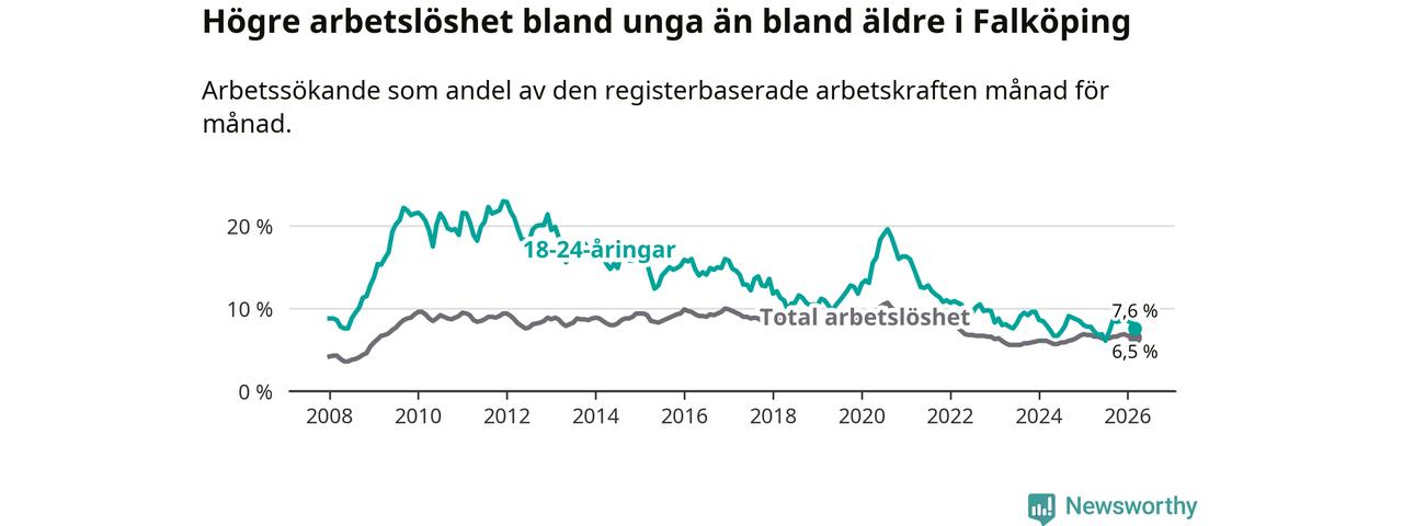 Graf: Arbetslöshet bland unga i Falköpings kommun och Västra Götalands län