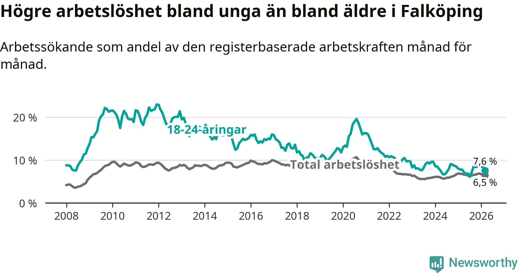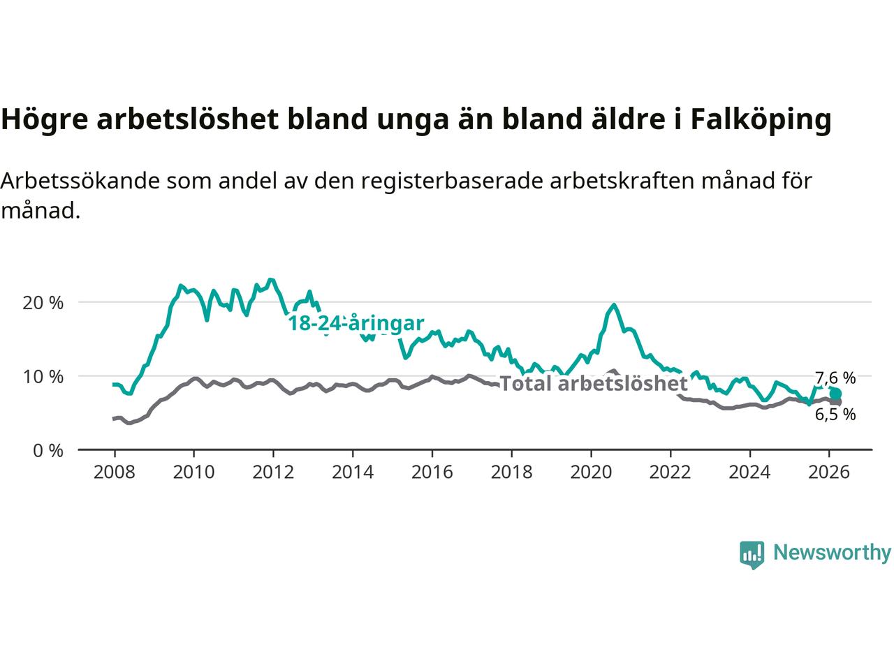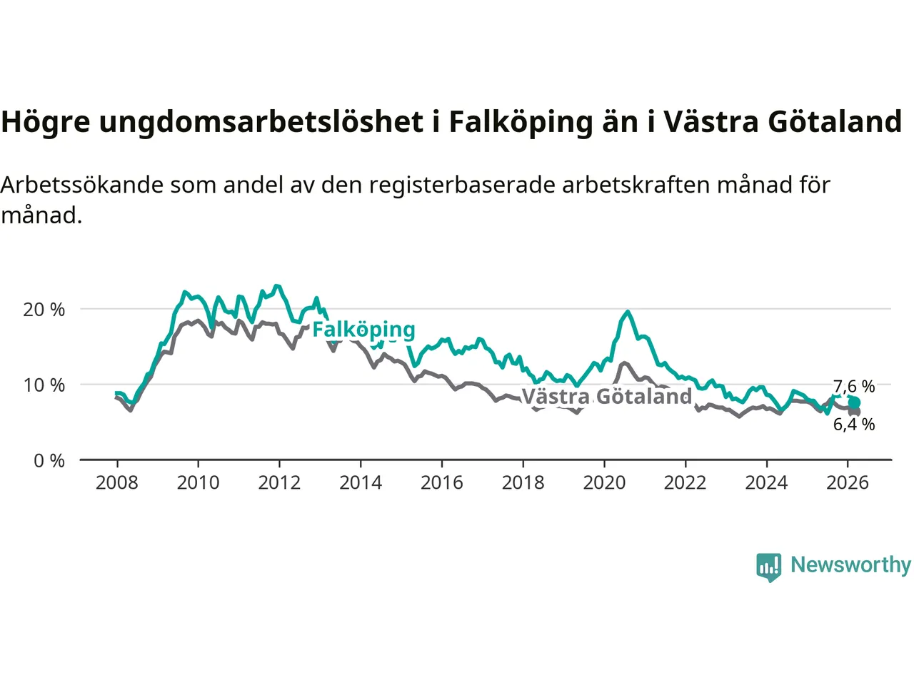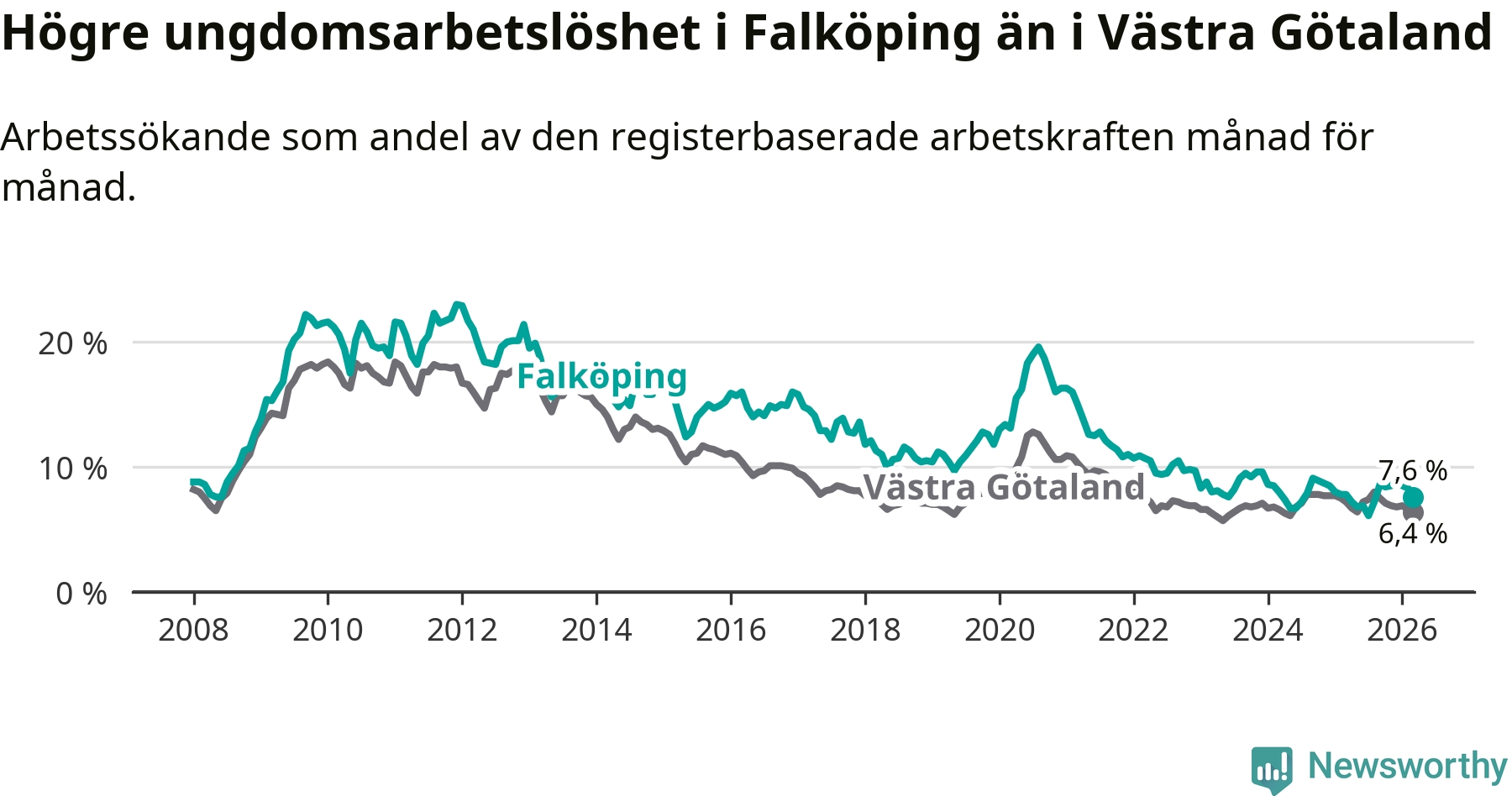 Graf: Arbetslöshet bland unga i Falköpings kommun och Västra Götalands län