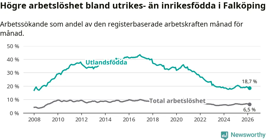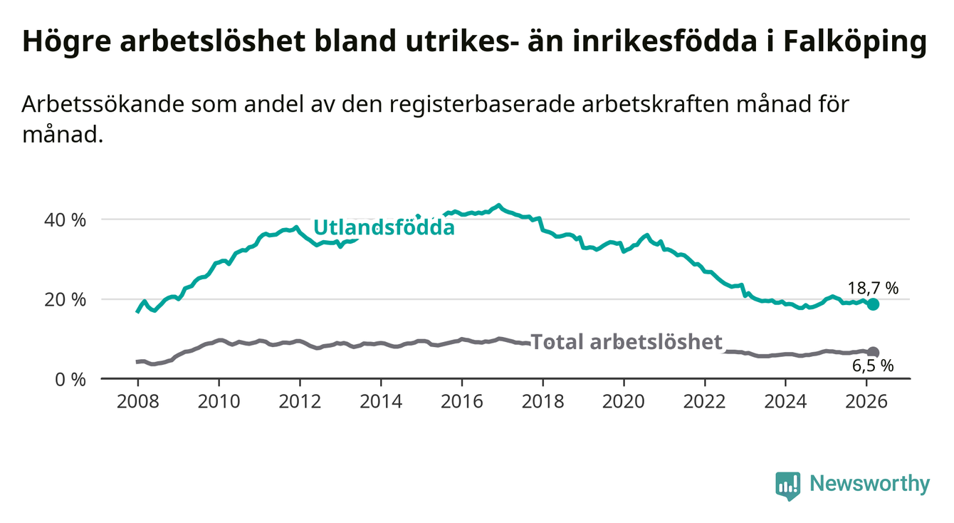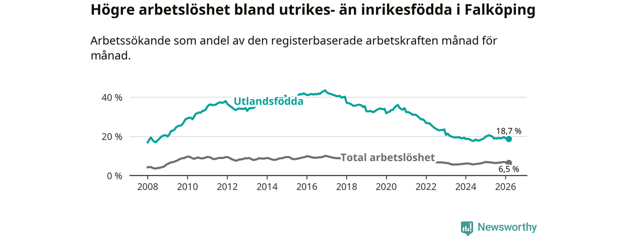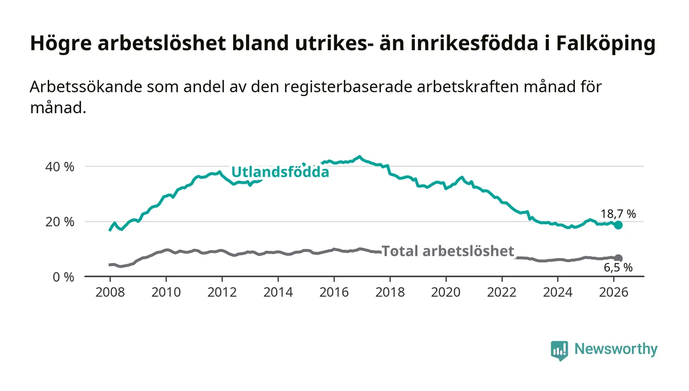 Skillnaden i arbetslöshet mellan utrikesfödda och hela befolkningen är 12,2 procentenheter i Falköping. Det är en betydligt mindre skillnad än för ett år sedan (−1,6 procentenheter).